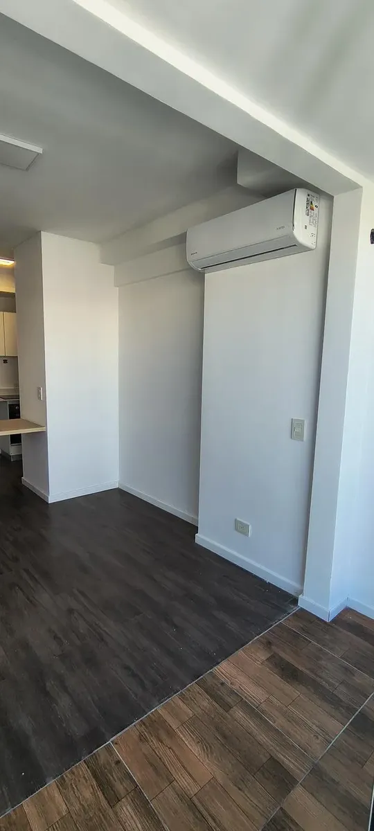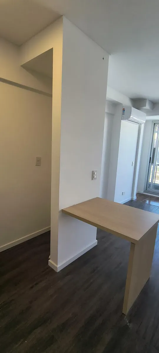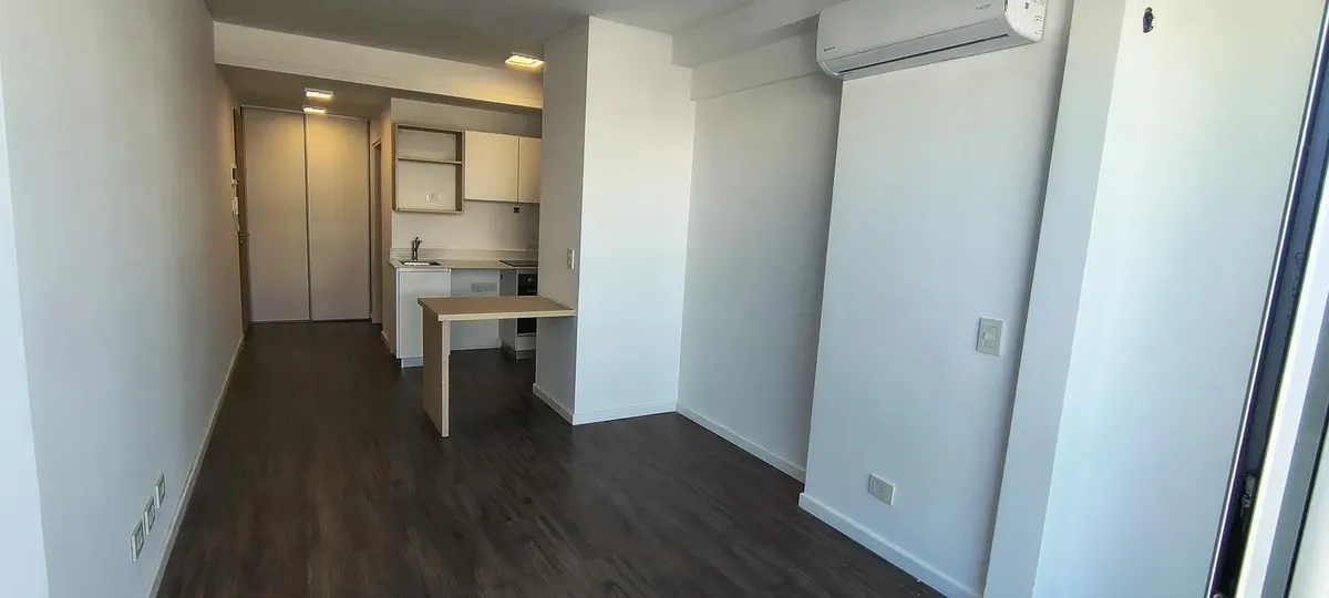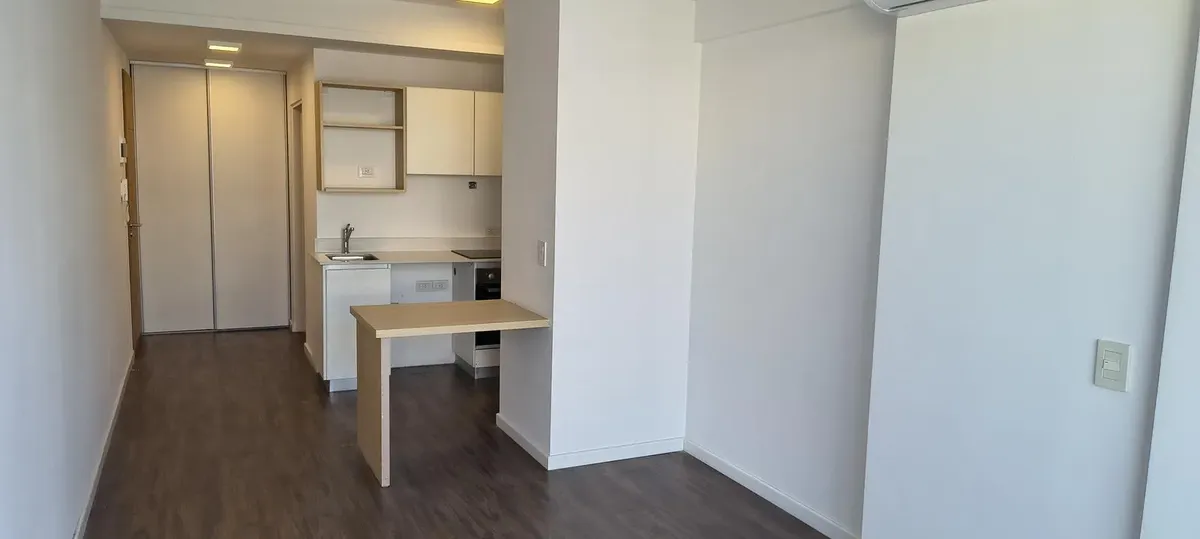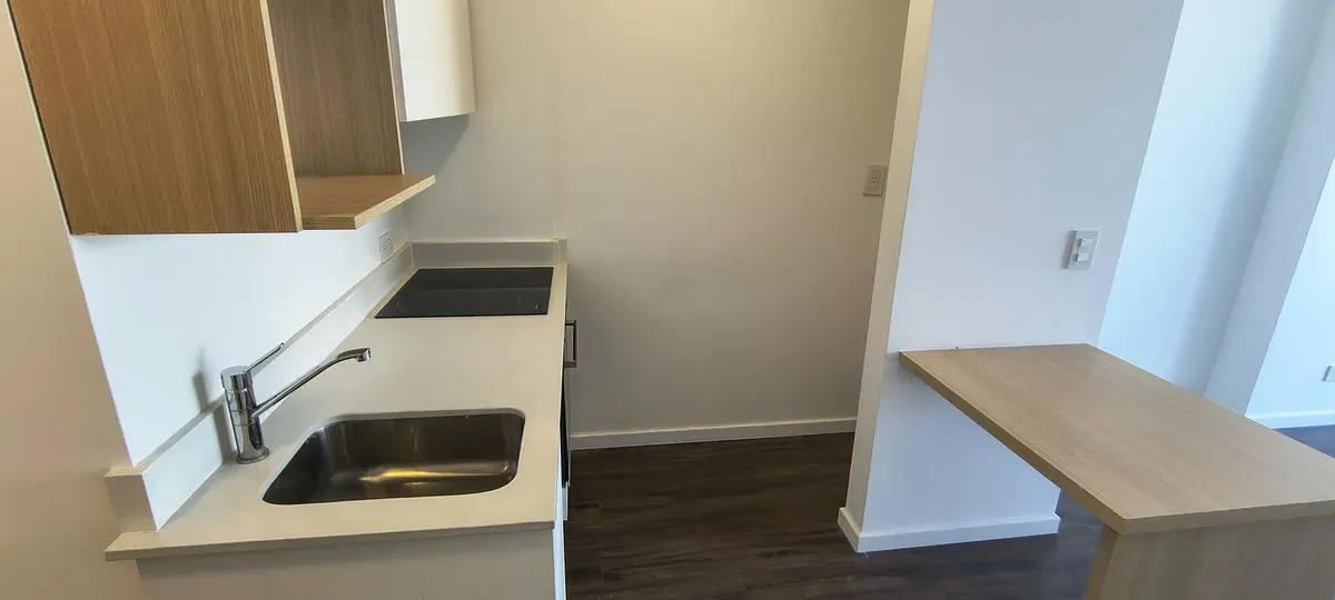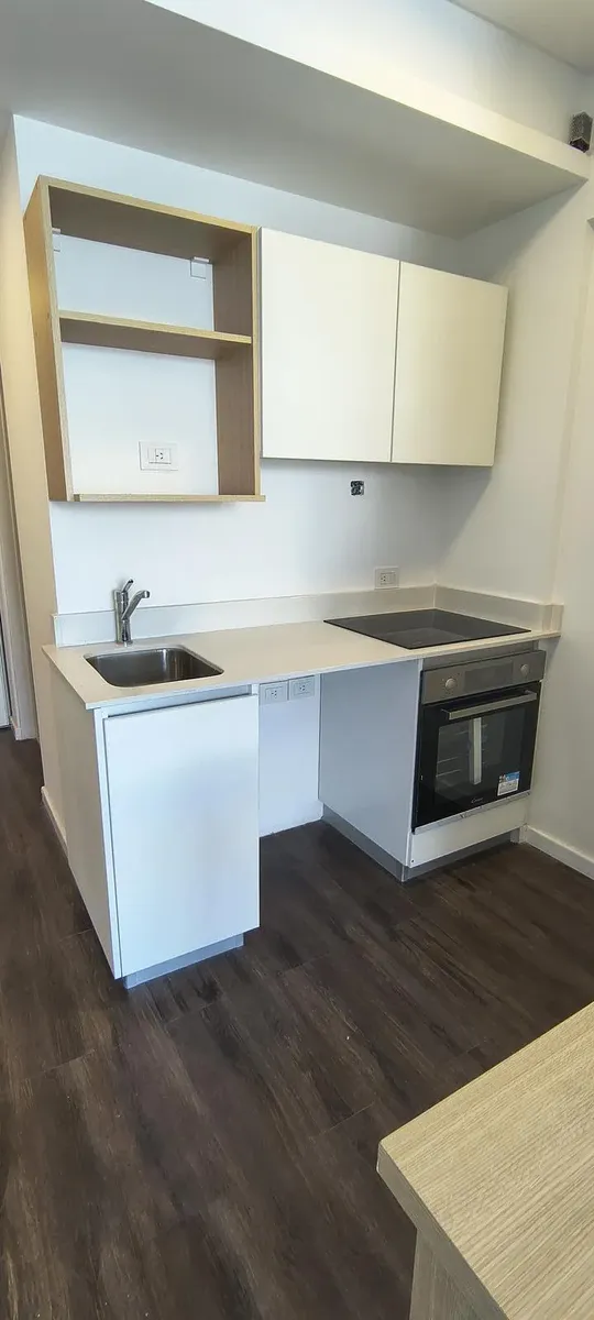 Kitnet (studio) novo, no alto, de frente para a rua, com varanda e vista panorâmica. O imóvel tem hall de entrada de 1,8 m x 1,3 m com armário, ambiente principal de 6 m x 3 m com saída para varanda de 3 m x 1 m, e cozinha integrada separada por uma bancada. Inclui mobília completa, balcão em Siletone, espaço para geladeira e lavadora, cooktop vitrocerâmico e forno elétrico, além de banheiro completo com bancada em Silestone e revestimento em porcelanato. O prédio tem SUM no térreo, terraço com
