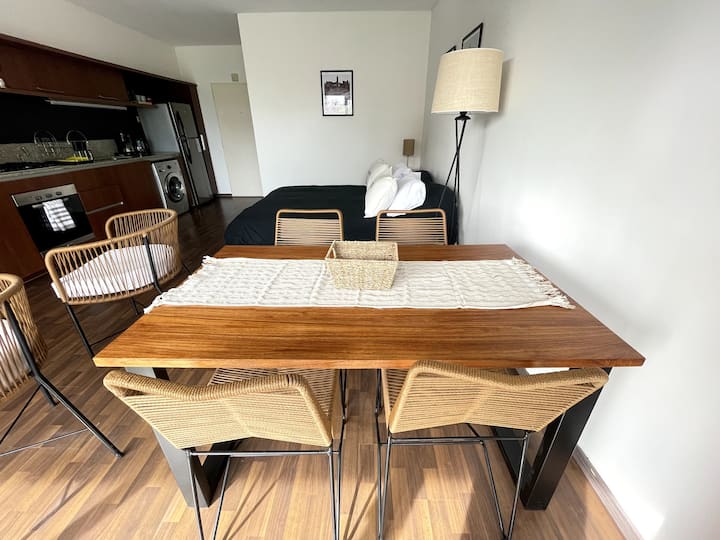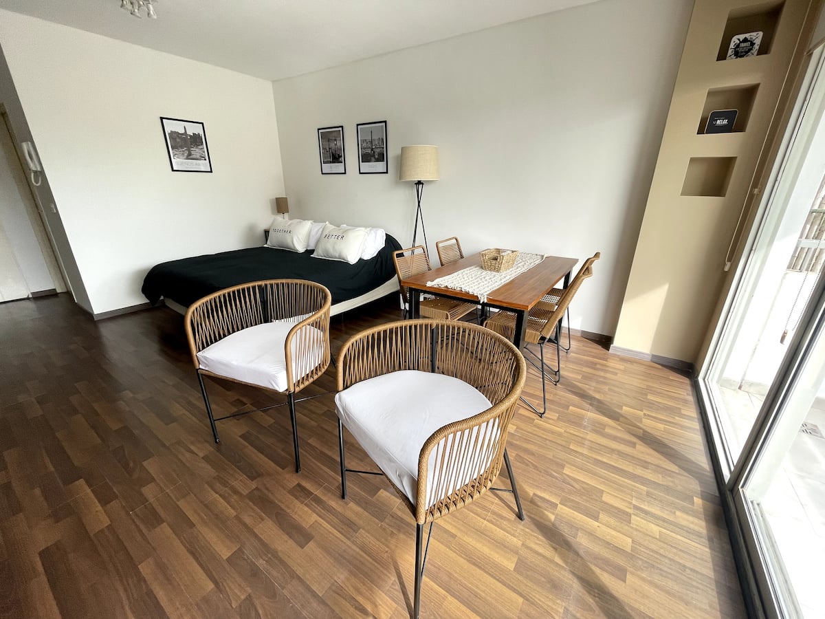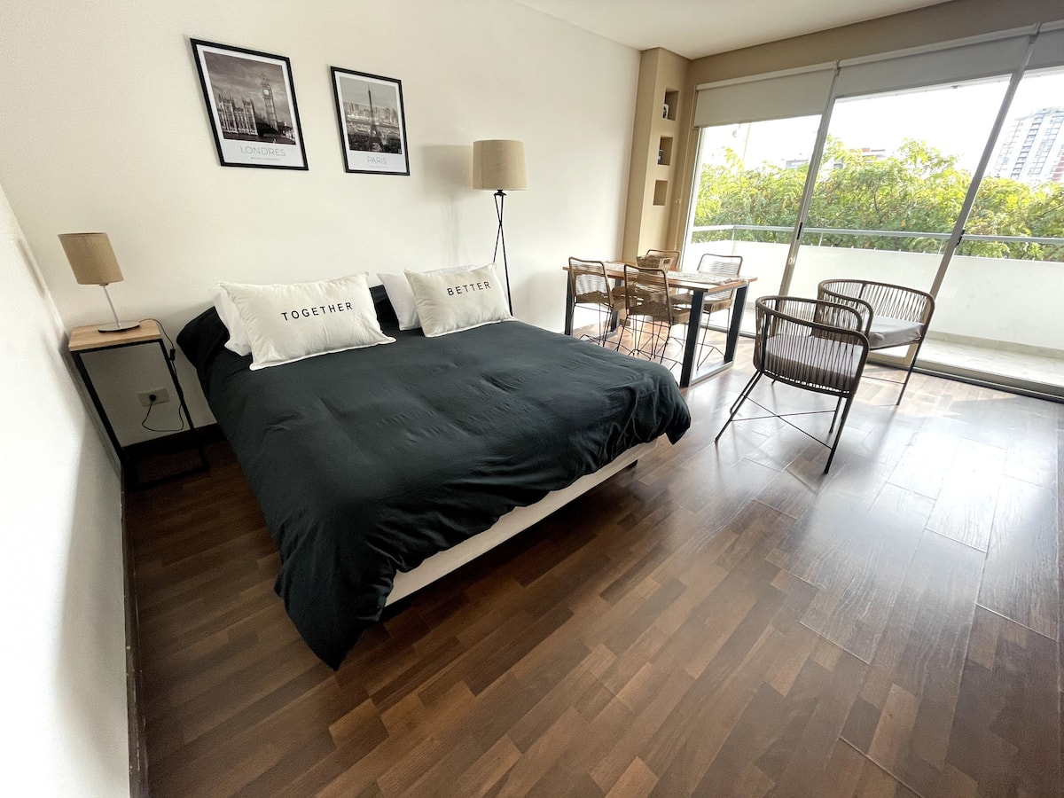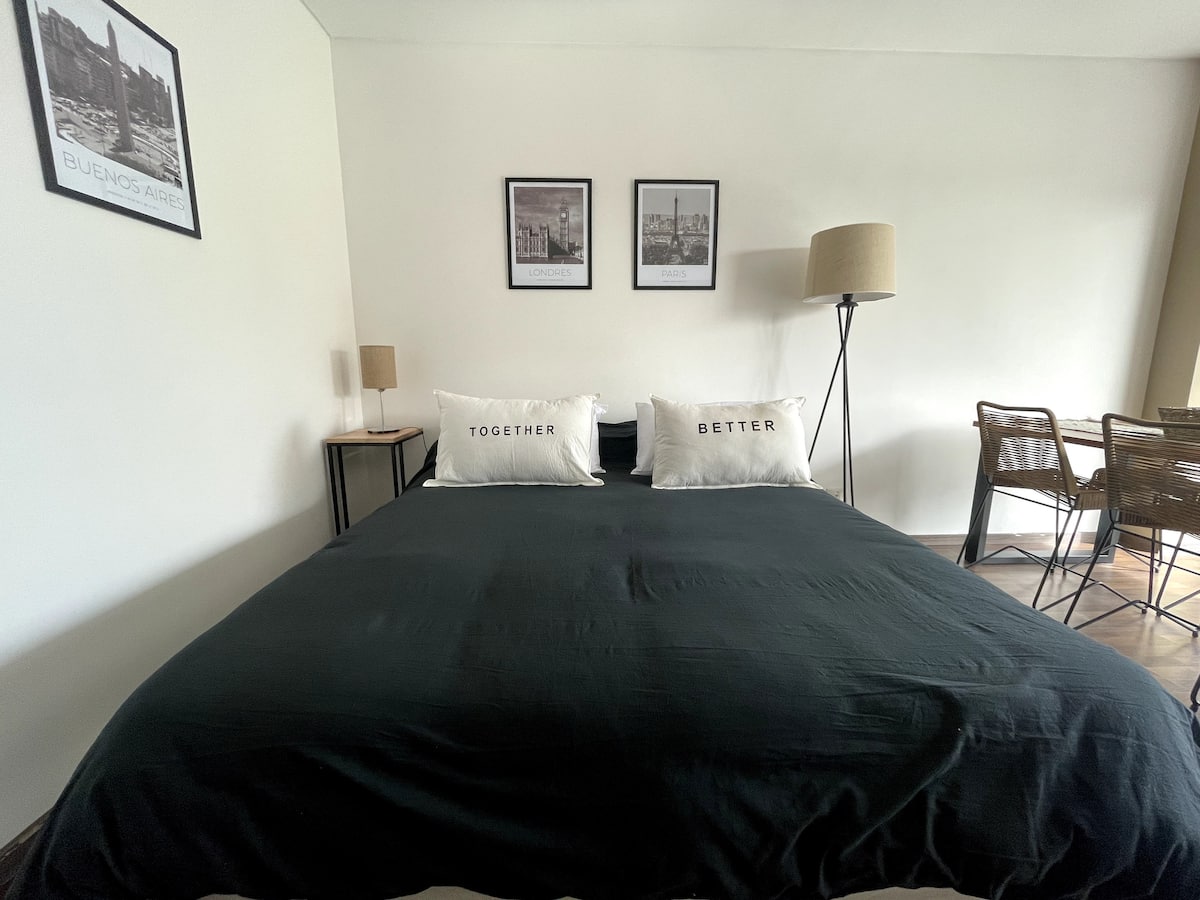 Studio com grande metragem em Belgrano. Mobiliado e equipado, com cama de casal, ar-condicionado frio e quente, Smart TV, mesa de jantar com 4 cadeiras e louça completa. Inclui máquina de lavar e acesso fácil por carro, ônibus ou metrô a partir de diferentes pontos de Buenos Aires.