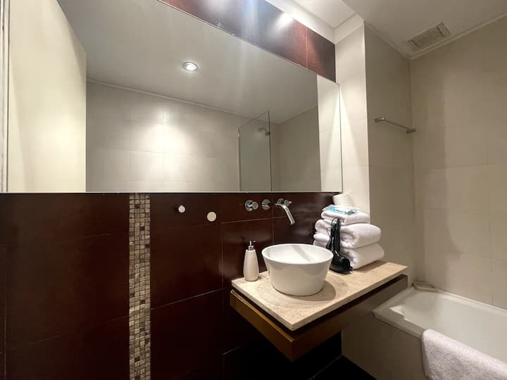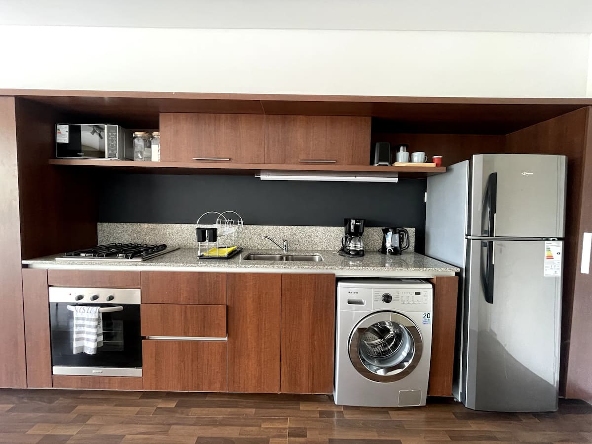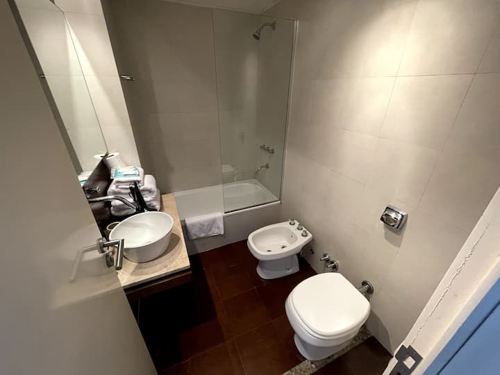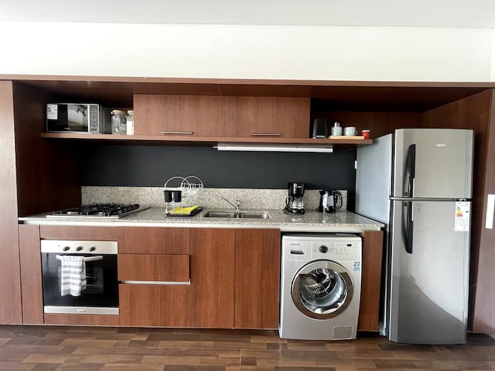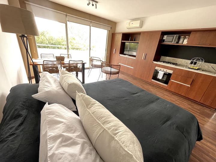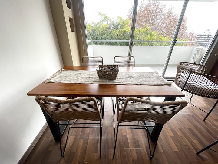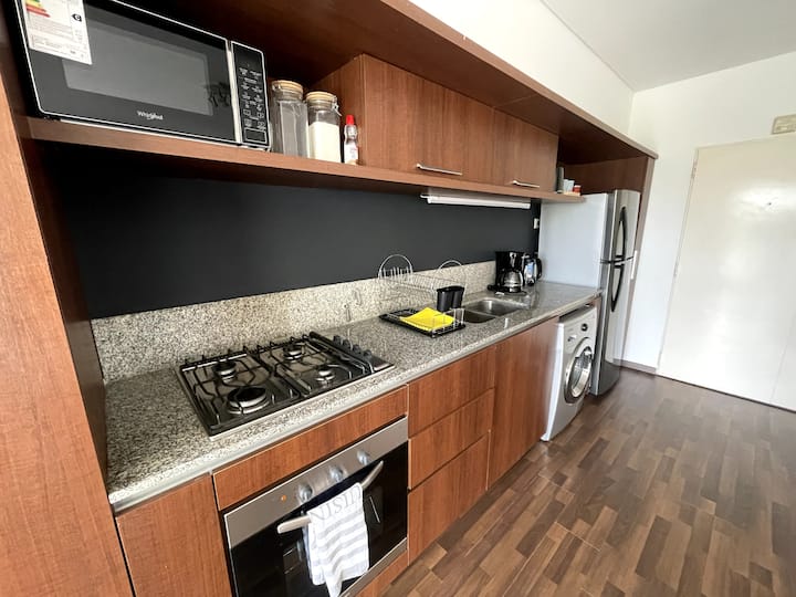 Studio com grande metragem em Belgrano. Mobiliado e equipado, com cama de casal, ar-condicionado frio e quente, Smart TV, mesa de jantar com 4 cadeiras e louça completa. Inclui máquina de lavar e acesso fácil por carro, ônibus ou metrô a partir de diferentes pontos de Buenos Aires.
