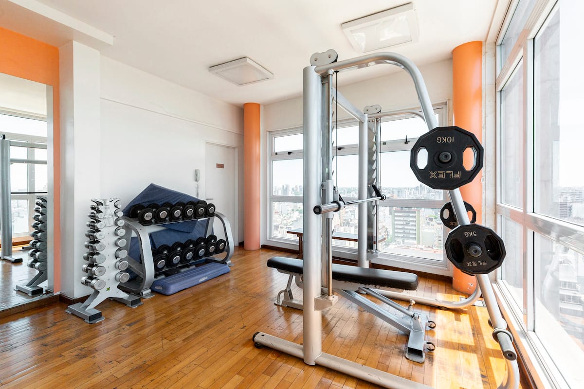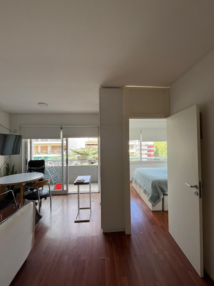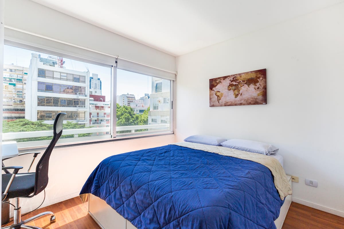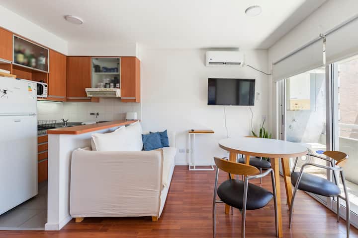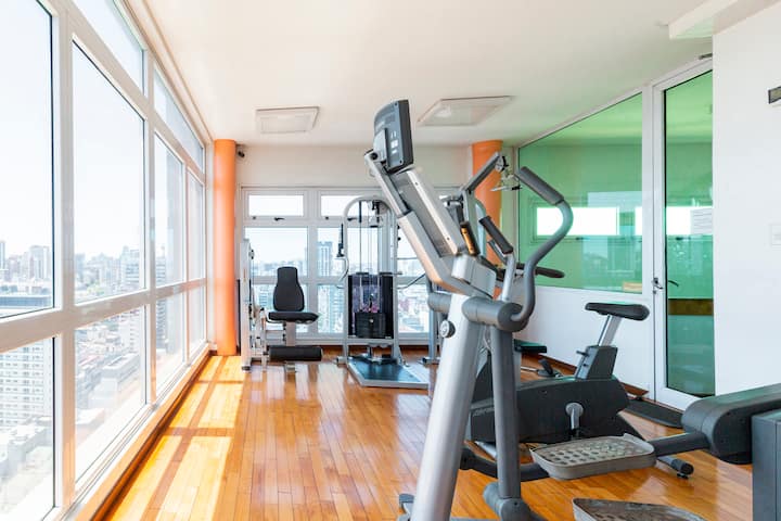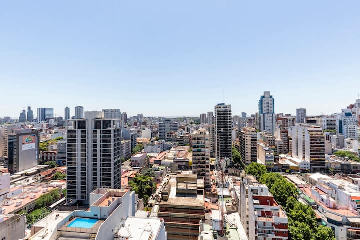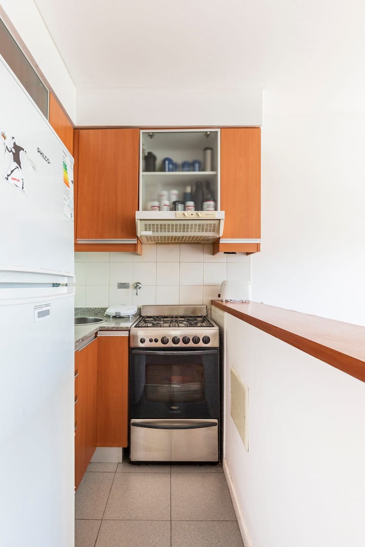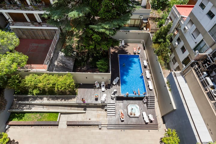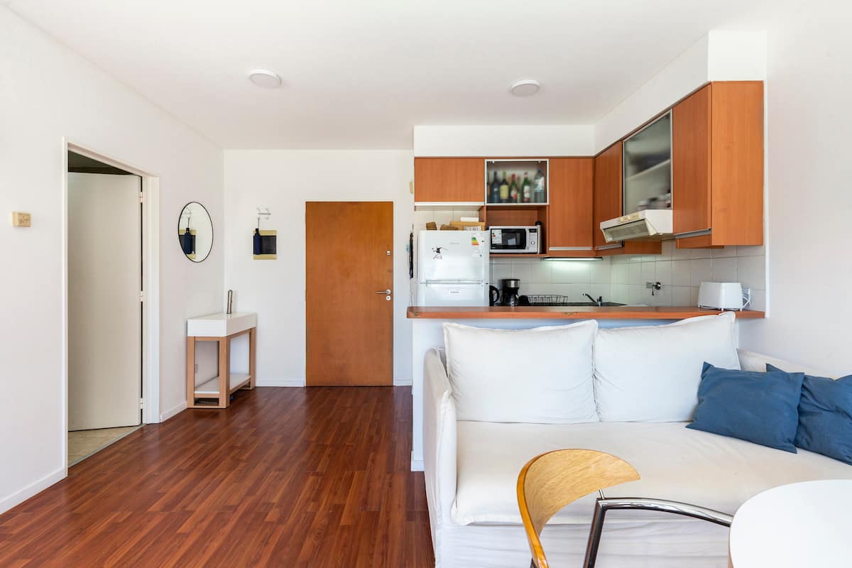 Kitnet em Belgrano, Buenos Aires. O prédio tem segurança 24 horas, piscina, academia e escritório. Fica a 4 quadras da linha D do metrô e a 2 quadras do Metrobus na Avenida Cabildo. O acesso do hóspede é feito com chave na porta e com indicação do apartamento 5F do endereço citado, com elevadores na parte frontal.