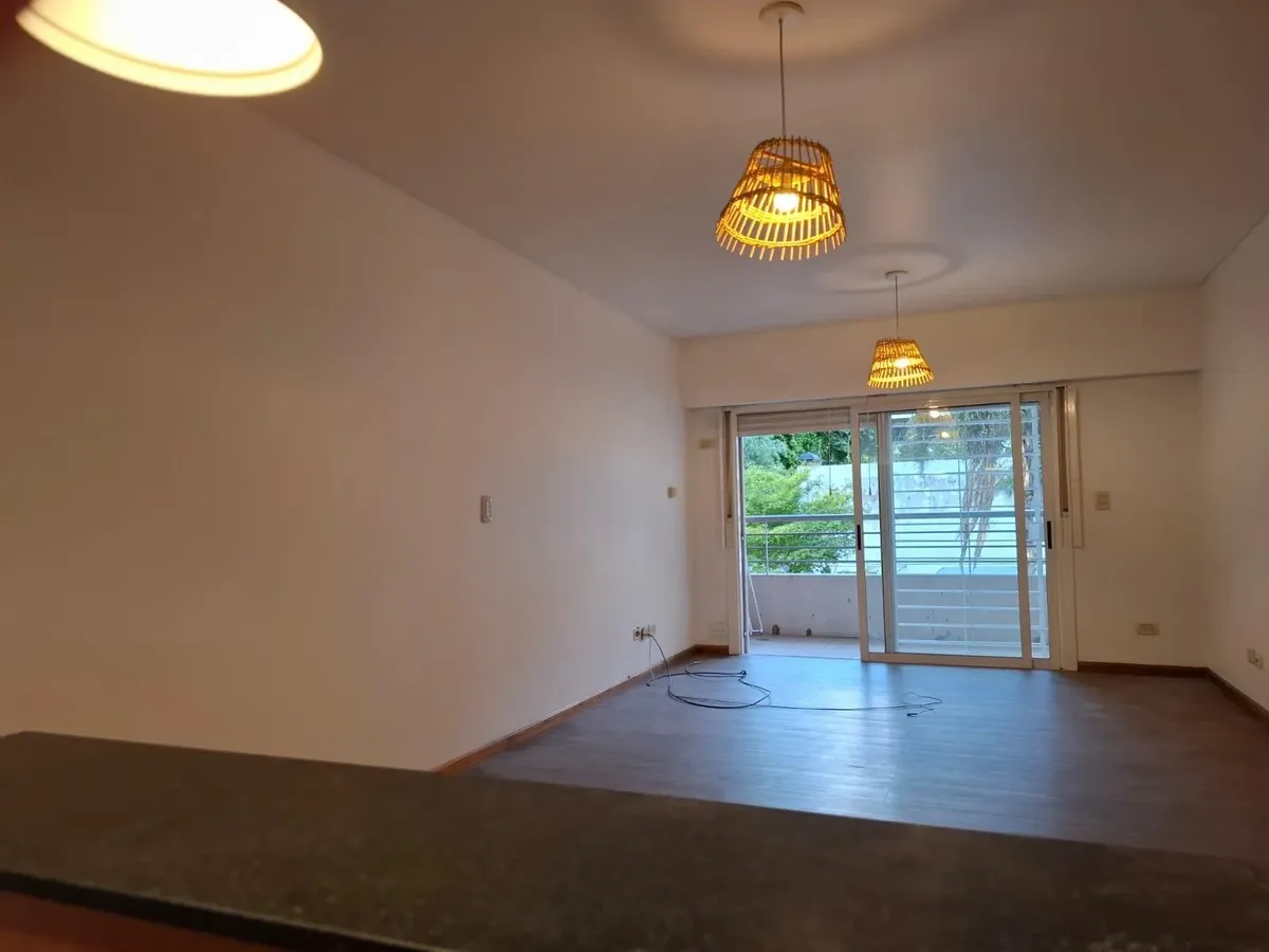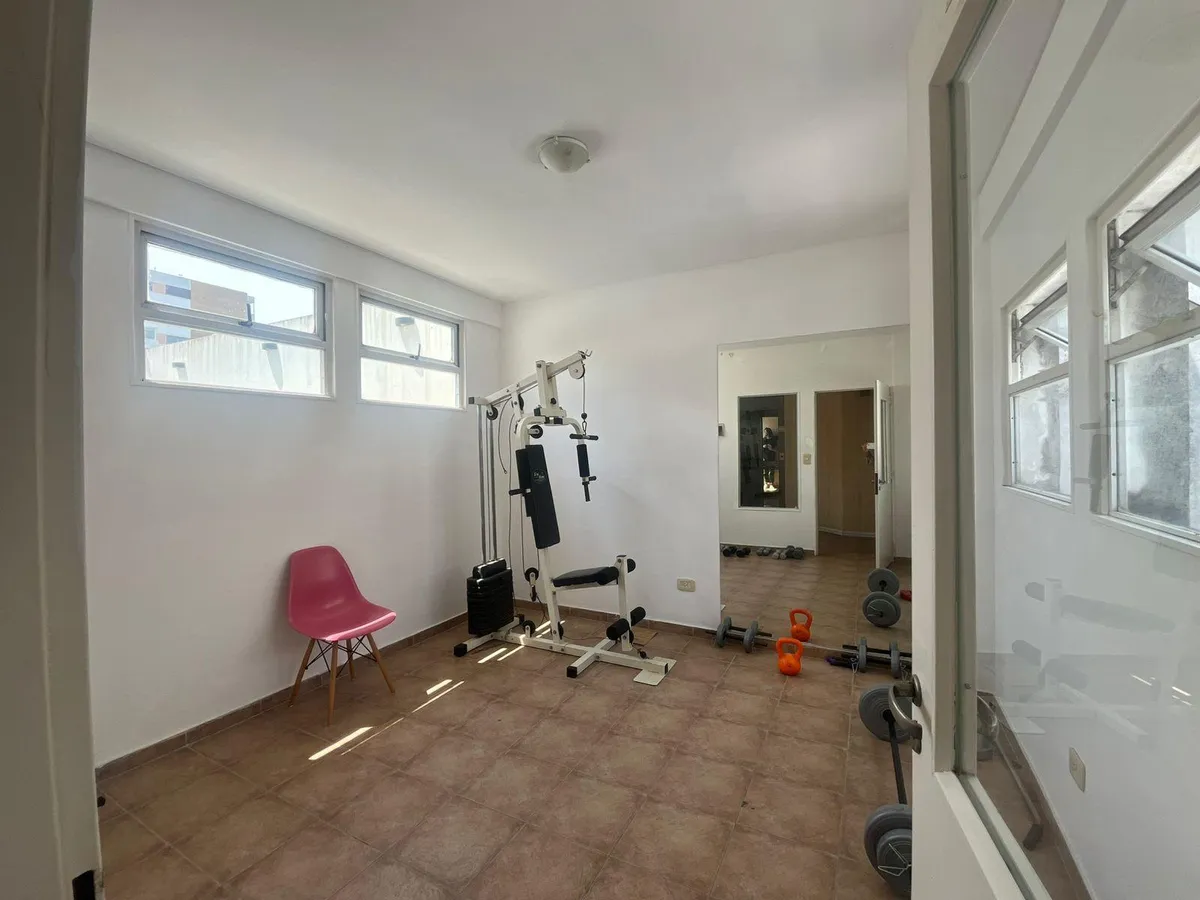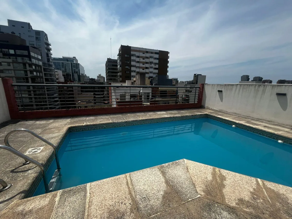 Kitnet em Belgrano. Há piscina, área de churrasco, lavanderia e academia no edifício. A publicação menciona proximidade com os bosques de Palermo e meios de transporte, incluindo ônibus e trem a partir de Barrancas.