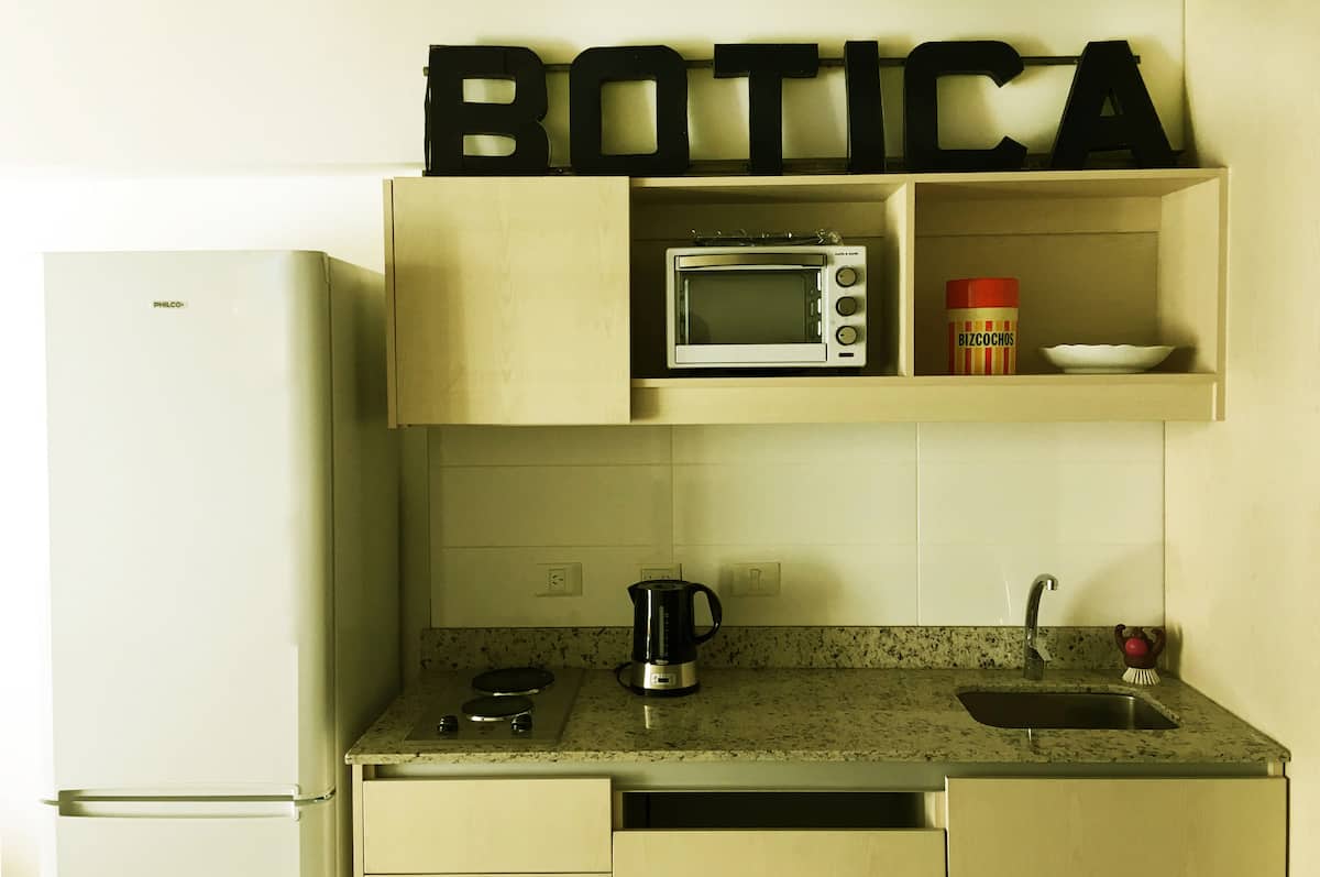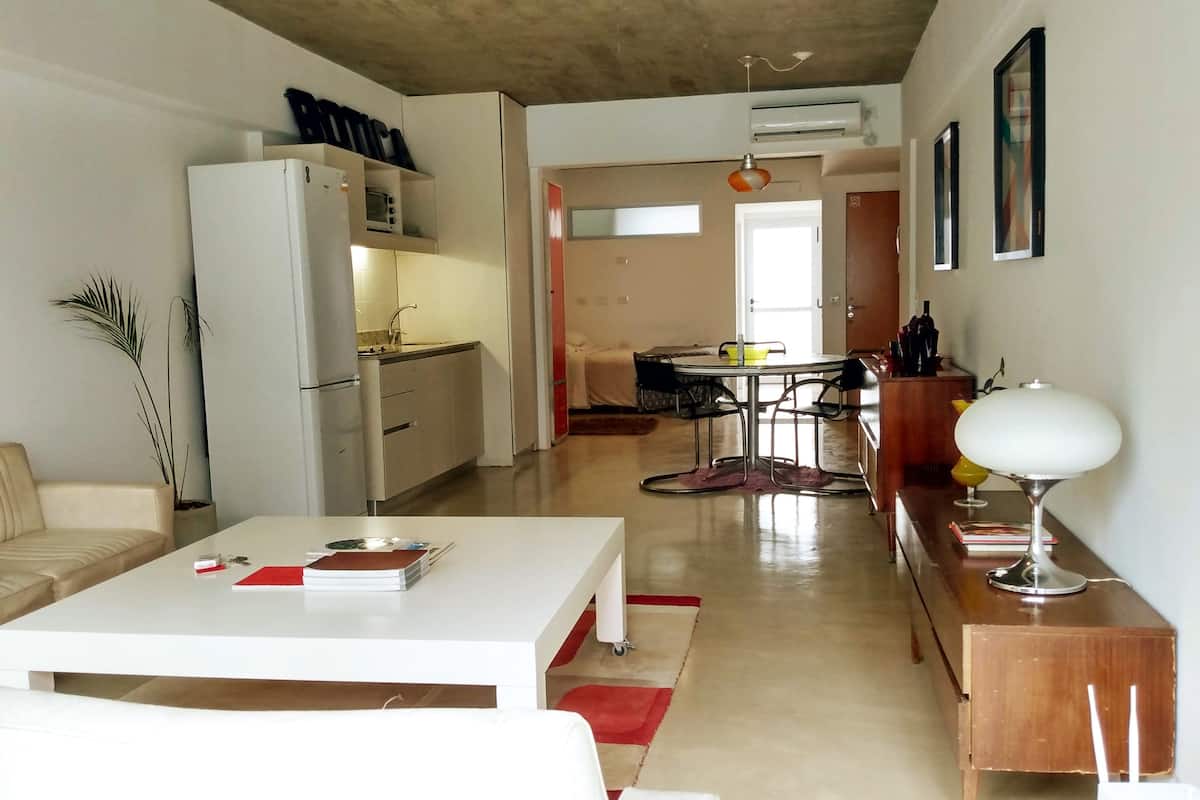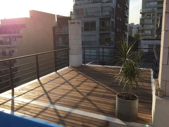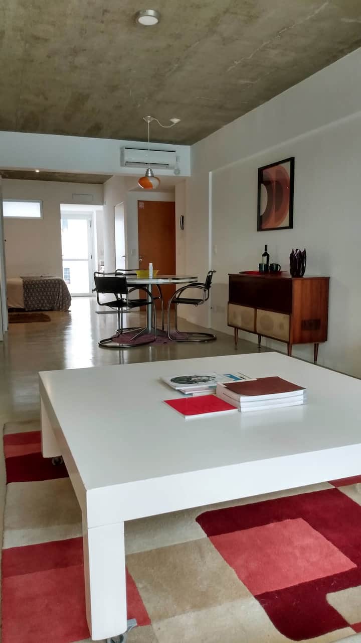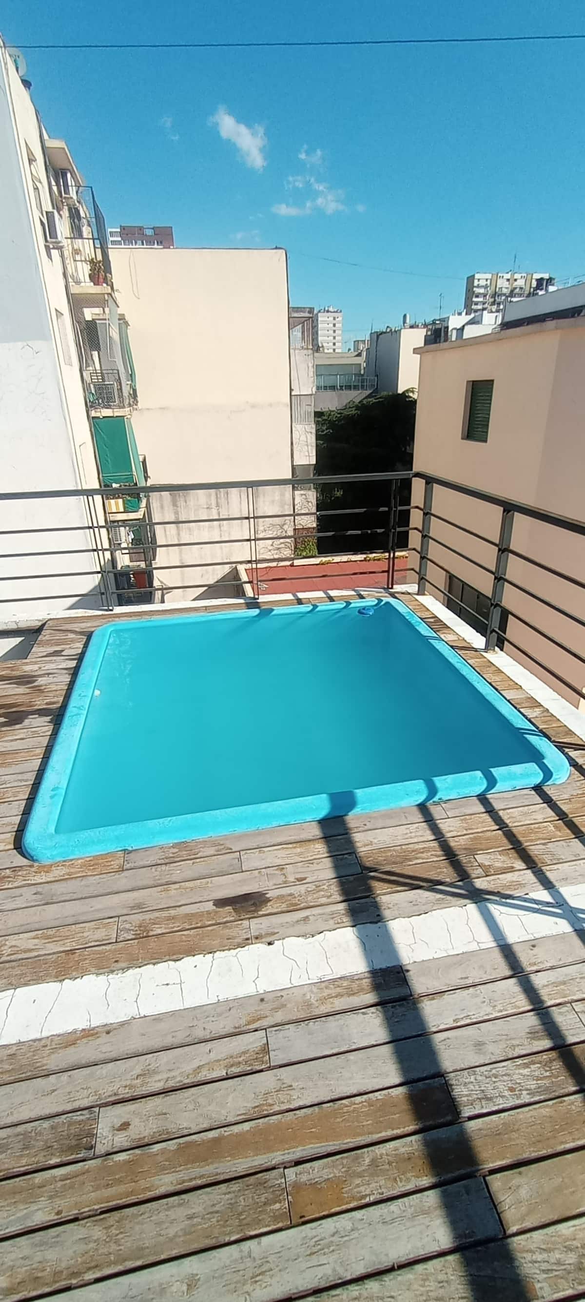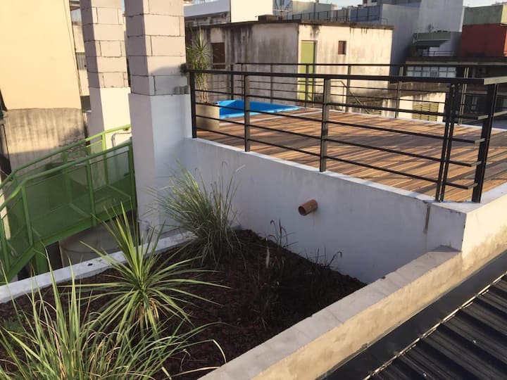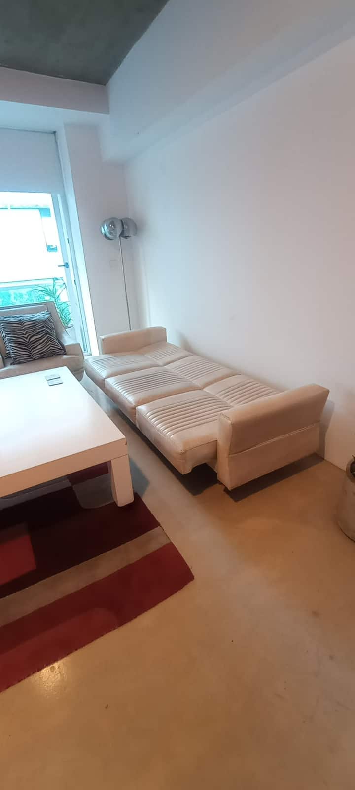 Apartamento de um único ambiente em Belgrano. Unidade mobiliada e equipada, em prédio com terraço no último andar. O prédio dispõe de área de churrasco no terraço, compartilhada com os vizinhos; é proibido fumar no apartamento e nas áreas comuns. O texto cita que há opção de lavanderias na região com lavagem e secagem em 24 horas, com uma próxima ao edifício.