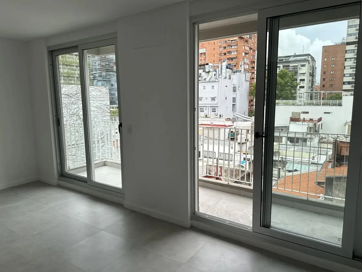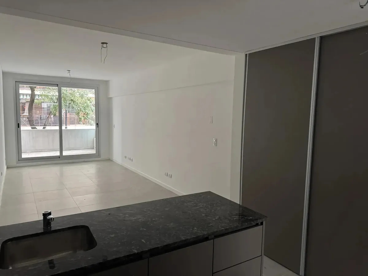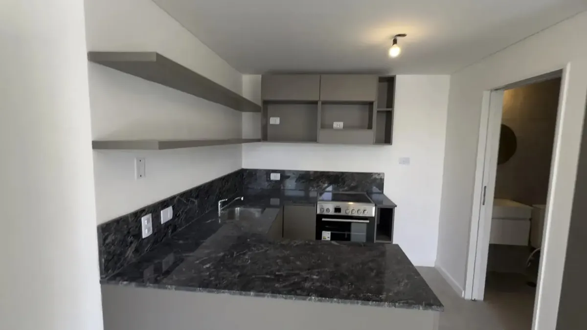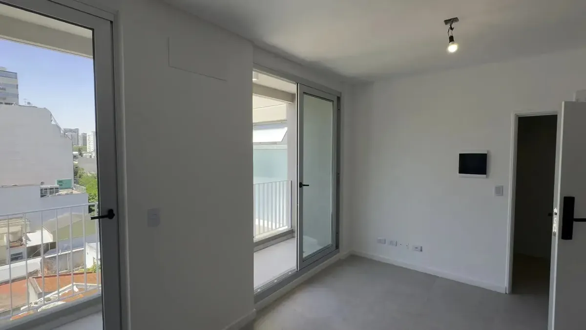 Kitnet em Belgrano, no 2400 de Montañeses, com ambiente principal e saída para balcão/terraço privativo. Cozinha integrada com móveis, alacenas, bancada de pedra e estantes abertas. Banheiro com design moderno, revestimentos em tons claros e misturador monocomando. O edifício tem reconhecimento facial para acesso, fechaduras digitais em cada unidade e elevador de última geração. Áreas comuns com iluminação LED e amenities como salão comunitário e coworking, lavanderia e solário no último piso co