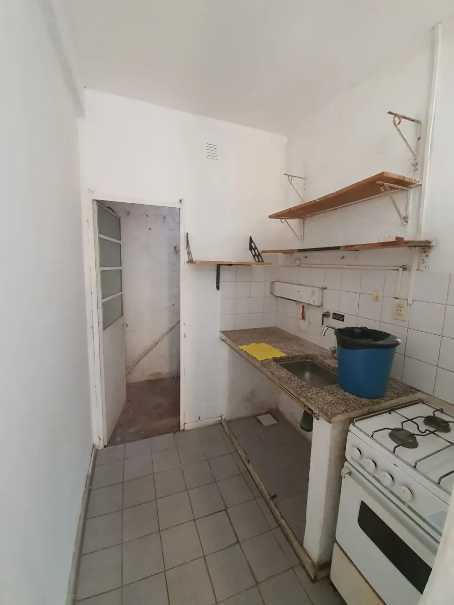Kitnet no térreo, sem condomínio. Conta com área única, banheiro, cozinha e área de lavanderia. Tem janelas amplas e ventilação cruzada.