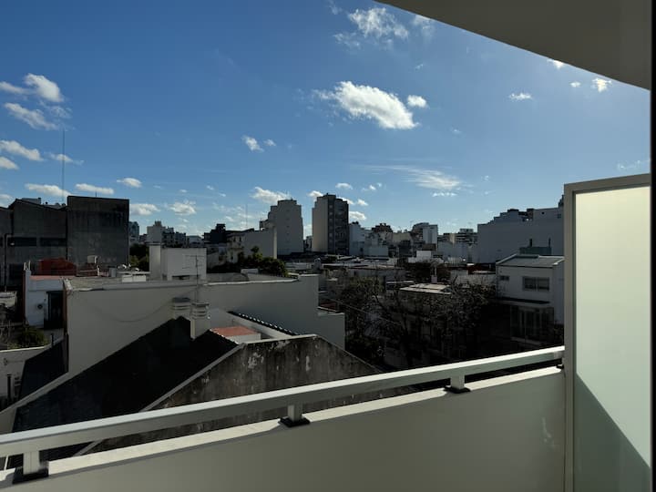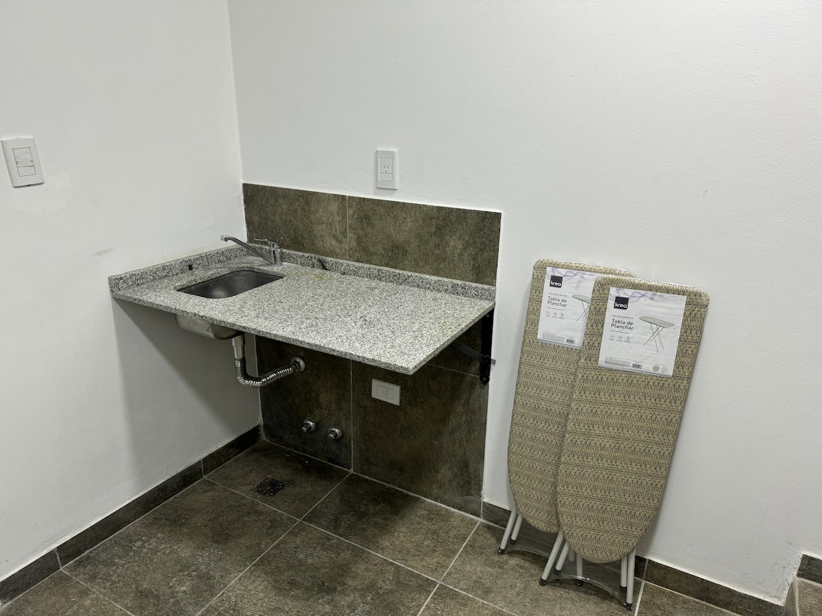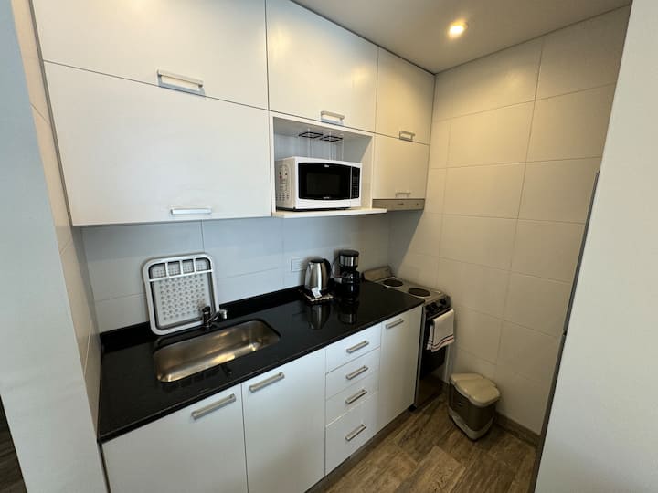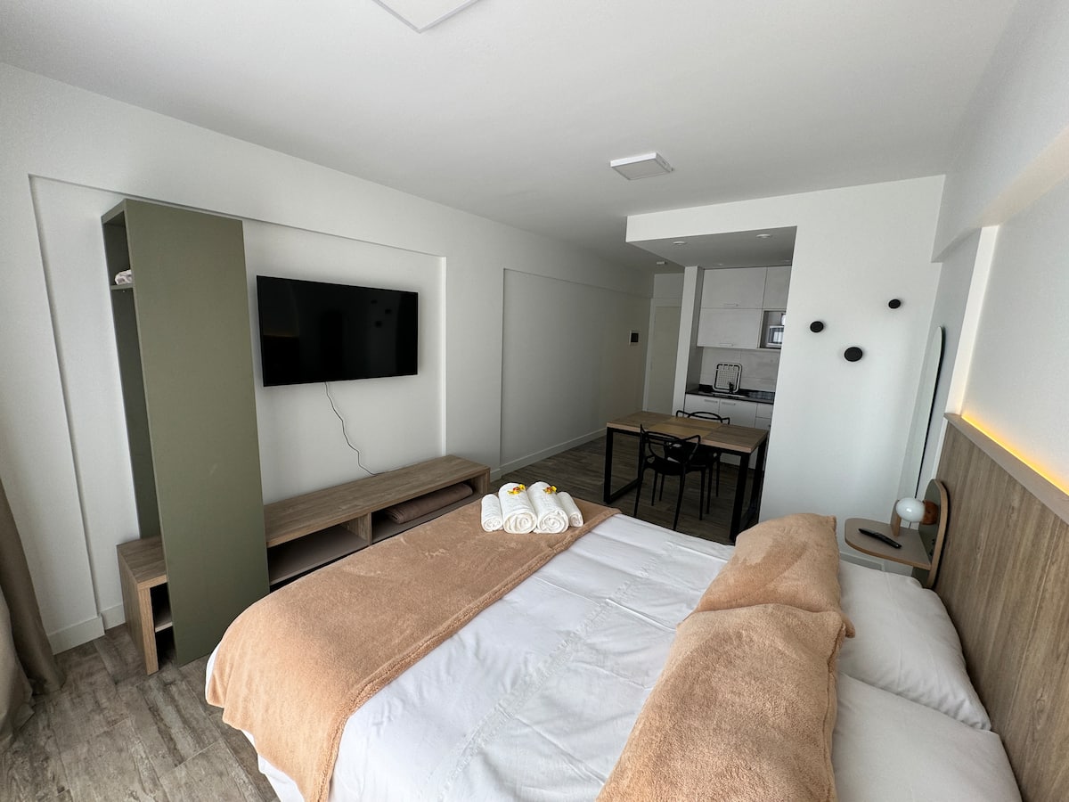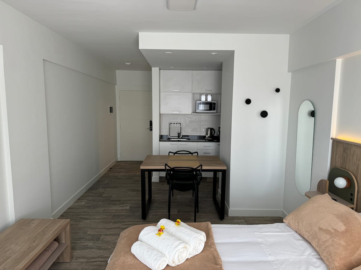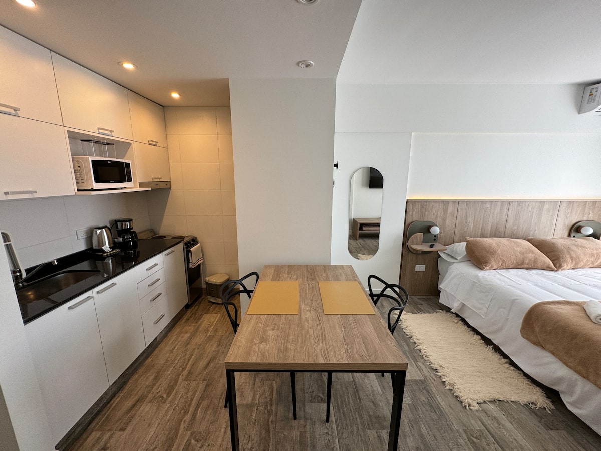 Kitnet em Boedo, com cozinha totalmente equipada, banheiro completo e cama de casal. Inclui TV smart de 50 polegadas e varanda com vista para o pôr do sol.