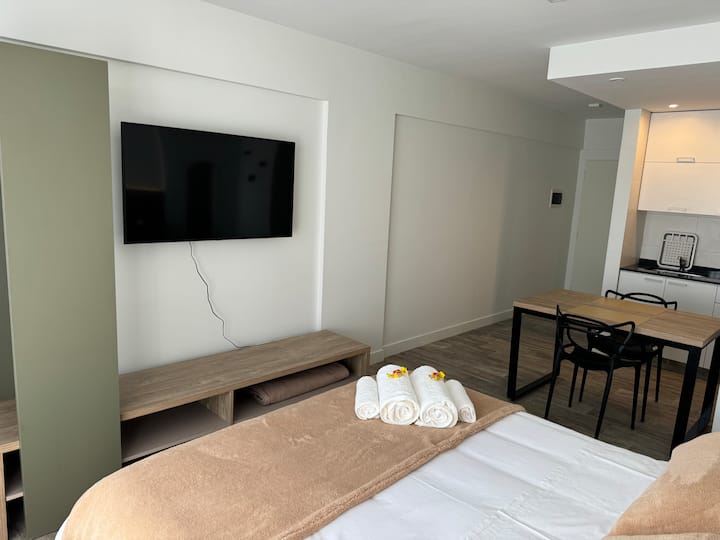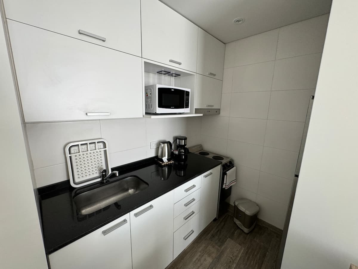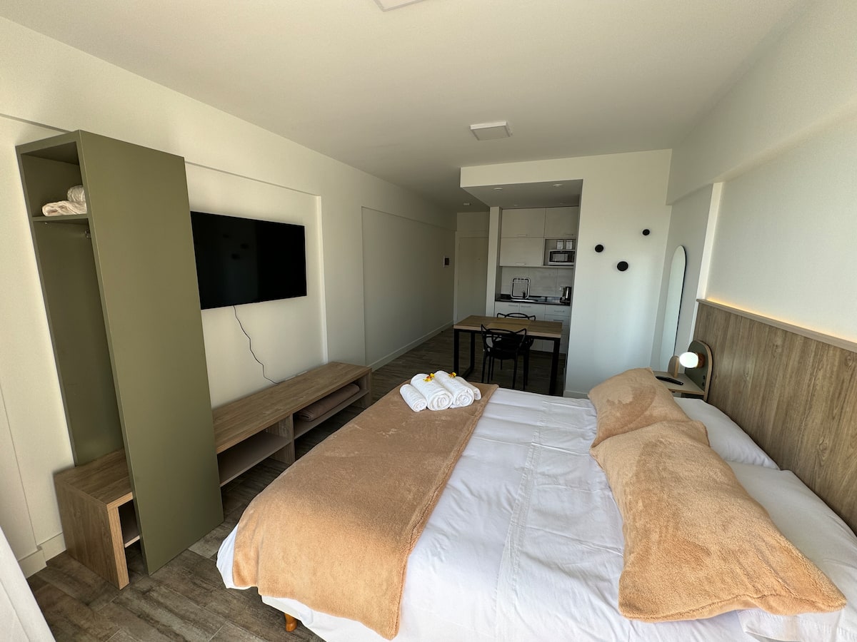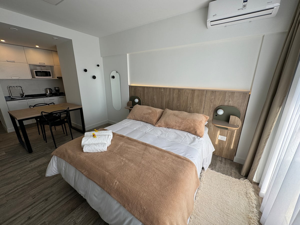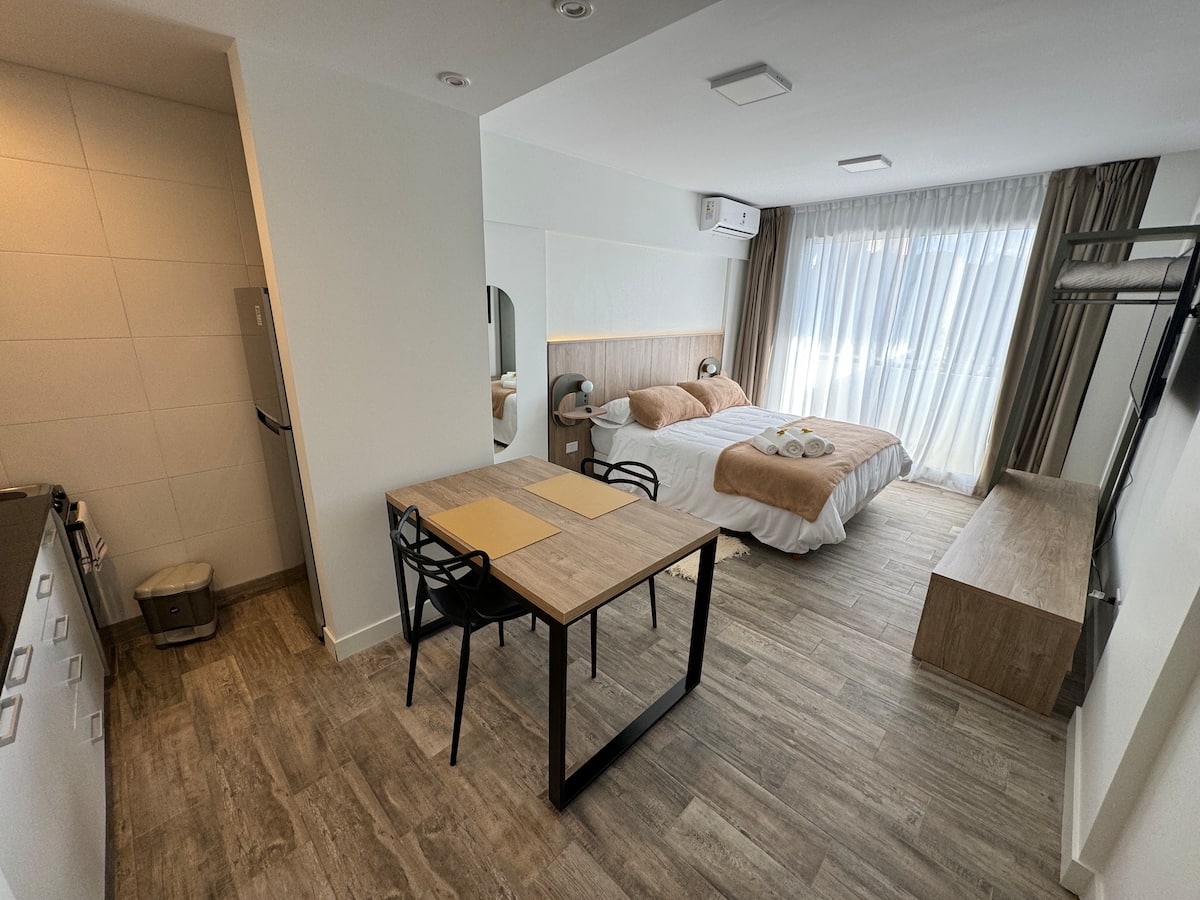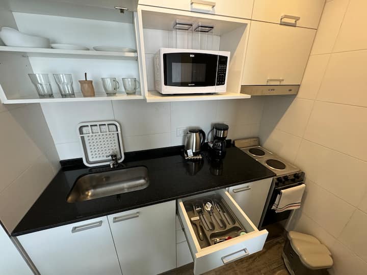 Kitnet em Boedo, com cozinha totalmente equipada, banheiro completo e cama de casal. Inclui TV smart de 50 polegadas e varanda com vista para o pôr do sol.