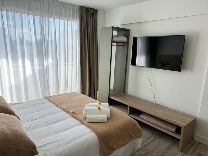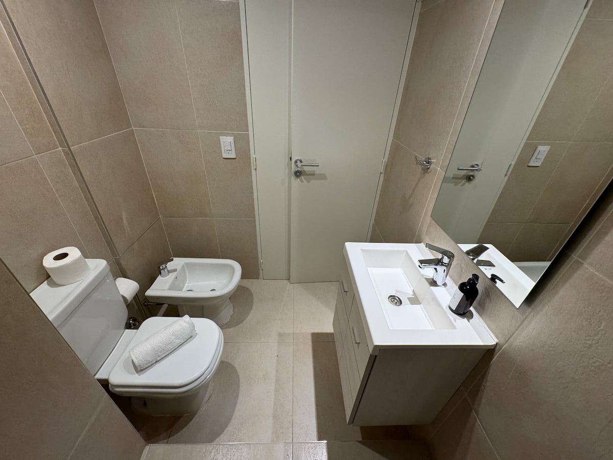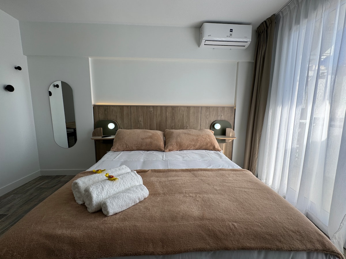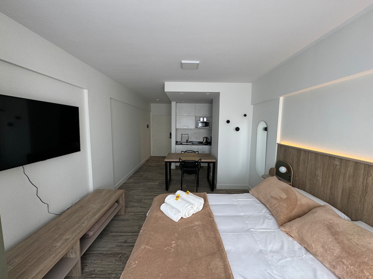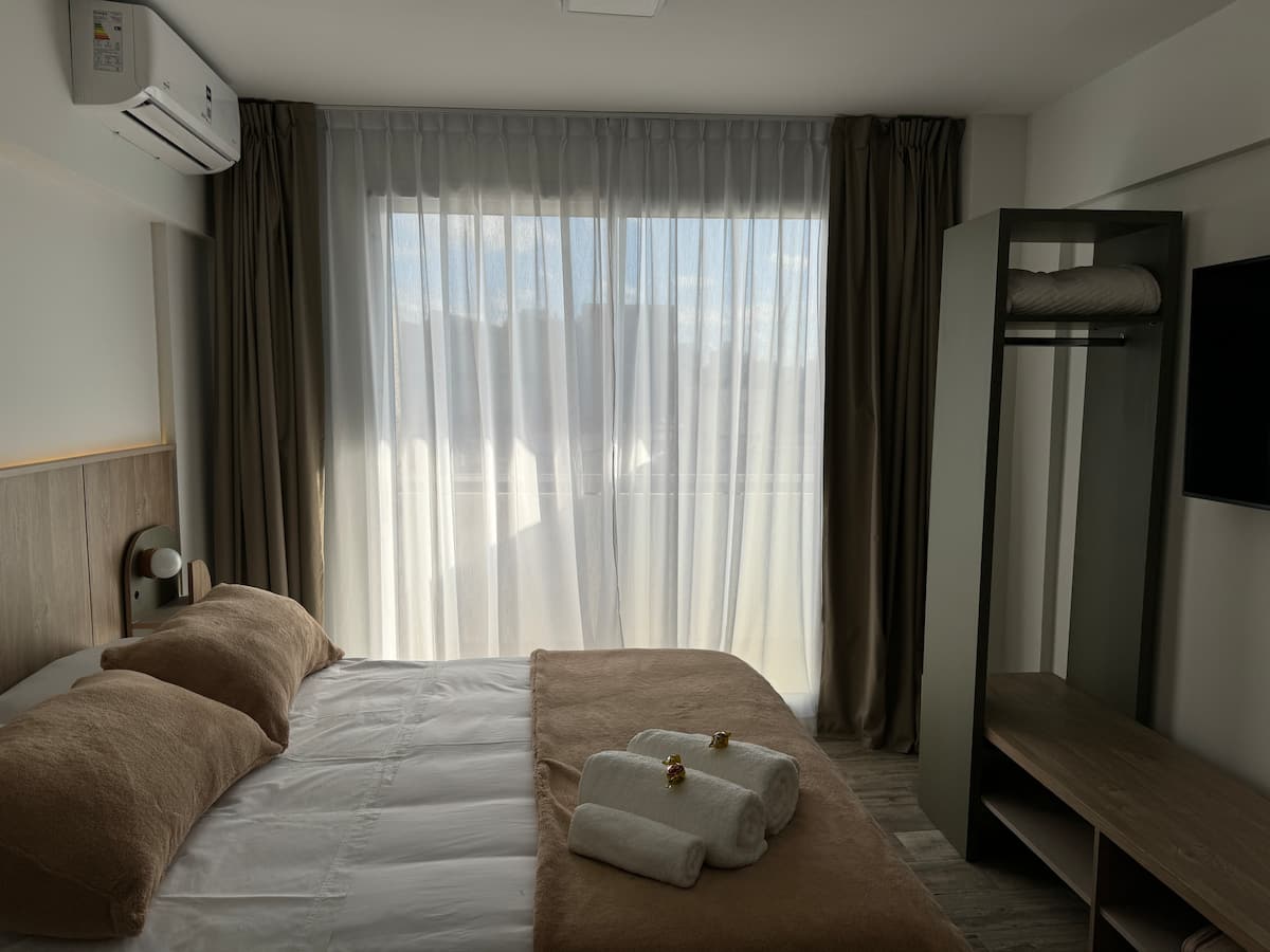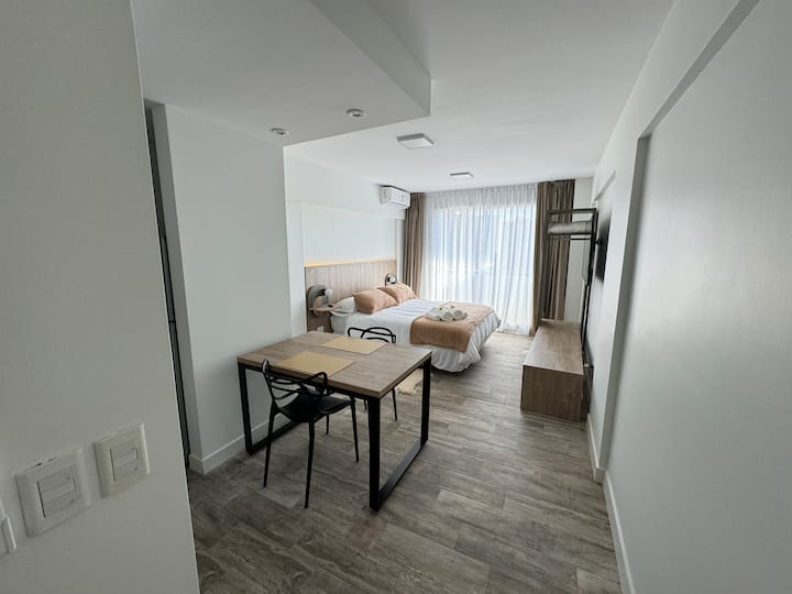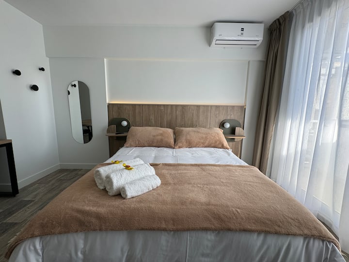 Kitnet em Boedo, com cozinha totalmente equipada, banheiro completo e cama de casal. Inclui TV smart de 50 polegadas e varanda com vista para o pôr do sol.