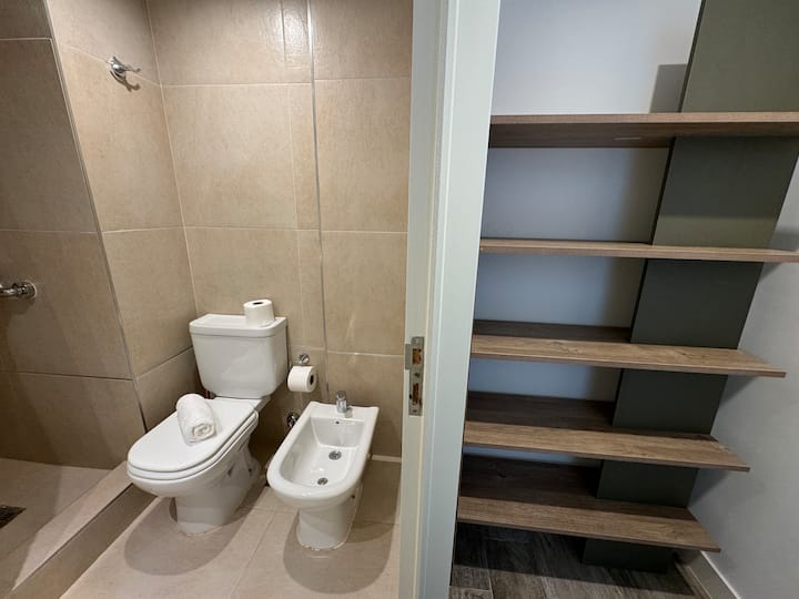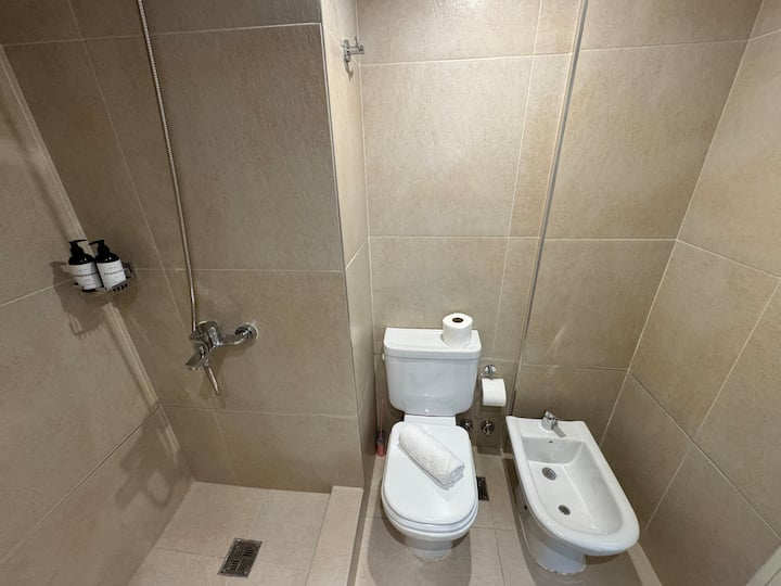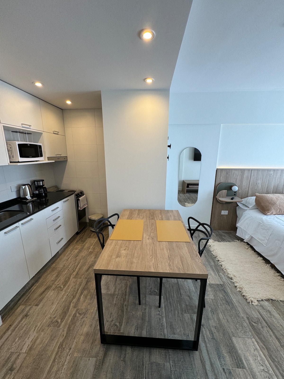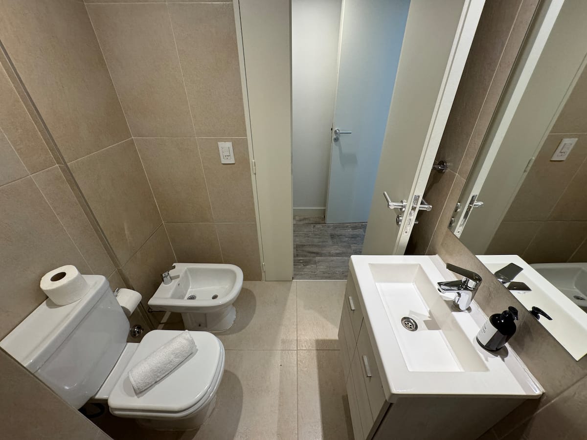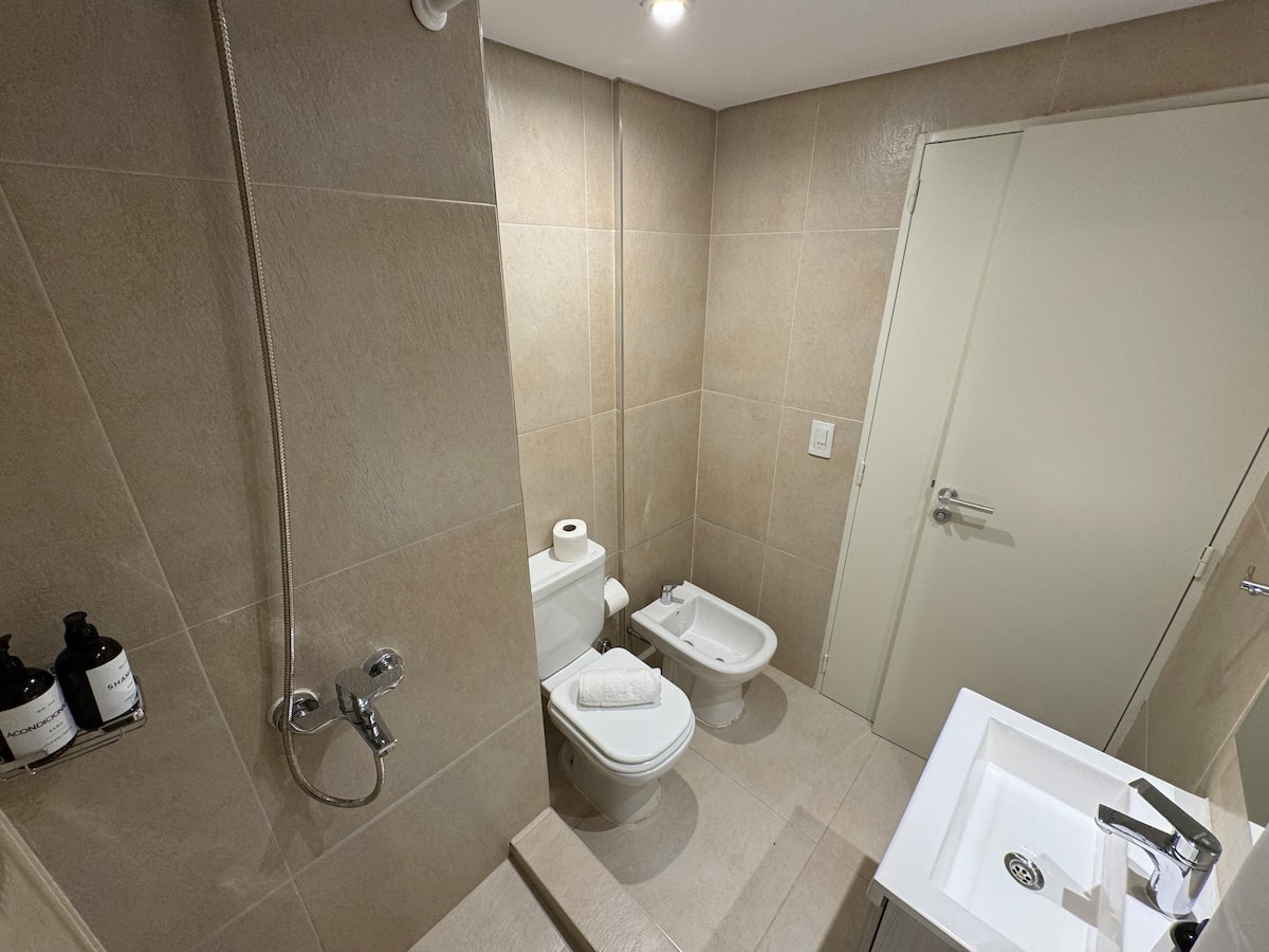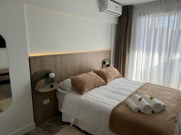 Kitnet em Boedo, com cozinha totalmente equipada, banheiro completo e cama de casal. Inclui TV smart de 50 polegadas e varanda com vista para o pôr do sol.