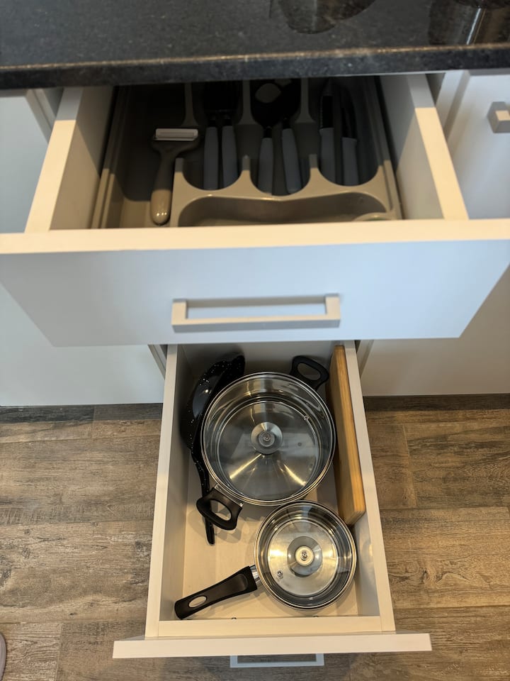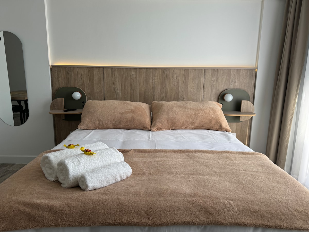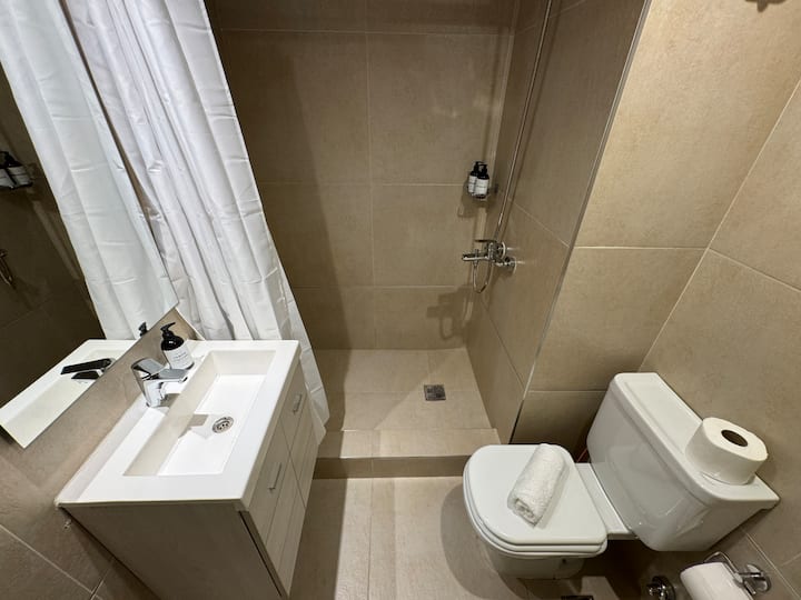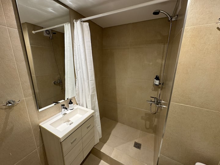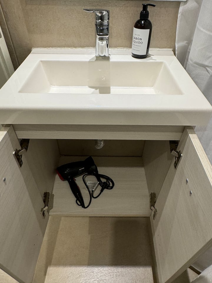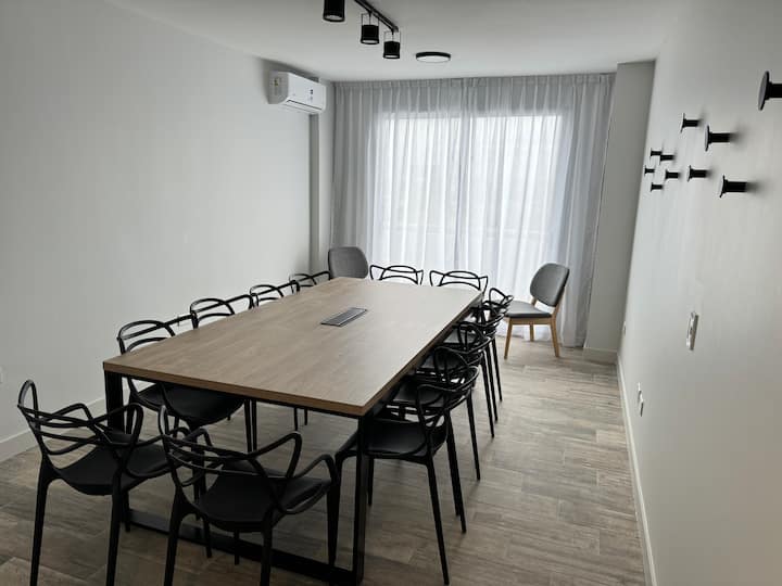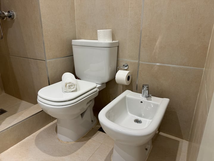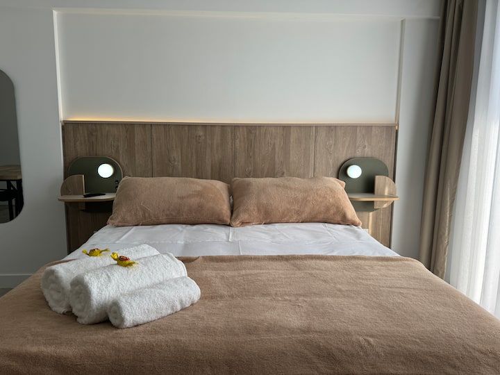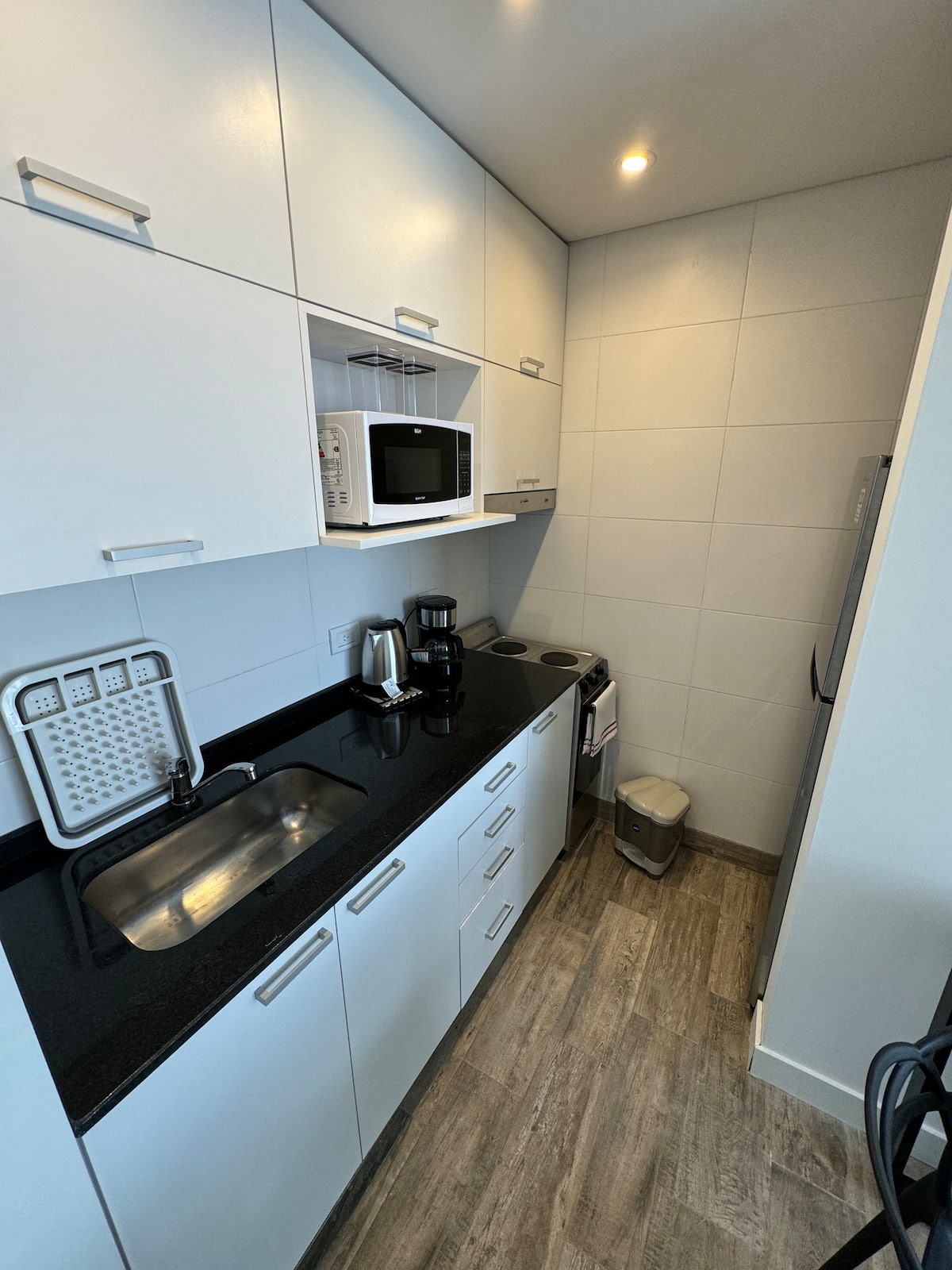 Kitnet em Boedo, com cozinha totalmente equipada, banheiro completo e cama de casal. Inclui TV smart de 50 polegadas e varanda com vista para o pôr do sol.