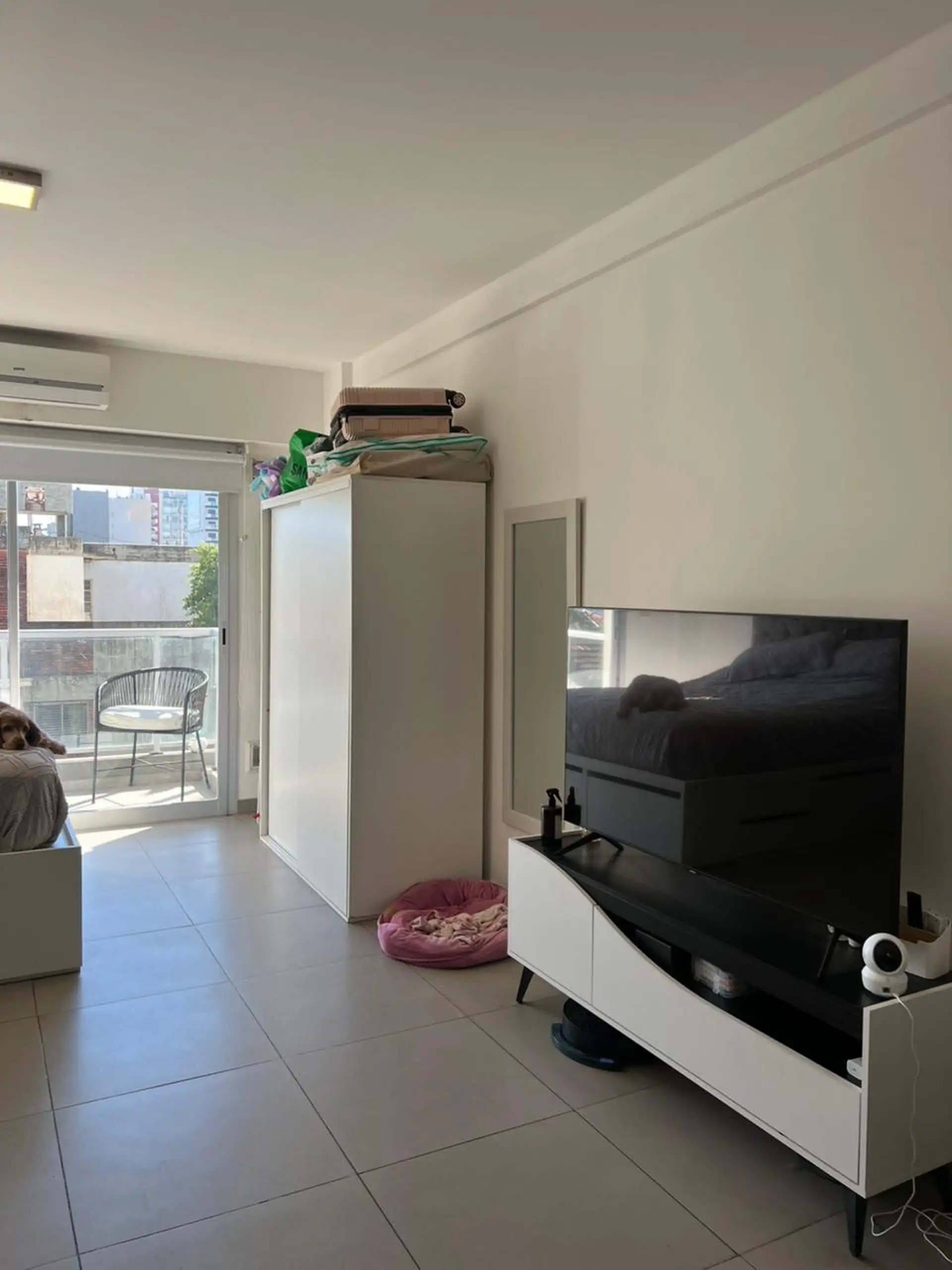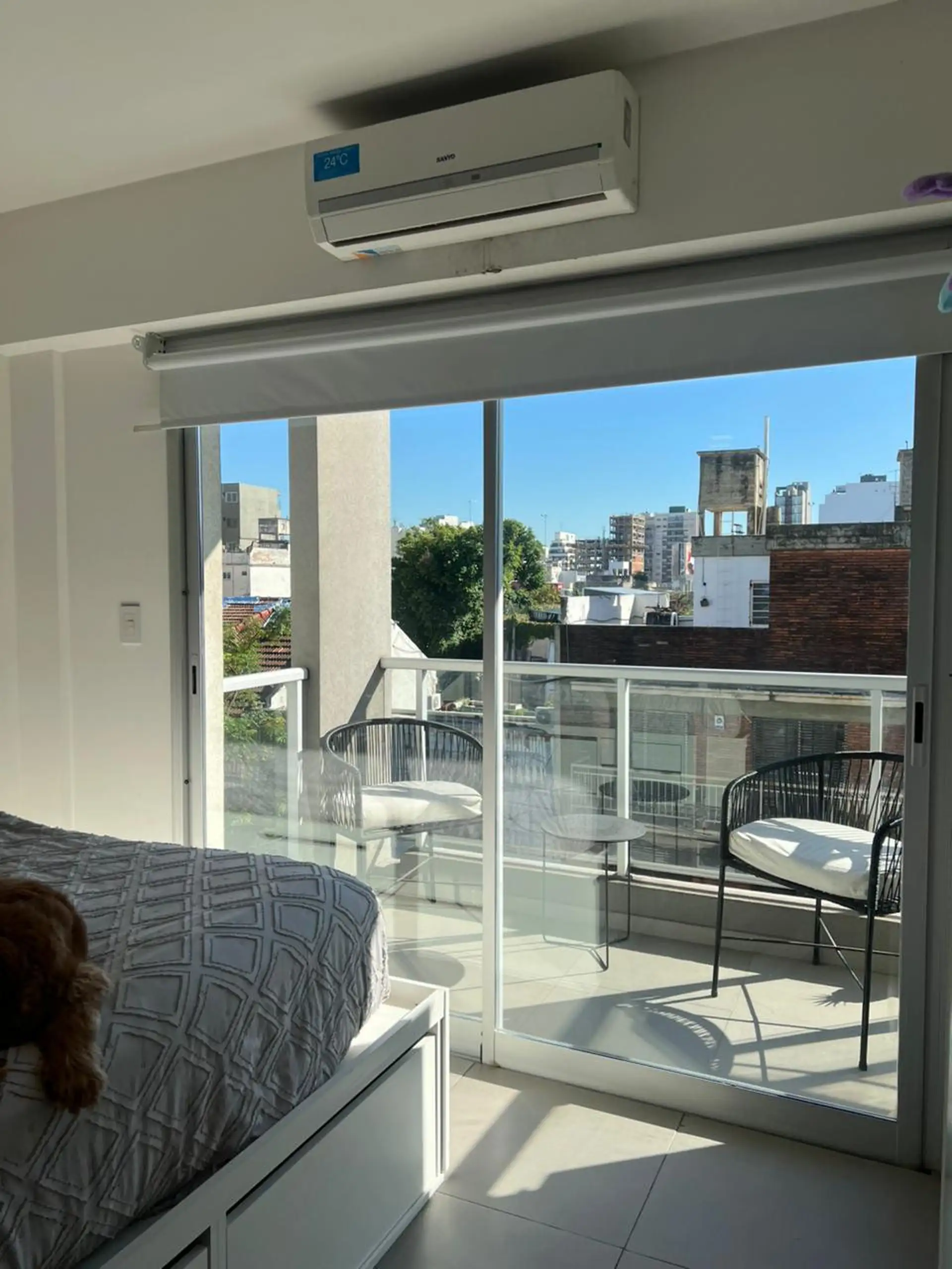 Apartamento tipo kitnet com 32 m² construídos, de frente para a rua, com 1 ambiente, 1 banheiro e cozinha integrada. Possui ar-condicionado (frio/calor), área de serviço e lavanderia com máquina de lavar (lavarropas), além de varanda e terraço. O prédio tem elevador e porta blindada. Contrato de 24 meses, com reajuste trimestral pelo IPC; exige seguro de garantia. Fica a uma quadra de Av. Pavón e Av. Boedo.