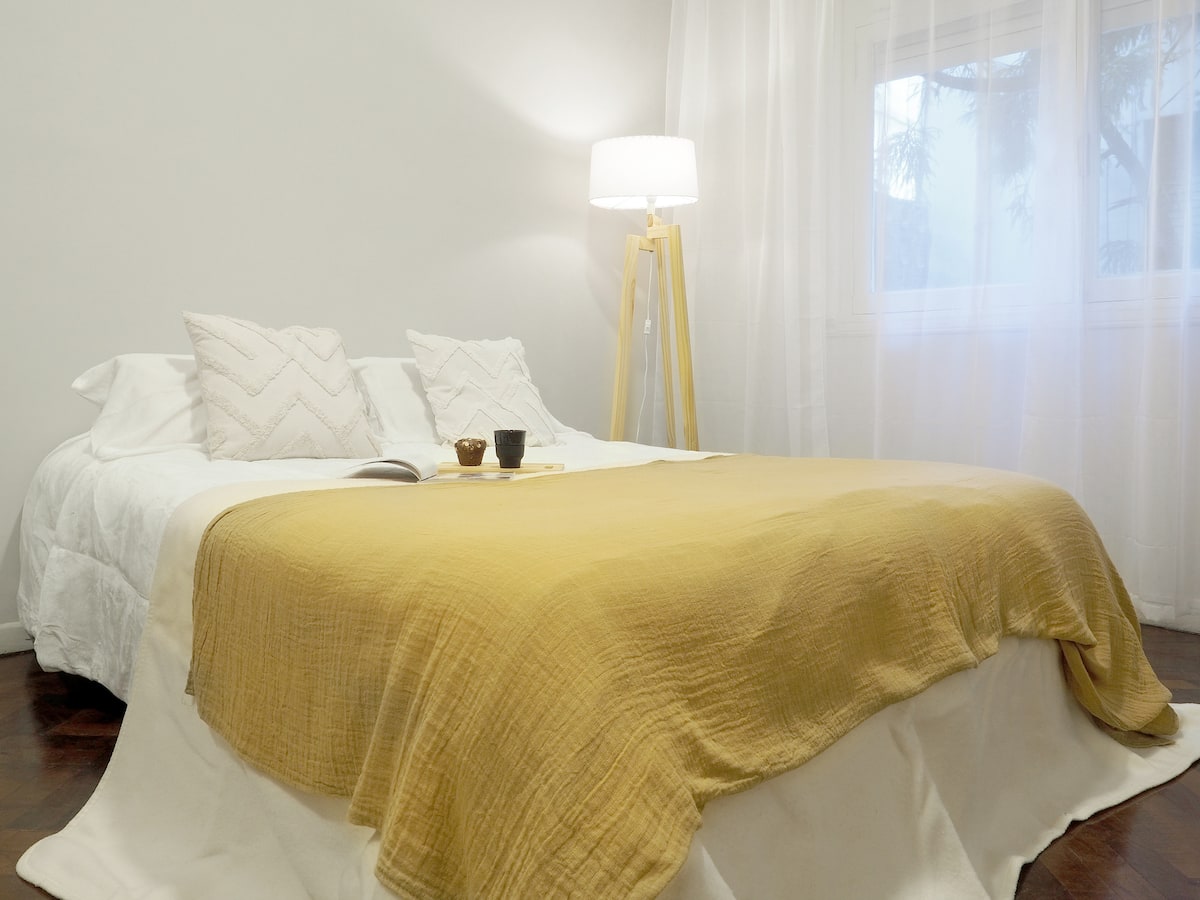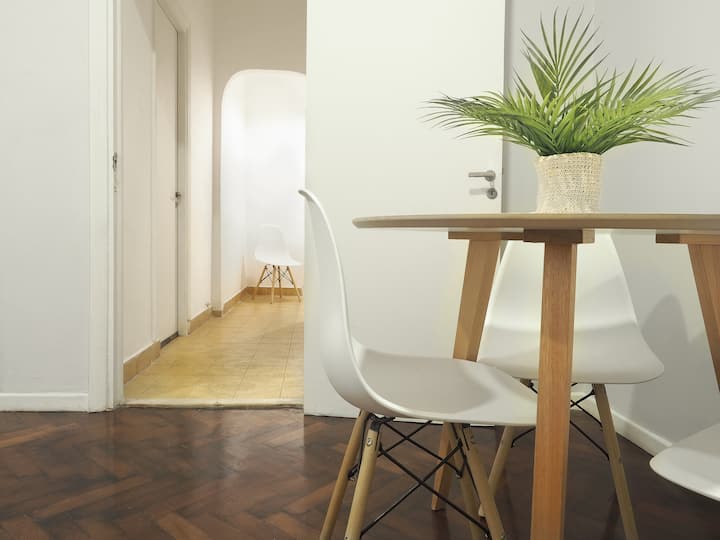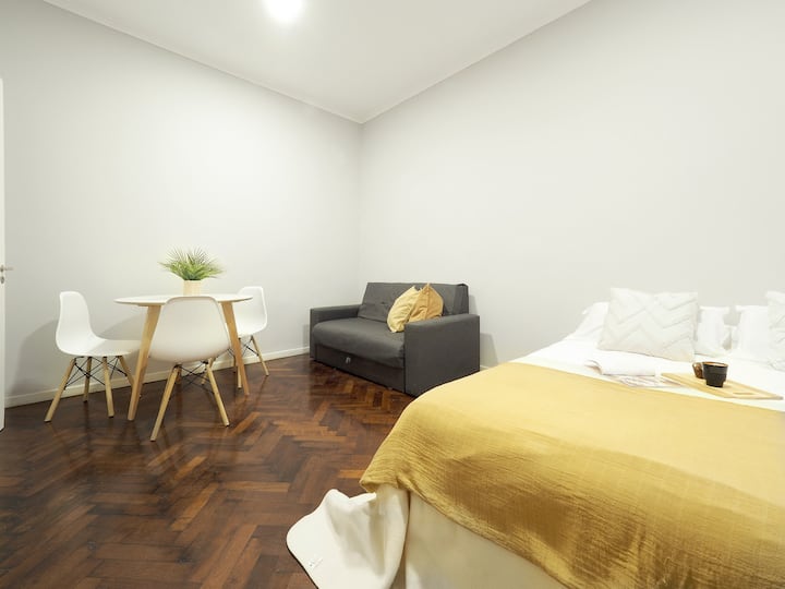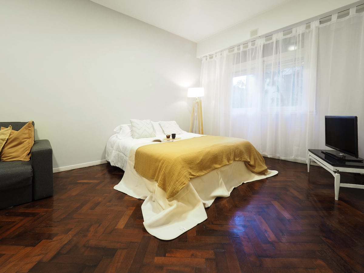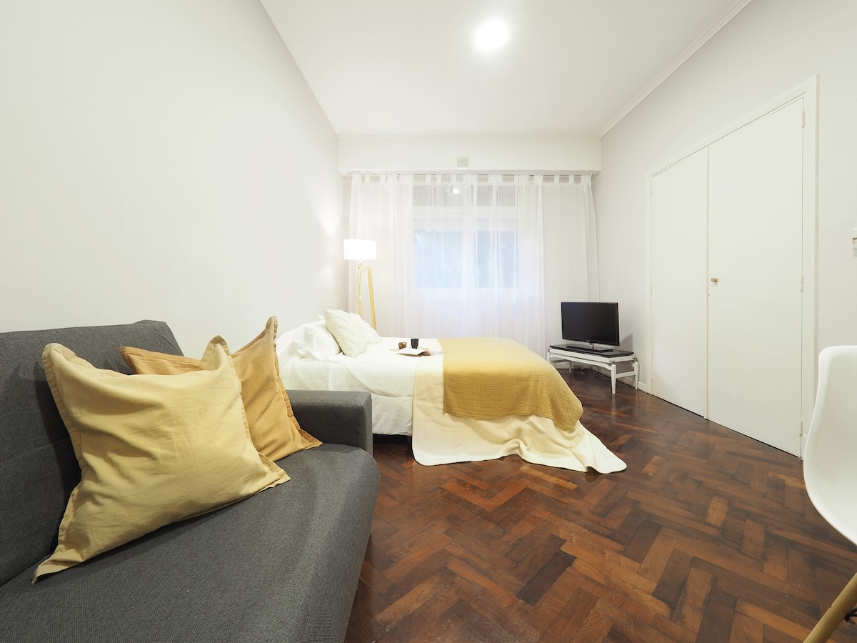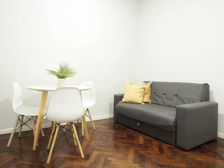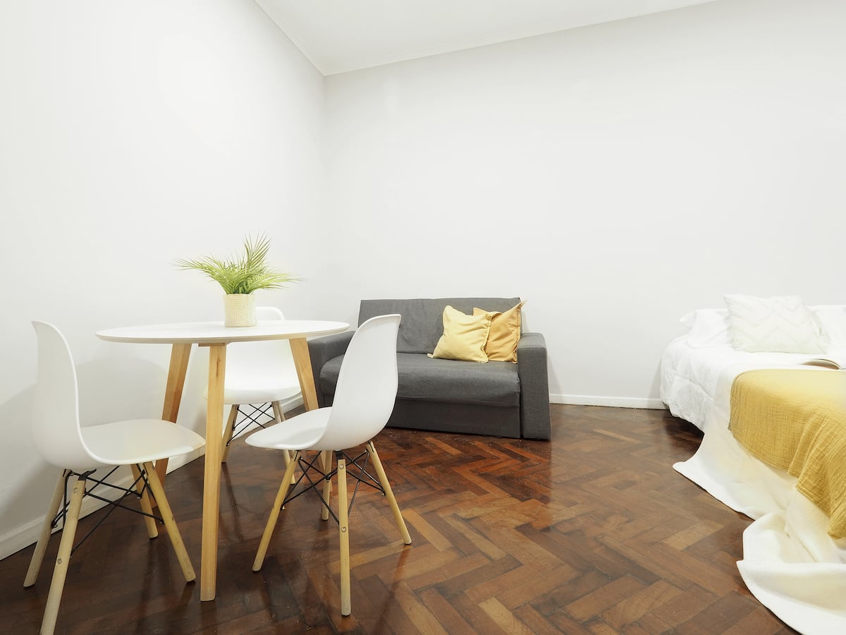 Estúdio em Caballito com cama queen. Inclui sofá, mesa e cadeiras e cozinha separada totalmente equipada. A unidade é mobiliada e preparada para estadias de curta duração.