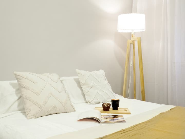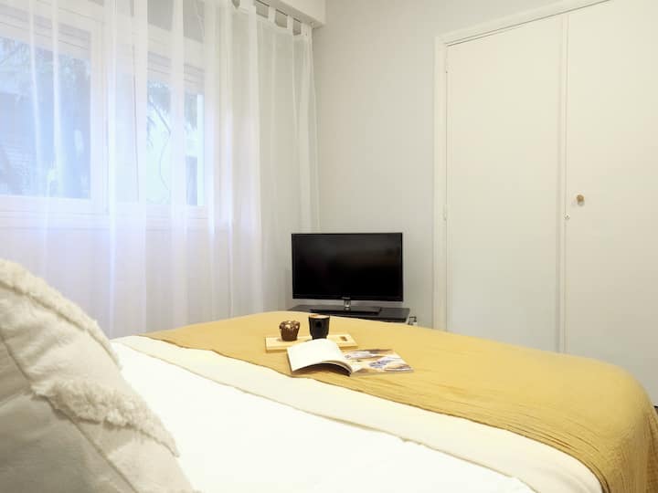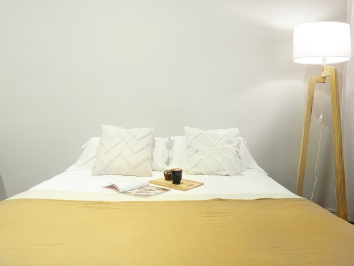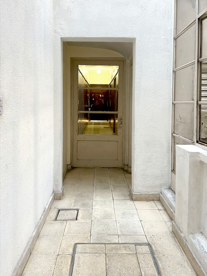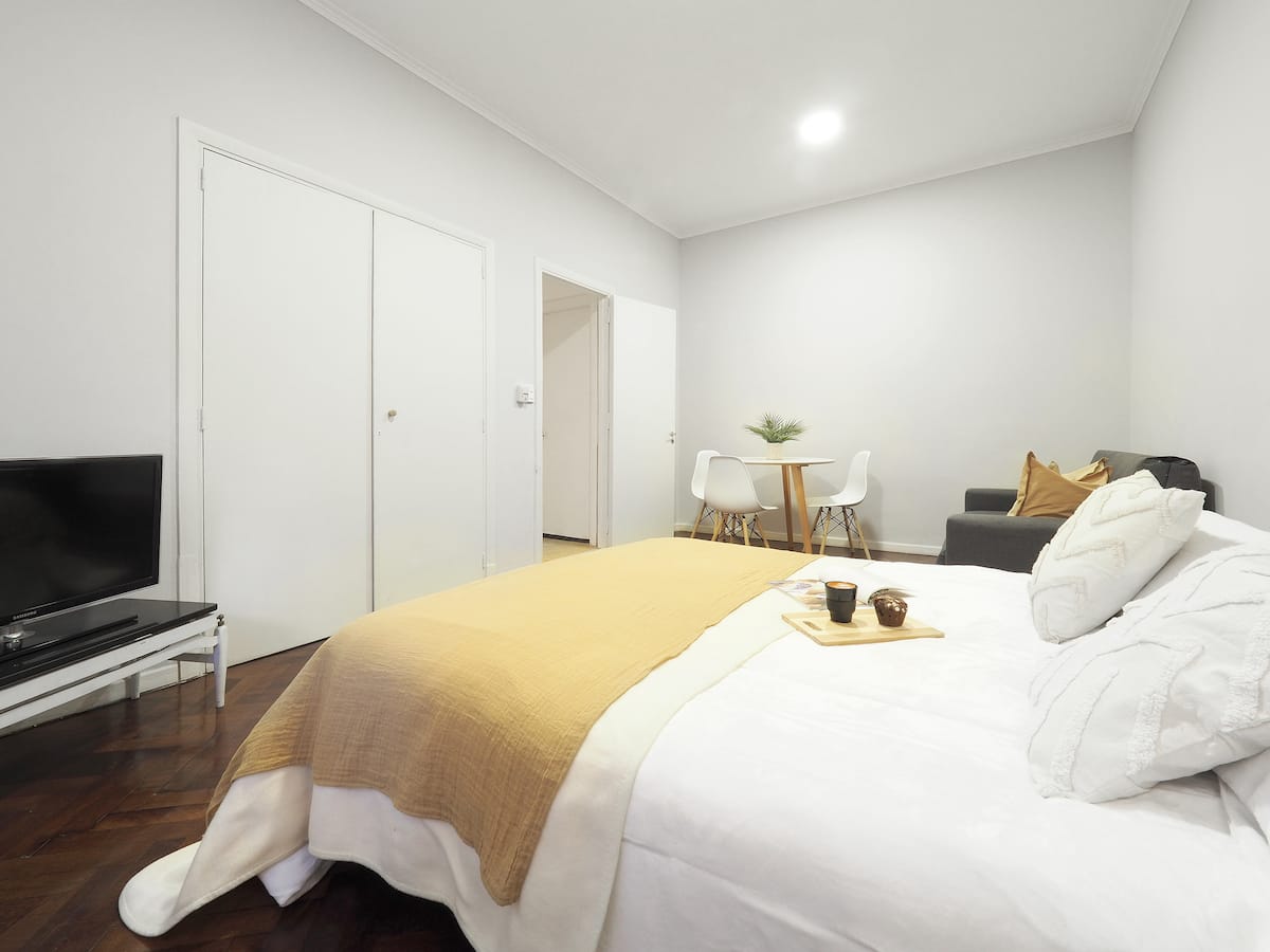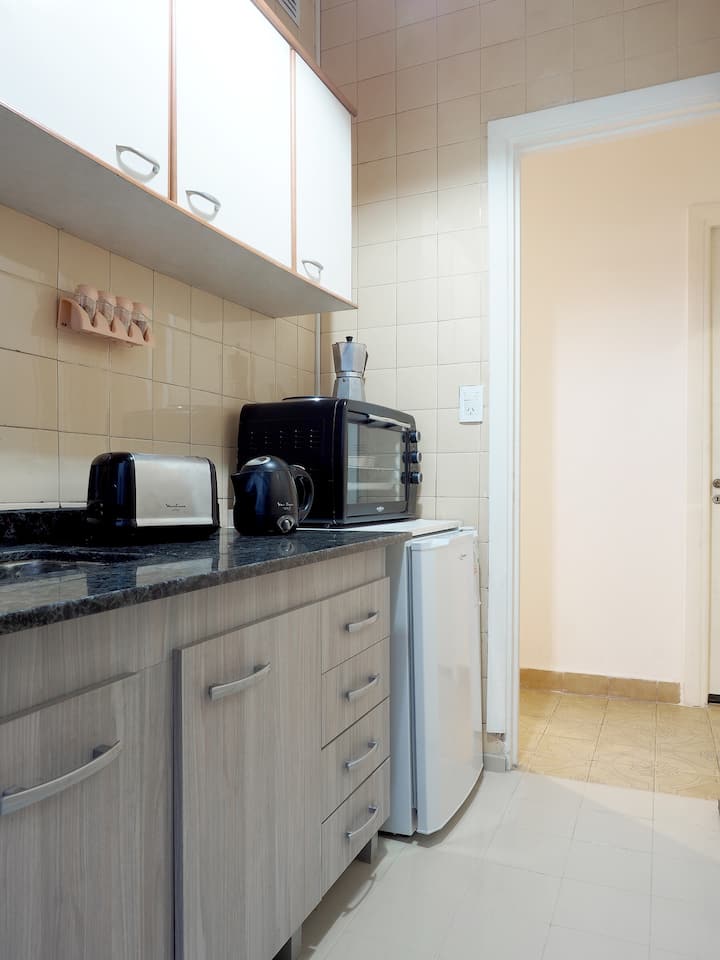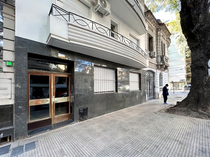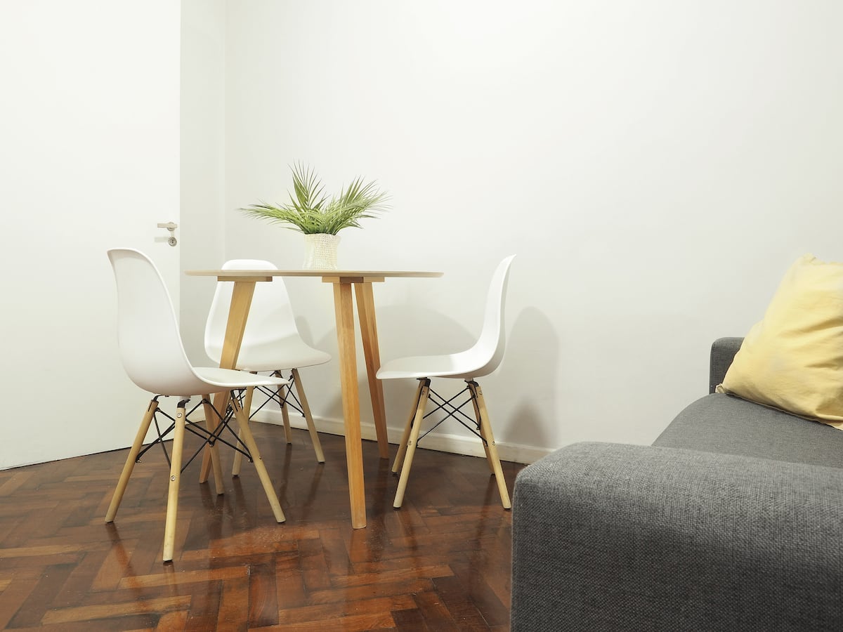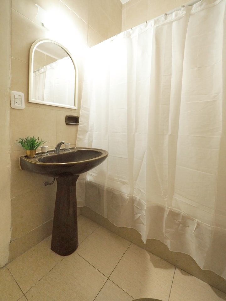 Estúdio em Caballito com cama queen. Inclui sofá, mesa e cadeiras e cozinha separada totalmente equipada. A unidade é mobiliada e preparada para estadias de curta duração.