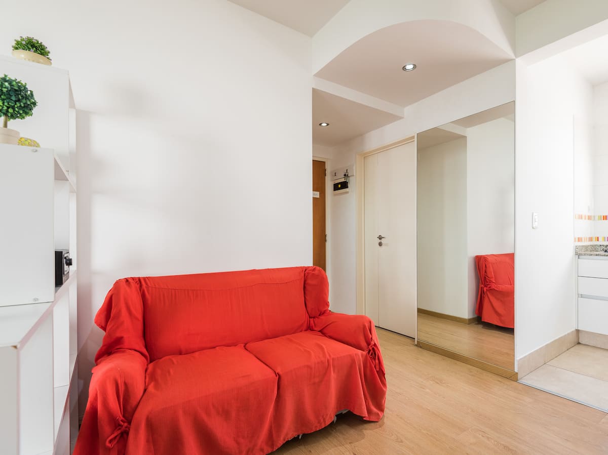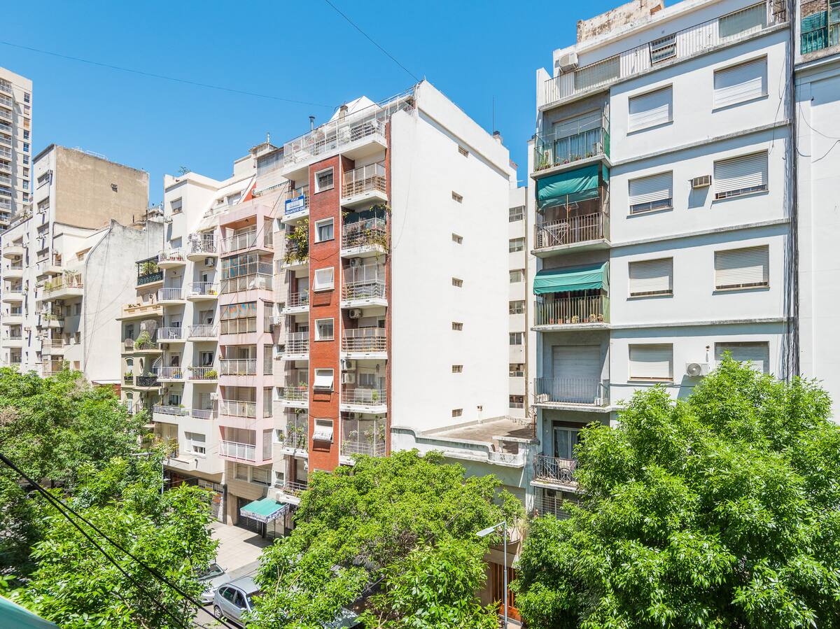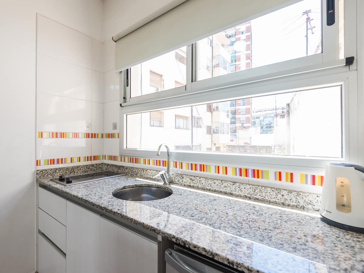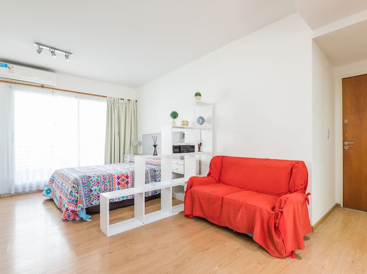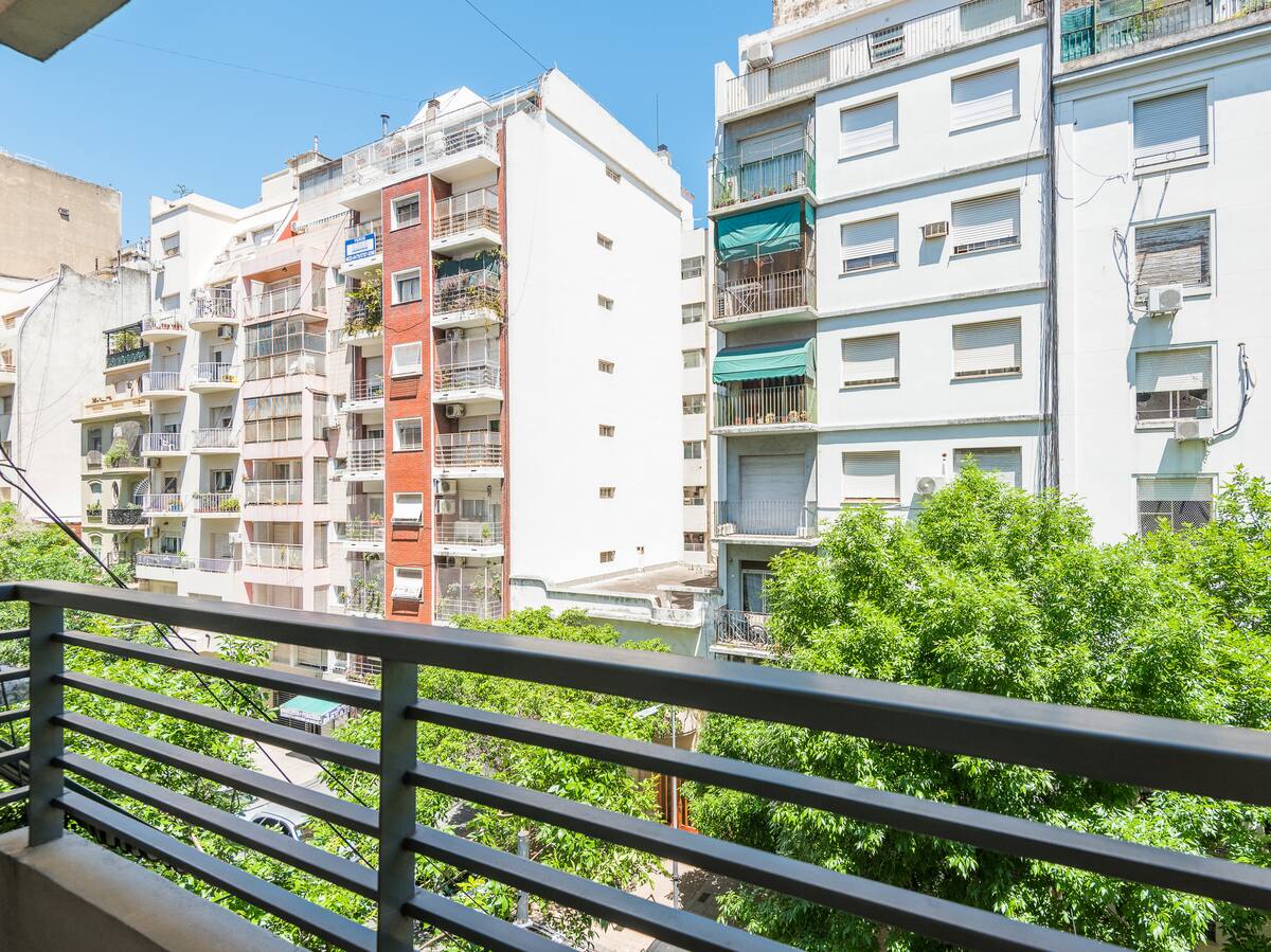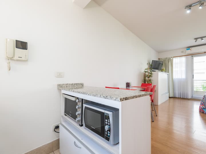 Apartamento em Caballito, a poucos metros da Av. Rivadavia. Ambiente único com área de estar, mesa com cadeiras e duas camas de solteiro que se unem formando uma cama de casal. Banheiro completo com banheira e bidê. Cozinha separada por um balcão com geladeira, micro-ondas, fogão e forno elétrico, além de varanda de frente. O prédio tem área de churrasco e solário.