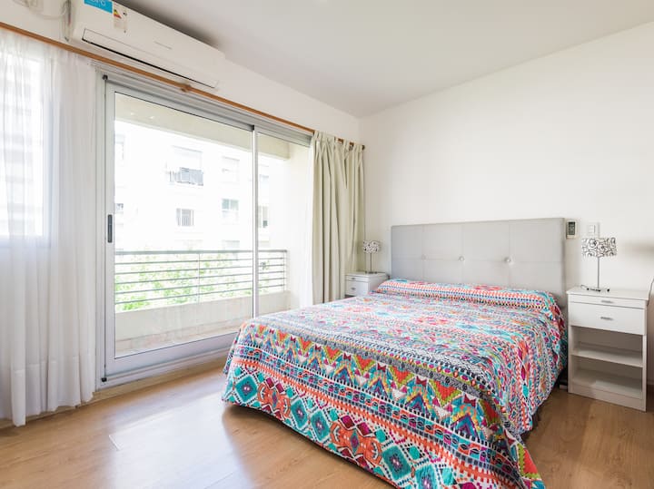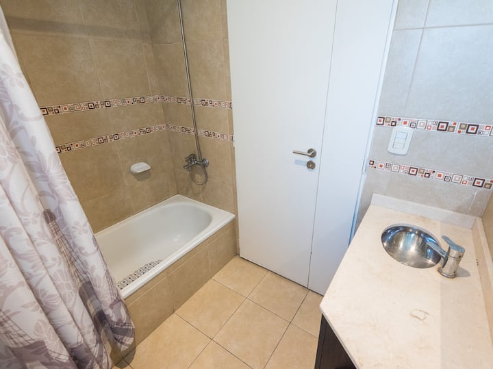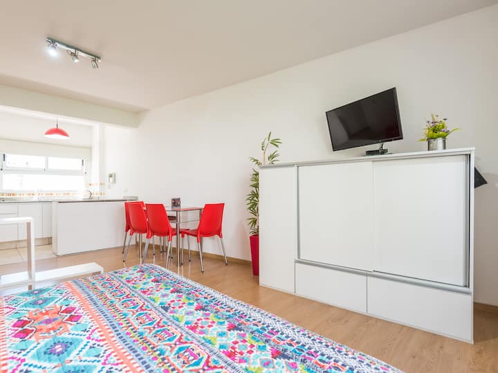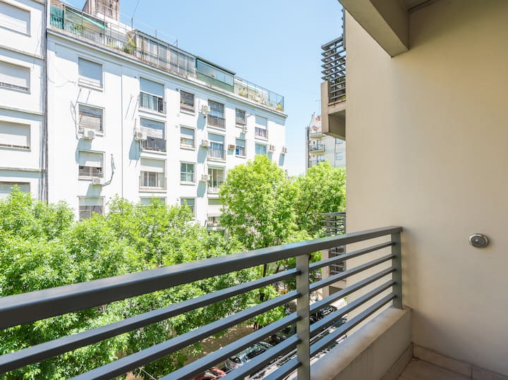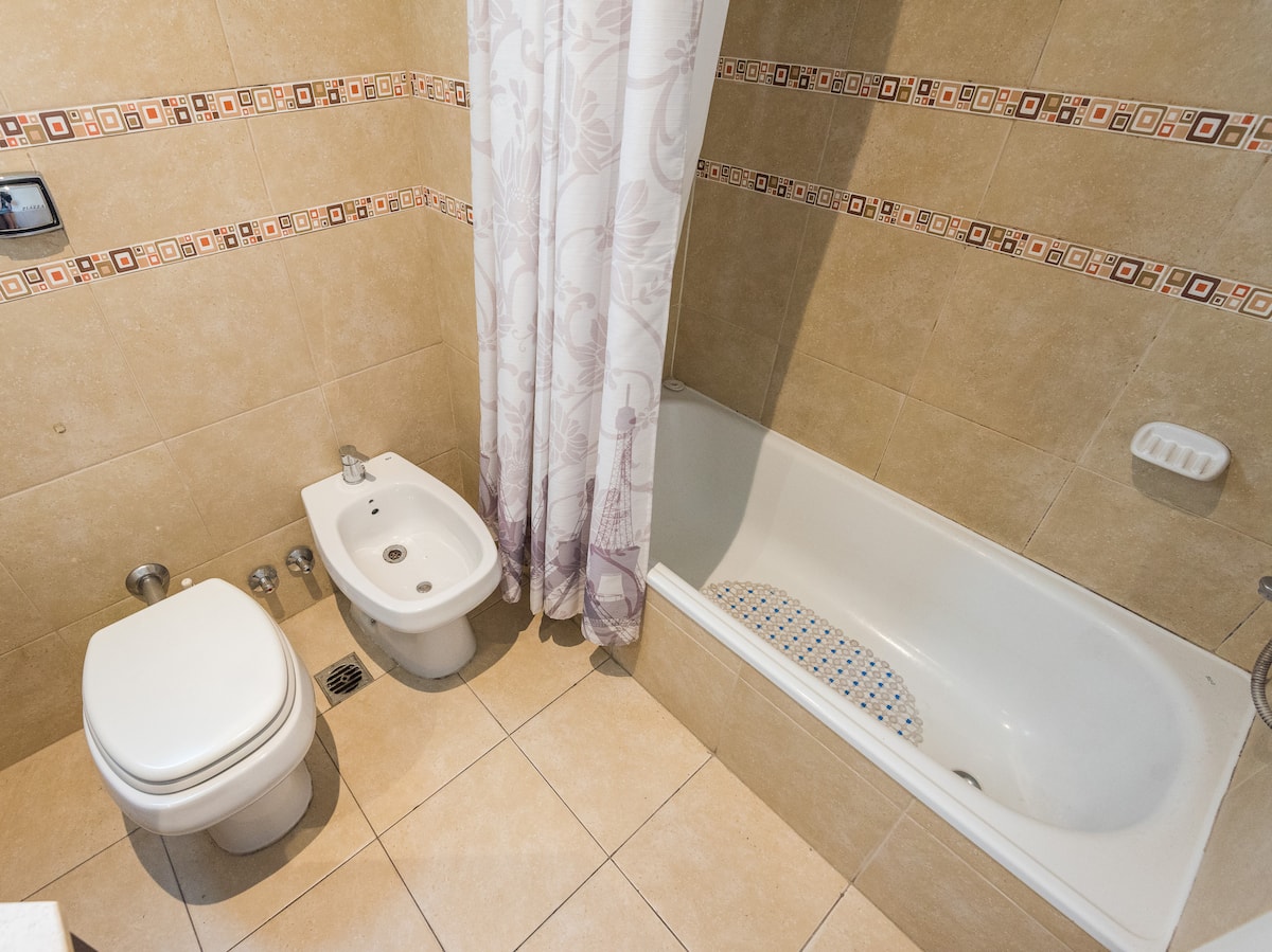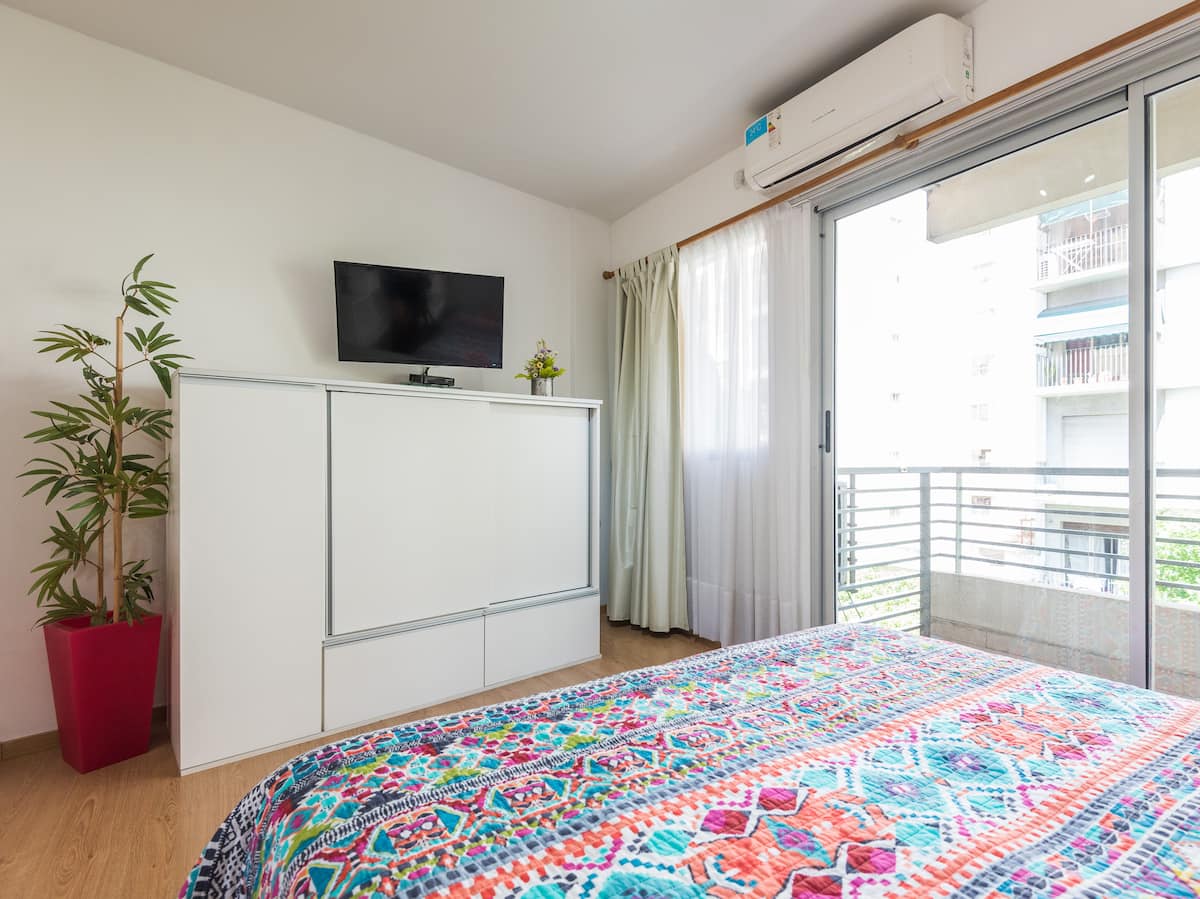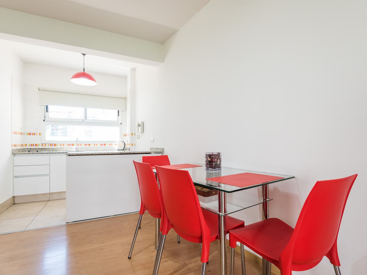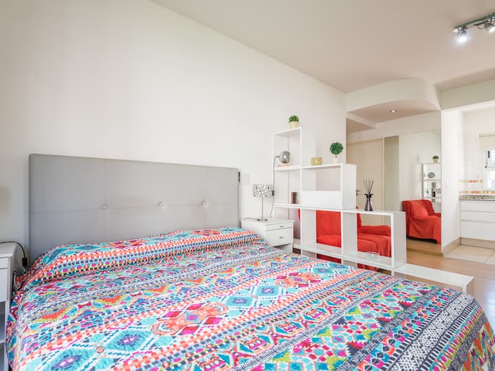 Apartamento em Caballito, a poucos metros da Av. Rivadavia. Ambiente único com área de estar, mesa com cadeiras e duas camas de solteiro que se unem formando uma cama de casal. Banheiro completo com banheira e bidê. Cozinha separada por um balcão com geladeira, micro-ondas, fogão e forno elétrico, além de varanda de frente. O prédio tem área de churrasco e solário.