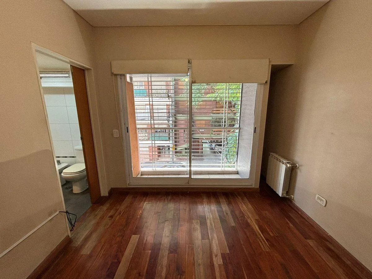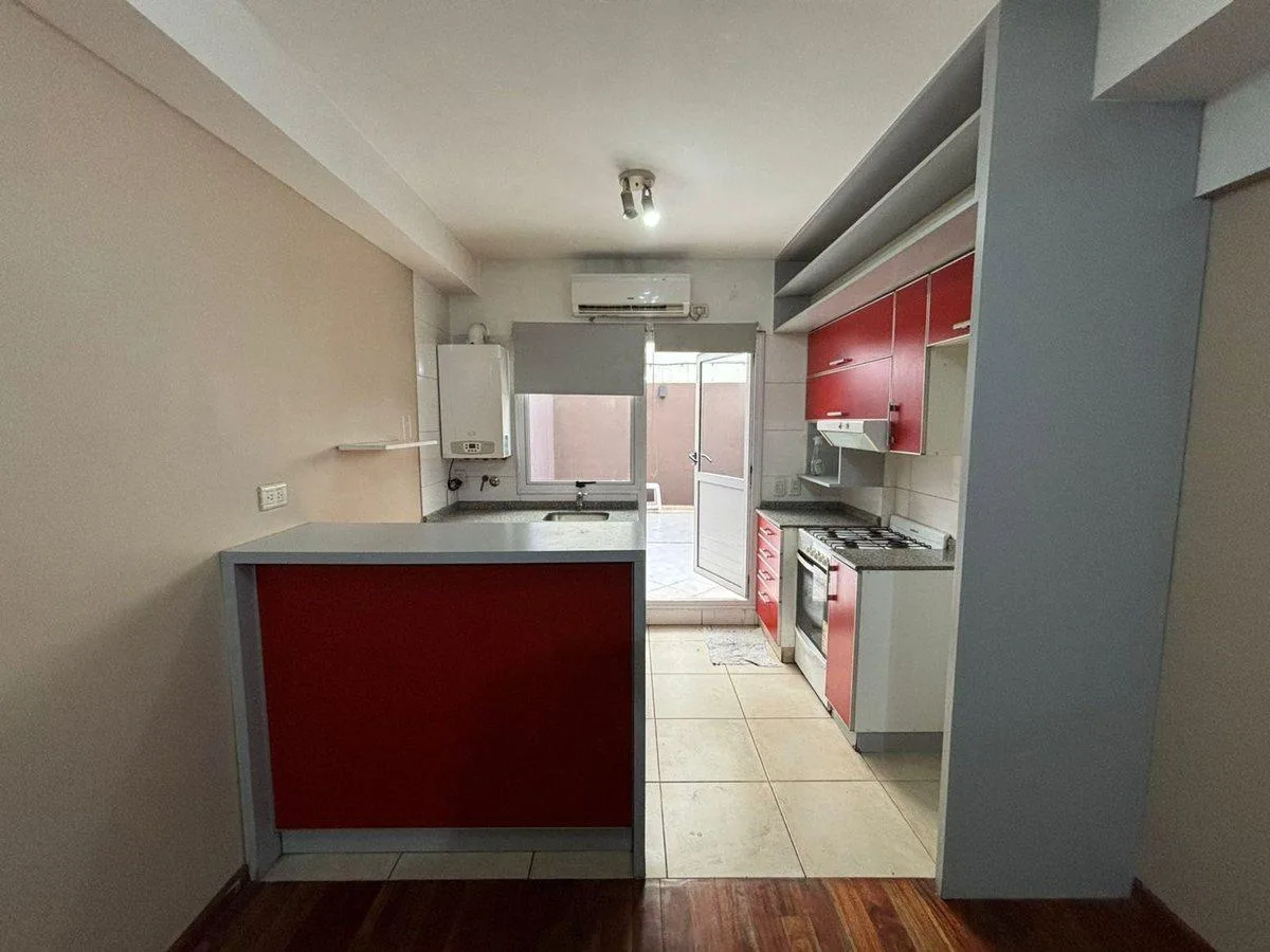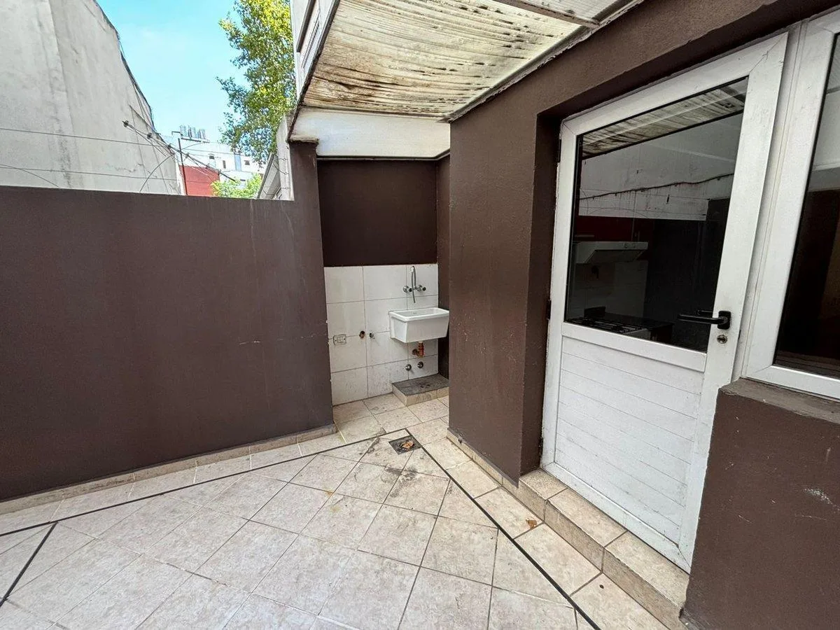 Kitnet em Caballito com pátio descoberto. A unidade tem setor de dormitório com armário embutido, banheiro completo e cozinha integrada com espaço para geladeira e área de armazenamento. A cozinha é descrita como equipada, com móveis no setor de living.