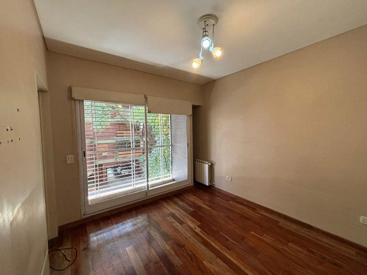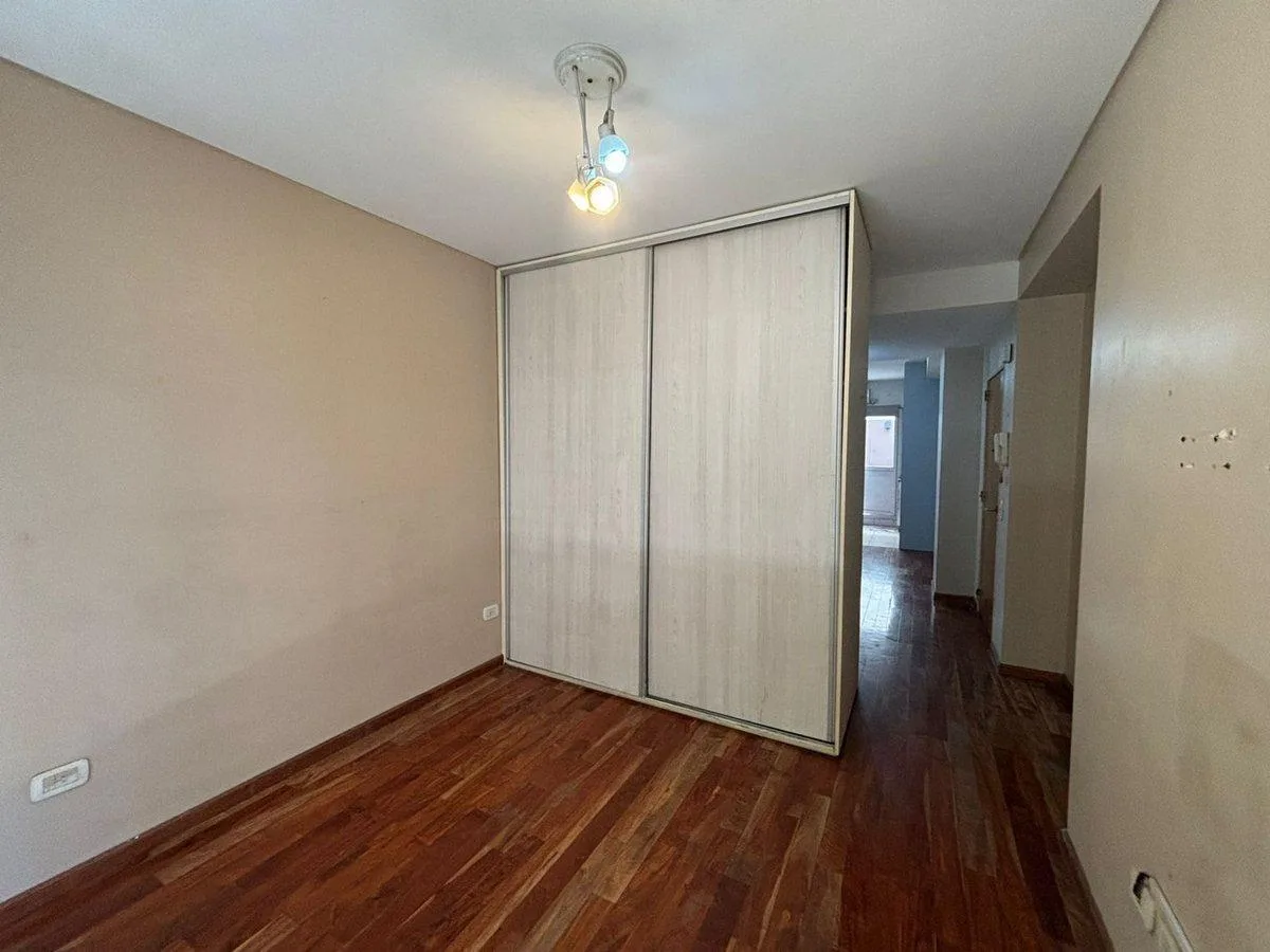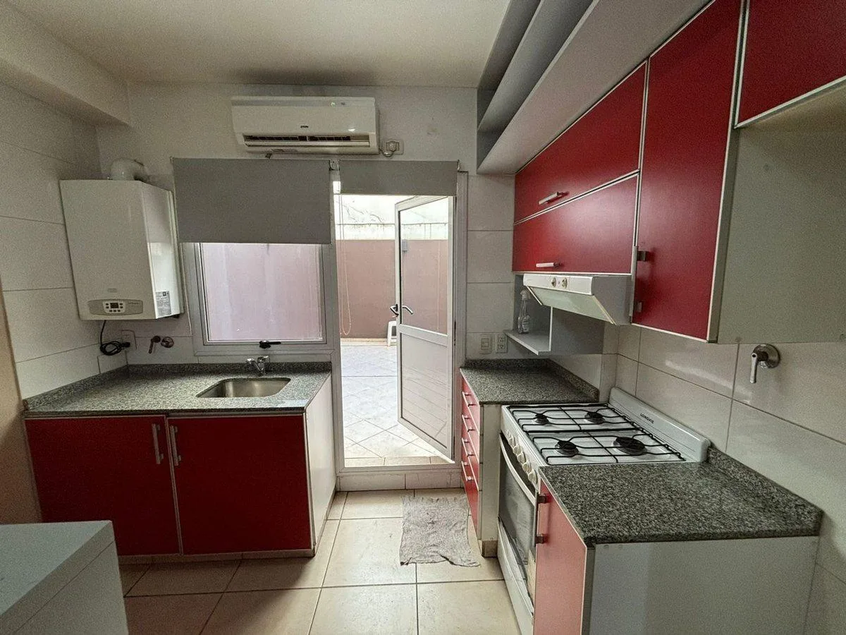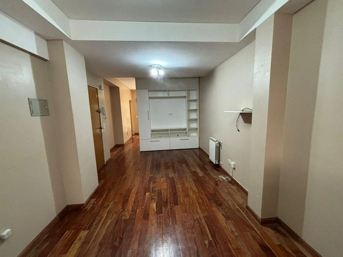 Kitnet em Caballito com pátio descoberto. A unidade tem setor de dormitório com armário embutido, banheiro completo e cozinha integrada com espaço para geladeira e área de armazenamento. A cozinha é descrita como equipada, com móveis no setor de living.