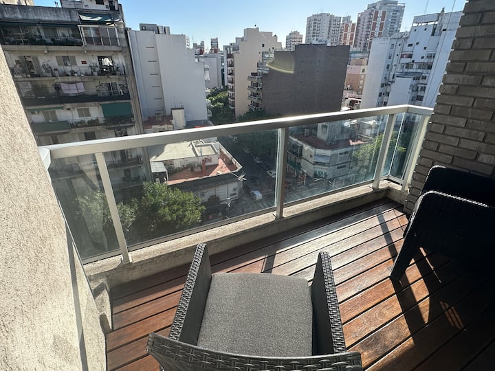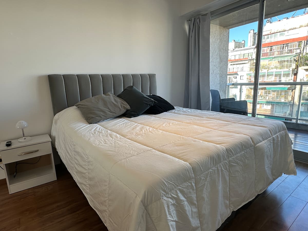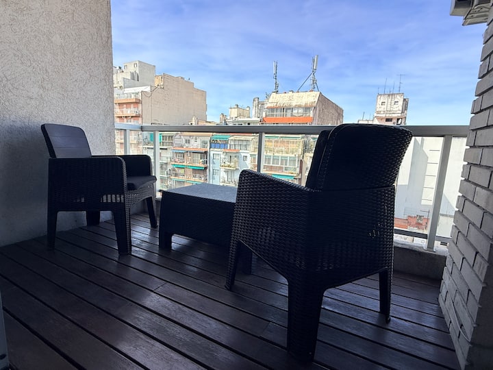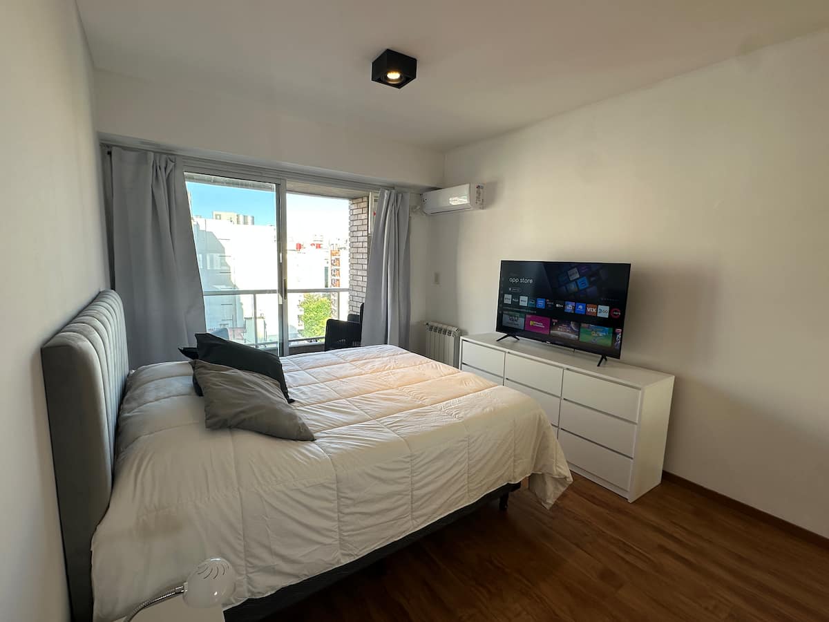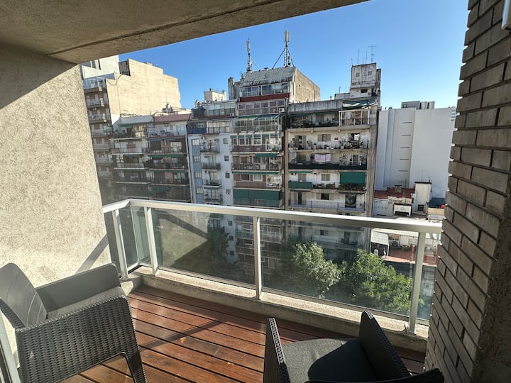 Kitnet de 35 m² em Caballito, com cama queen que pode ser configurada em 2 camas de solteiro. Possui cozinha equipada com micro-ondas e chaleira elétrica, TV de 50", WiFi de 300MG, ar-condicionado e aquecimento por caldeira italiana com radiadores. Banheiro com banheira e bidê; varanda envidraçada com assentos e vista ampla da cidade.