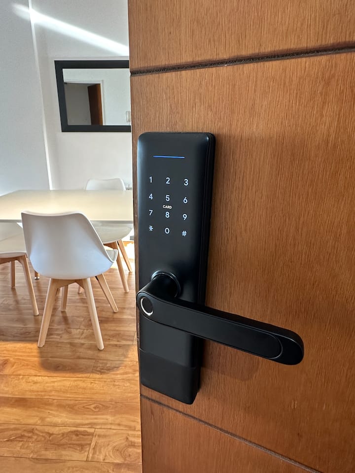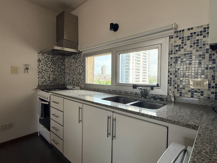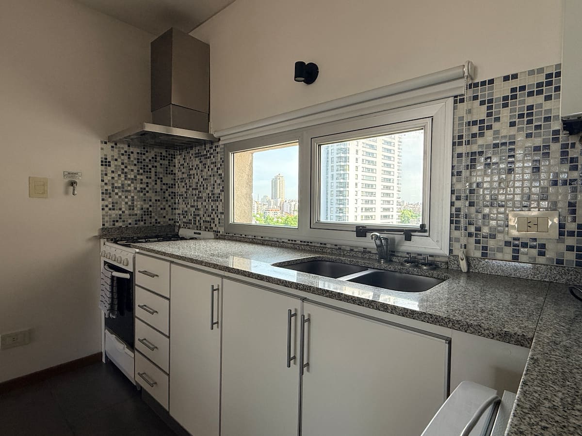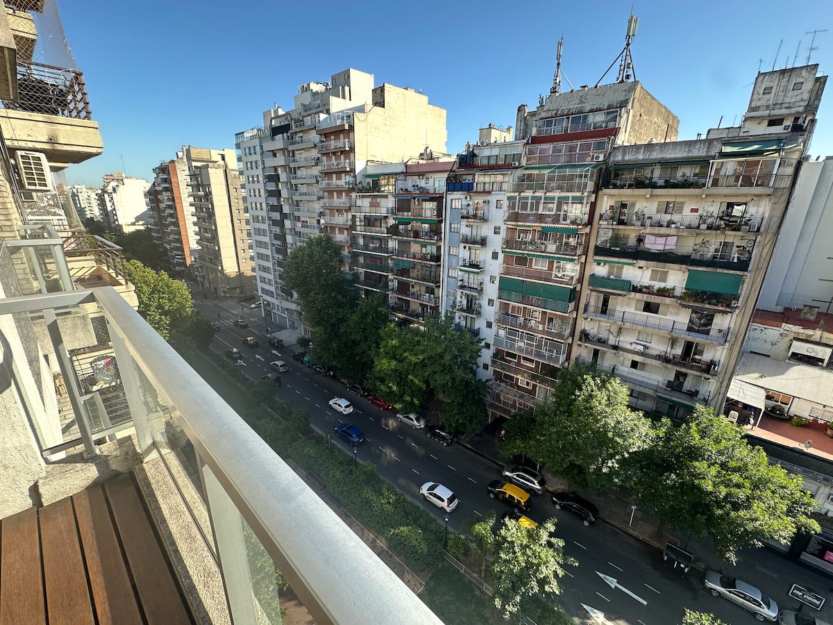 Kitnet de 35 m² em Caballito, com cama queen que pode ser configurada em 2 camas de solteiro. Possui cozinha equipada com micro-ondas e chaleira elétrica, TV de 50", WiFi de 300MG, ar-condicionado e aquecimento por caldeira italiana com radiadores. Banheiro com banheira e bidê; varanda envidraçada com assentos e vista ampla da cidade.