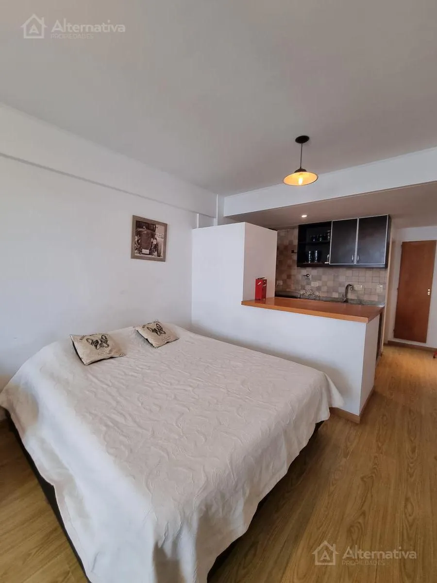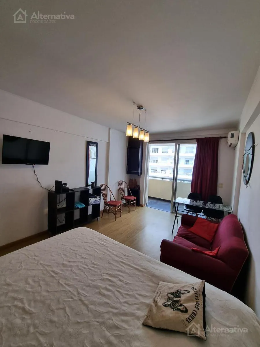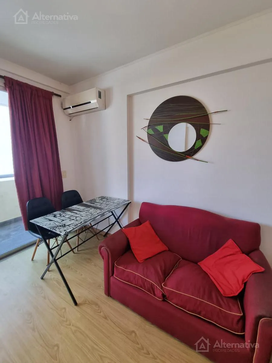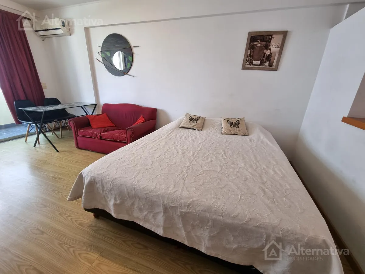 Kitnet mobiliado em Caballito, com 1 ambiente. O living conta com mesa e 4 cadeiras, sofá de dois lugares, rack com TV, ar-condicionado, Wi-Fi e acesso à varanda com vista para o contrafrente. A cozinha é semintegrada, com geladeira com freezer, fogão de 4 bocas e forno, além de chaleira elétrica. O setor de dormitório tem sommiers de casal. Banheiro privativo completo com banheira. O preço inclui condomínio e serviços com limite de consumo; o imóvel é entregue com roupas de cama (blanquería).
