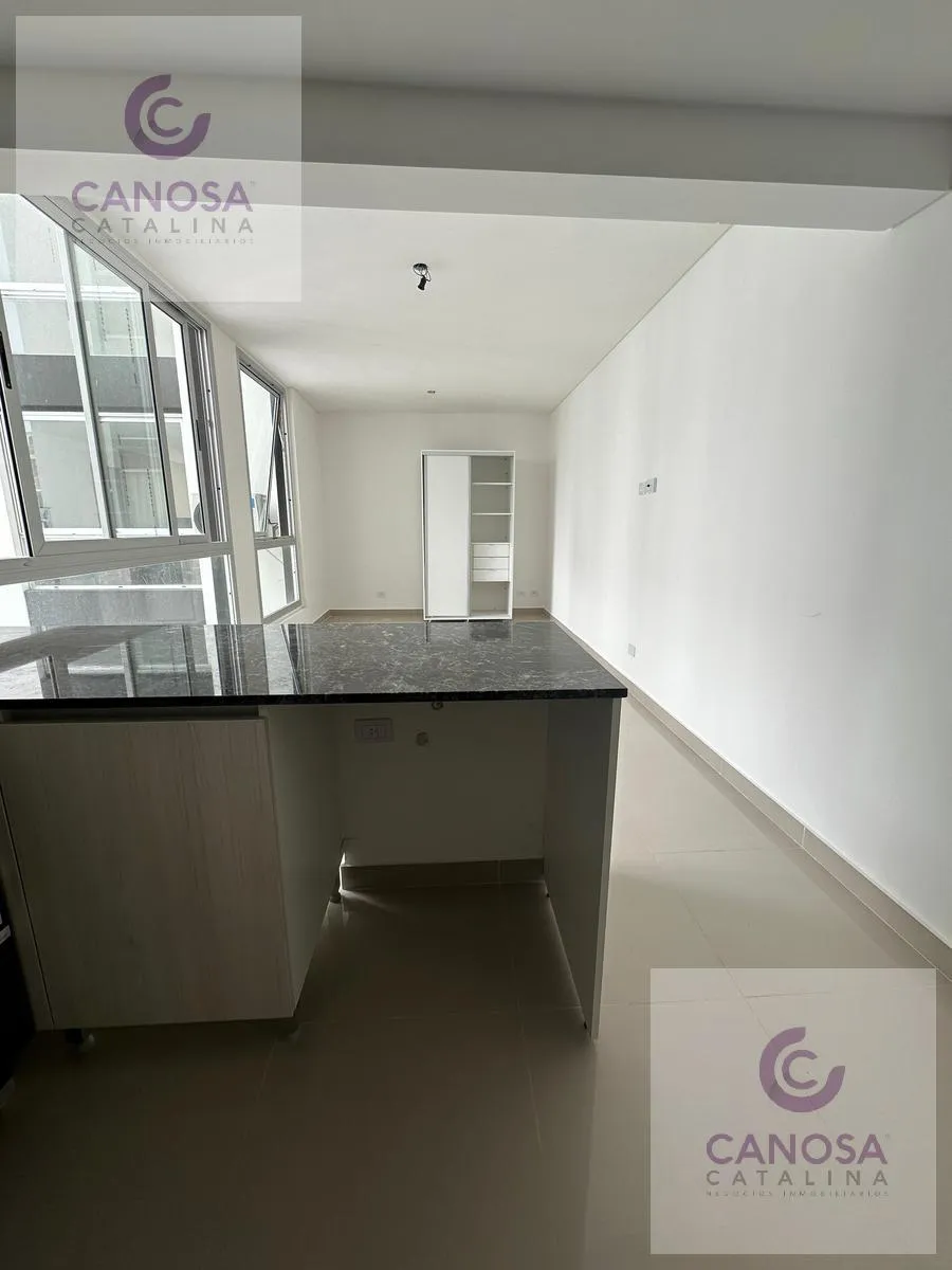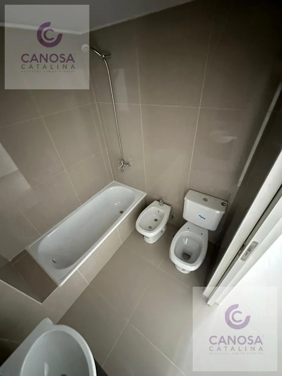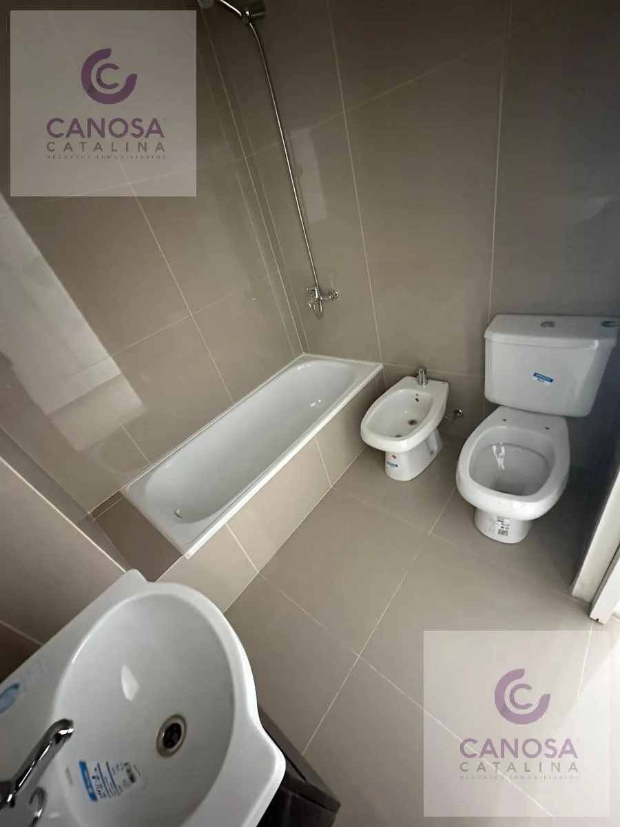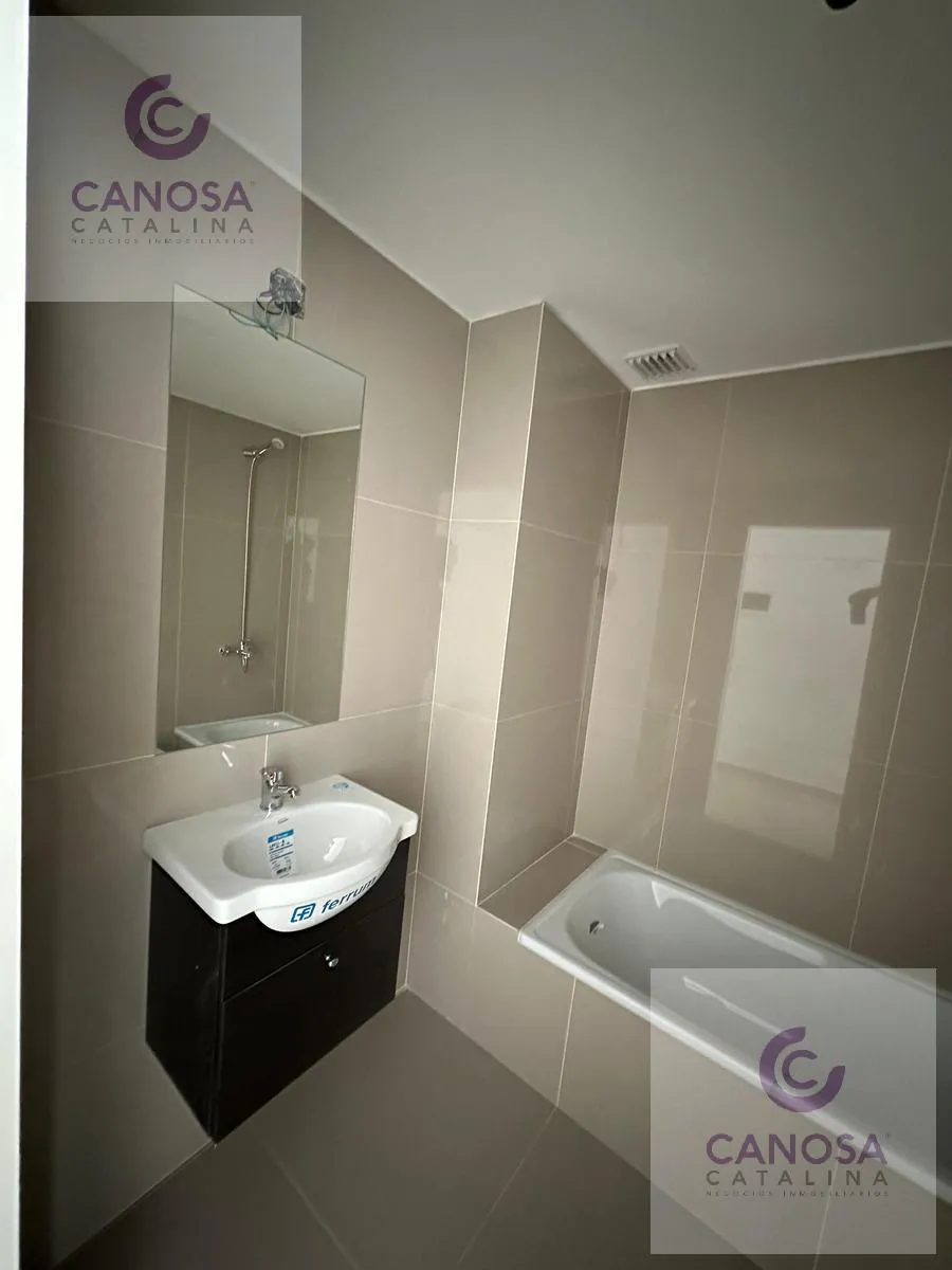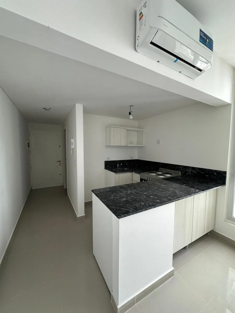 Kitnet novo em Caballito, com 30 m², no 6º andar, com vista para o miolo de quadra. Possui 1 banheiro completo com banheira e cozinha integrada à área de estar/refeições, com móveis sob a bancada e armários superiores, fogão e espaço para lavadora de carga frontal. Inclui ar-condicionado frio e quente inverter. O edifício tem elevador e, no piso 12, salão de festas, área de churrasco e terraço. Não há vaga de garagem própria. Para a entrada no aluguel, são solicitados 1 mês de aluguel de $490.00
