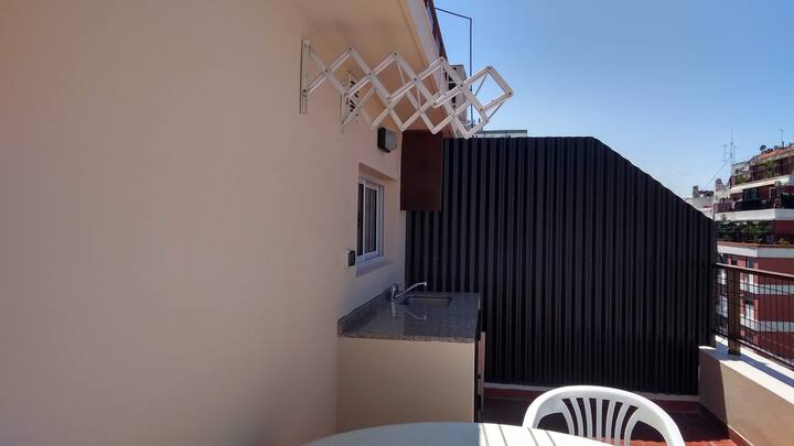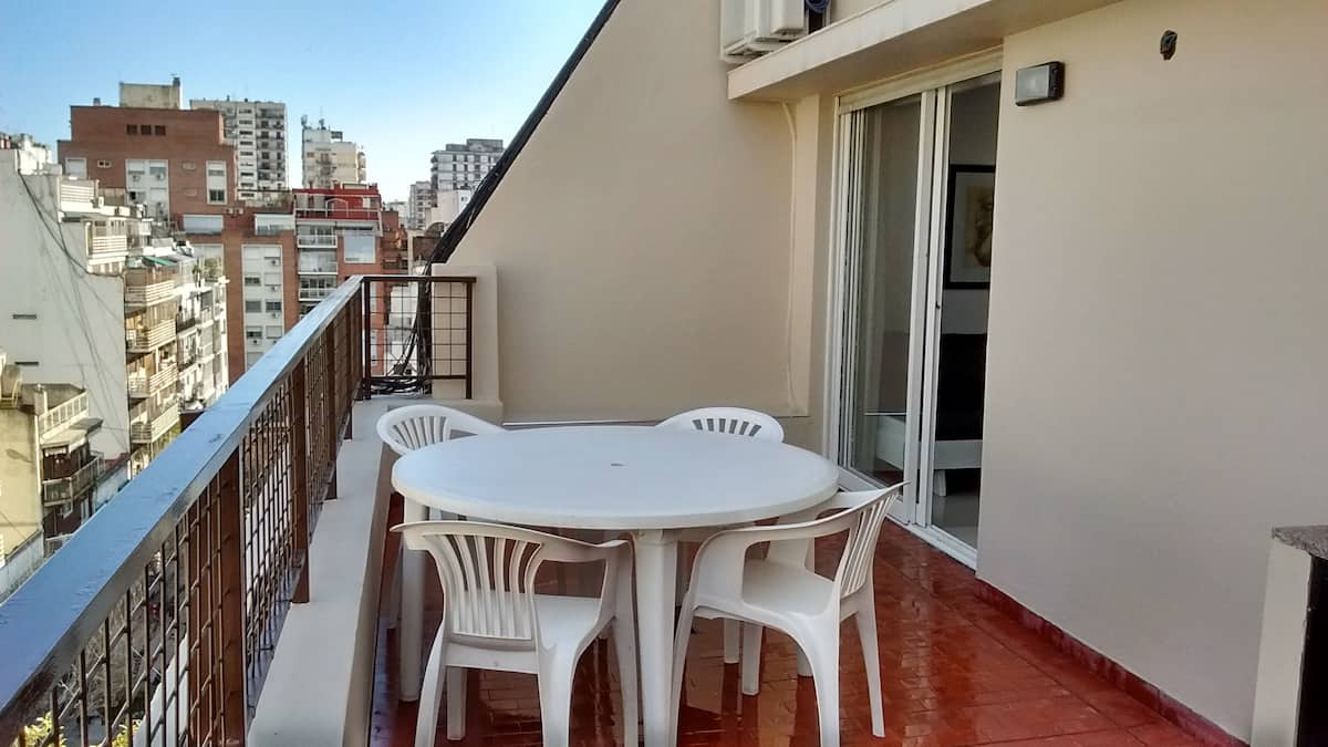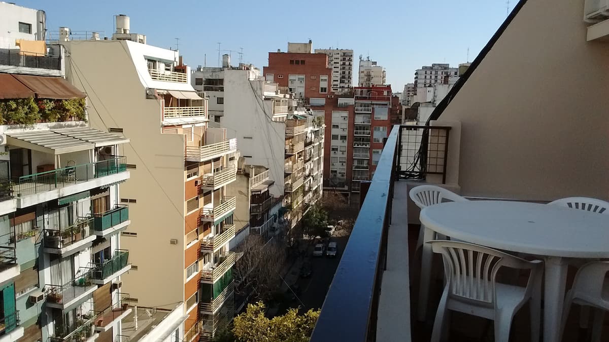 Estúdio com área de dormir separada, sala, espaço para refeições, armários e 1 banheiro completo, além de cozinha separada. O apartamento tem varanda/terraço com vista de rua para Caballito. A cozinha vem com geladeira com congelador, micro-ondas, cafeteira, torradeira e chaleira elétrica, além de TV a cabo e Wi‑Fi; há ar-condicionado quente/frio. Limpeza semanal inclui troca de lençóis e toalhas; não são aceitas crianças, nem pets, festas ou fumo dentro do imóvel, permitido apenas na varanda/te