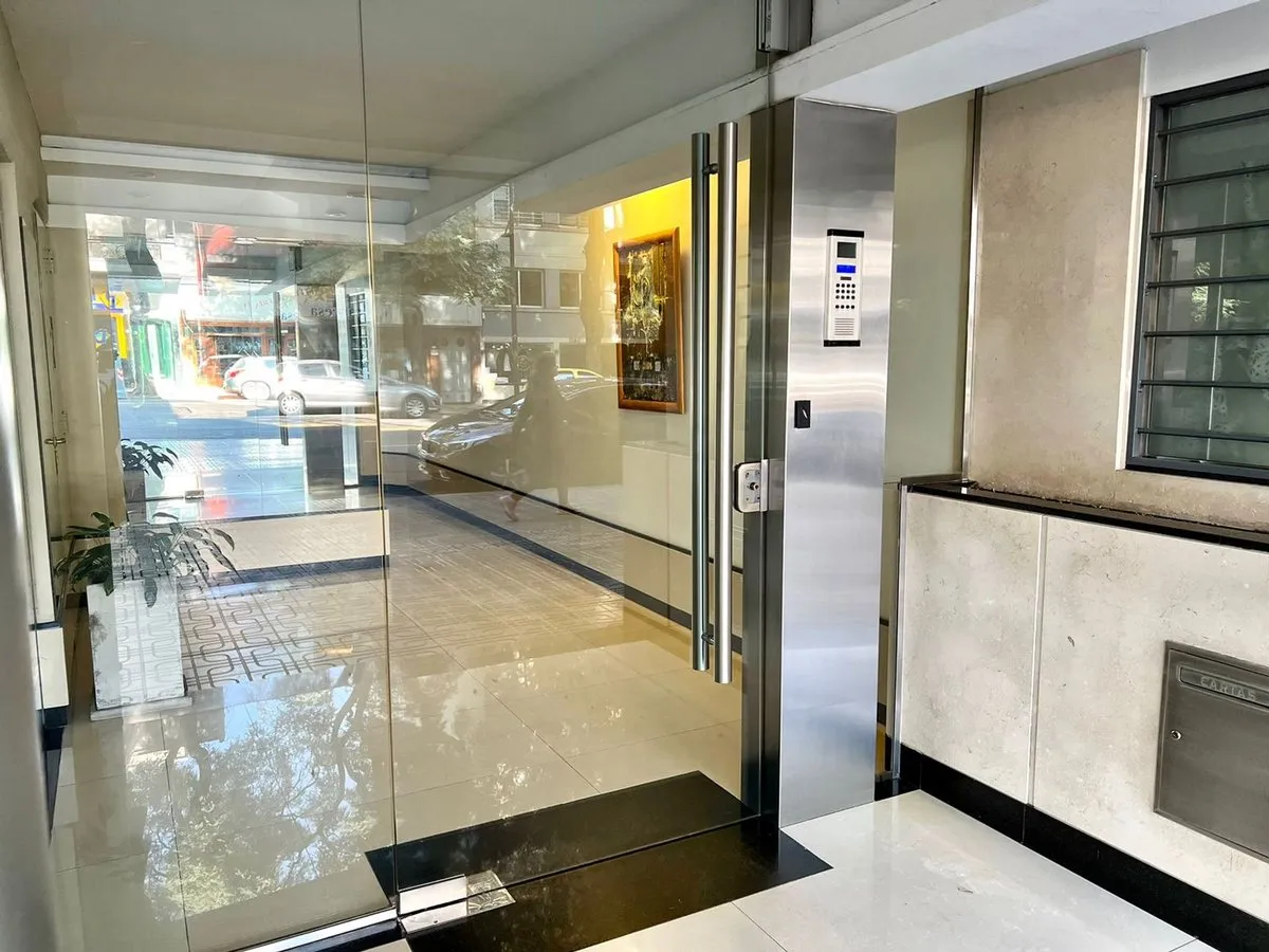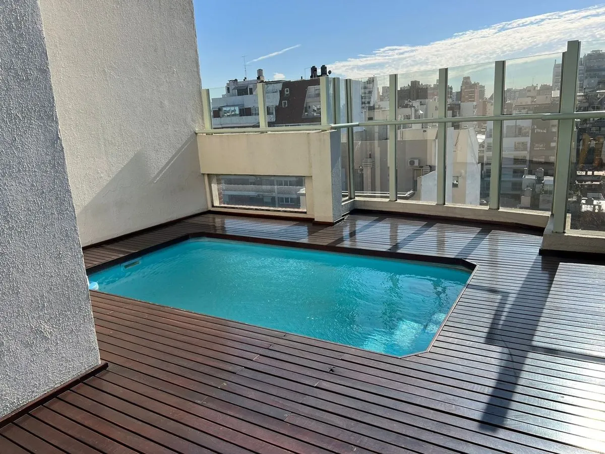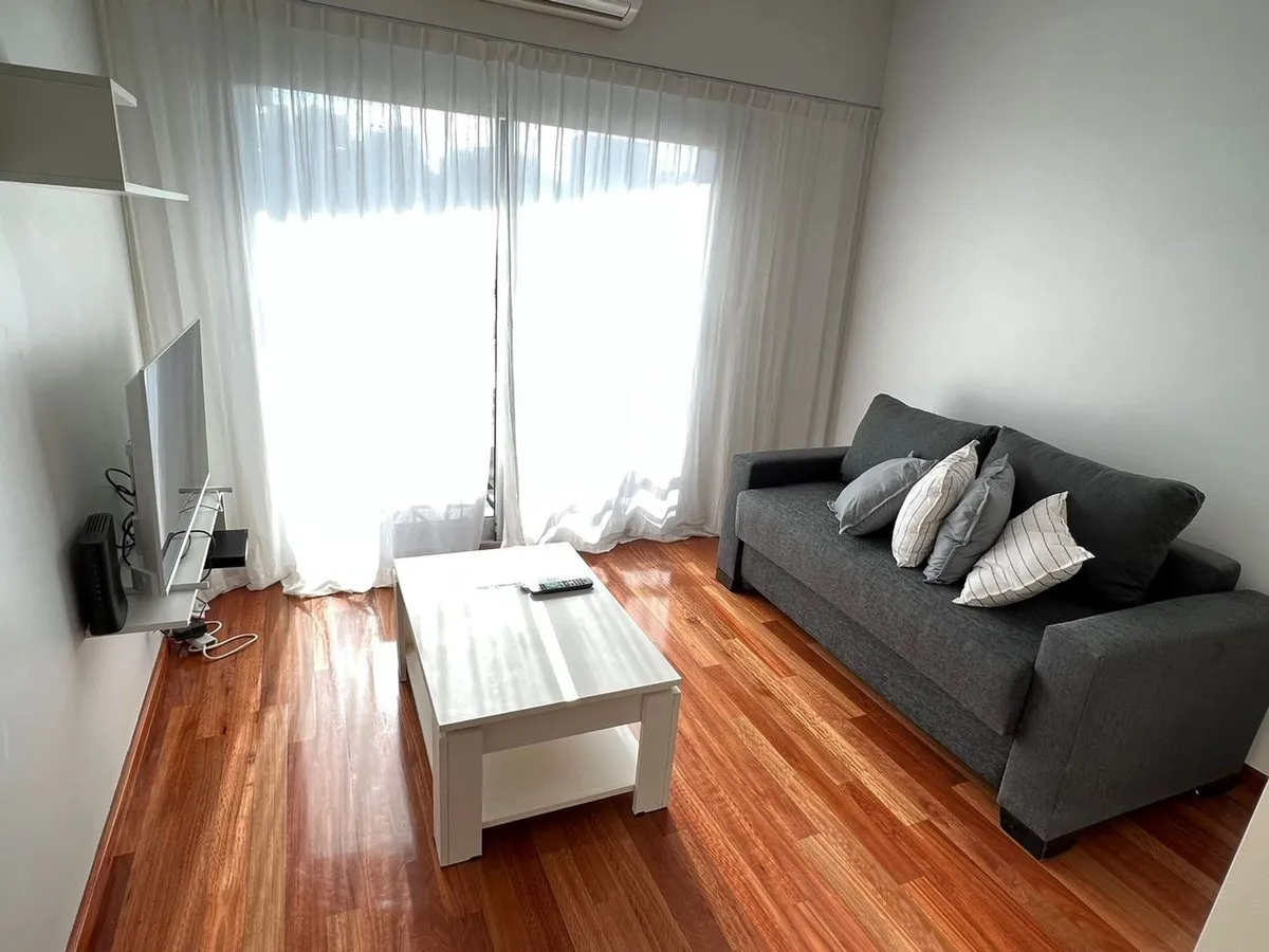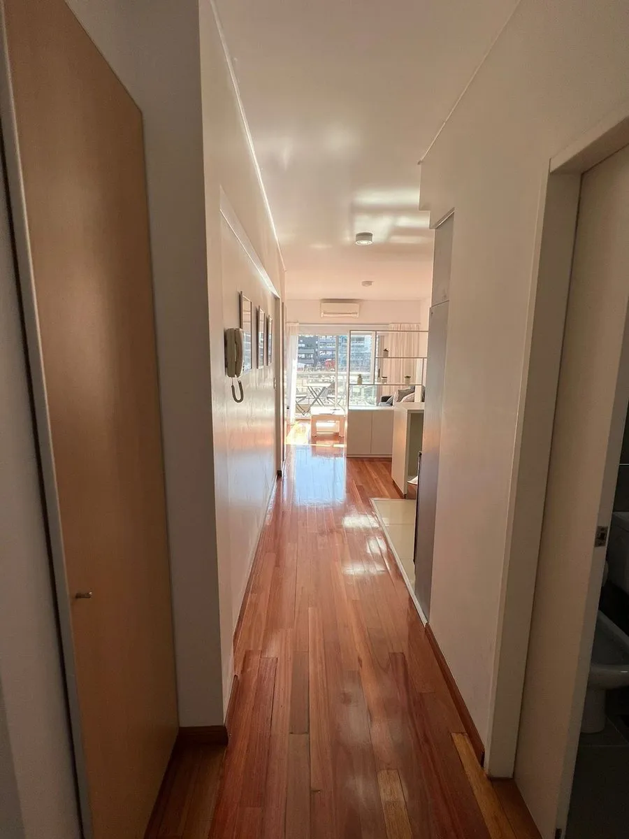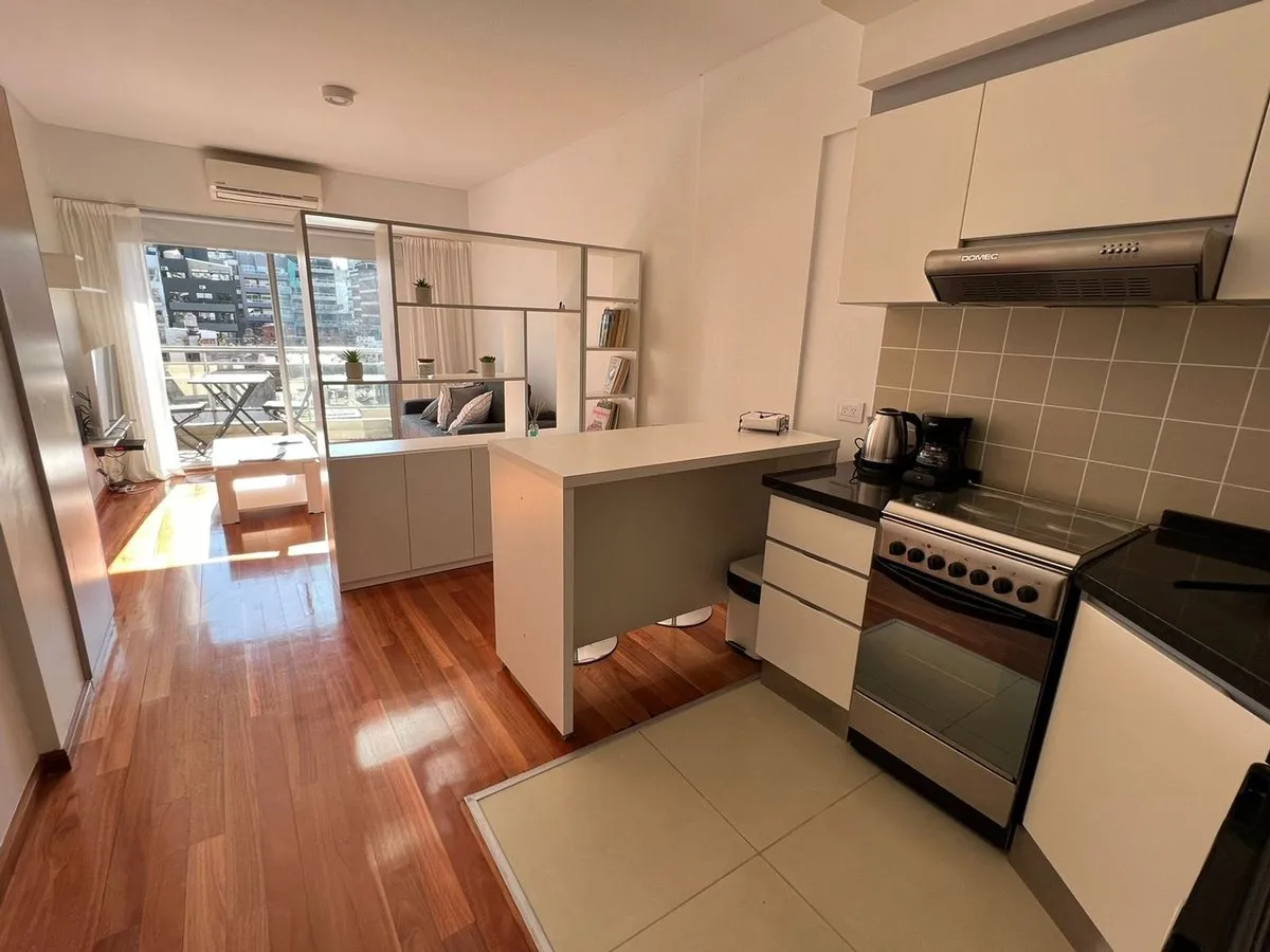 Kitnet mobiliada em Caballito, no 4º andar de um prédio com 7 andares, com orientação norte e vista de fundos (contrafrente). A unidade é elétrica, com ar-condicionado frio e quente instalado, pisos de madeira e porcelanato, banheiro com banheira e luz natural, cozinha integrada com barra, armários e geladeira pequena; há fogão elétrico com forno e 4 bocas (sem gás), além de 2 armários embutidos. O prédio dispõe de piscina, lavanderia e área de churrasco de uso comum; a unidade tem varanda (3 x