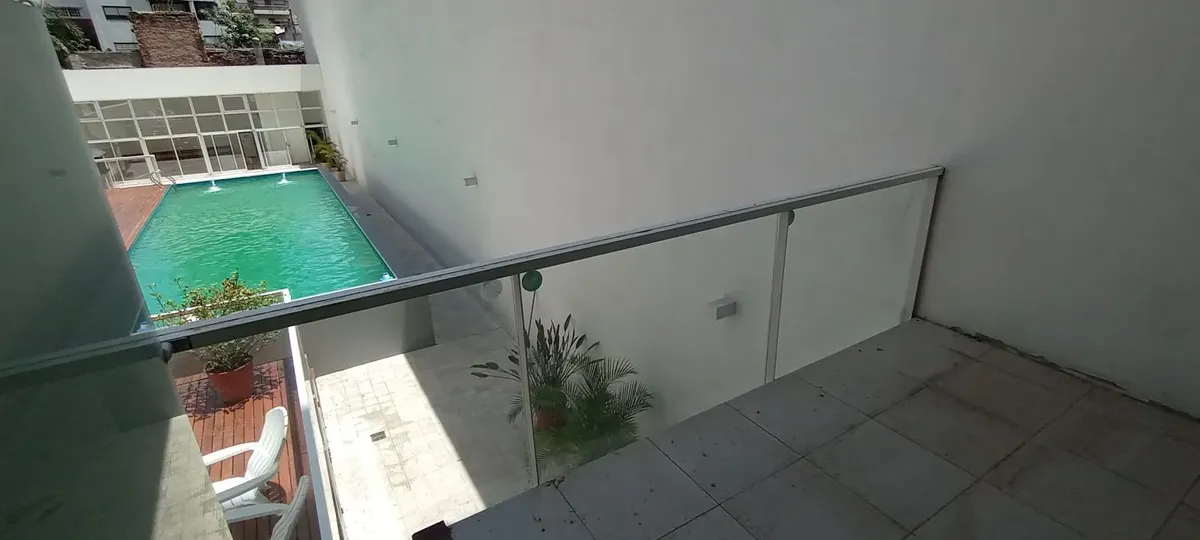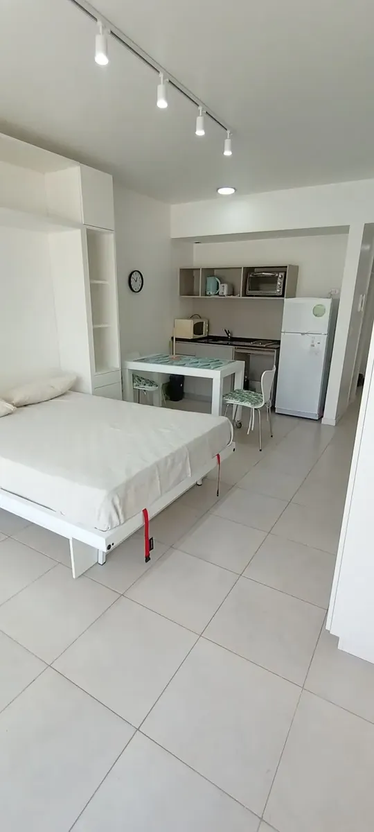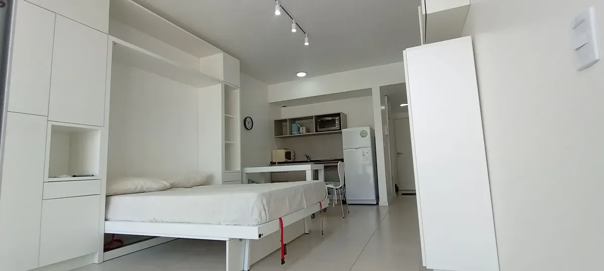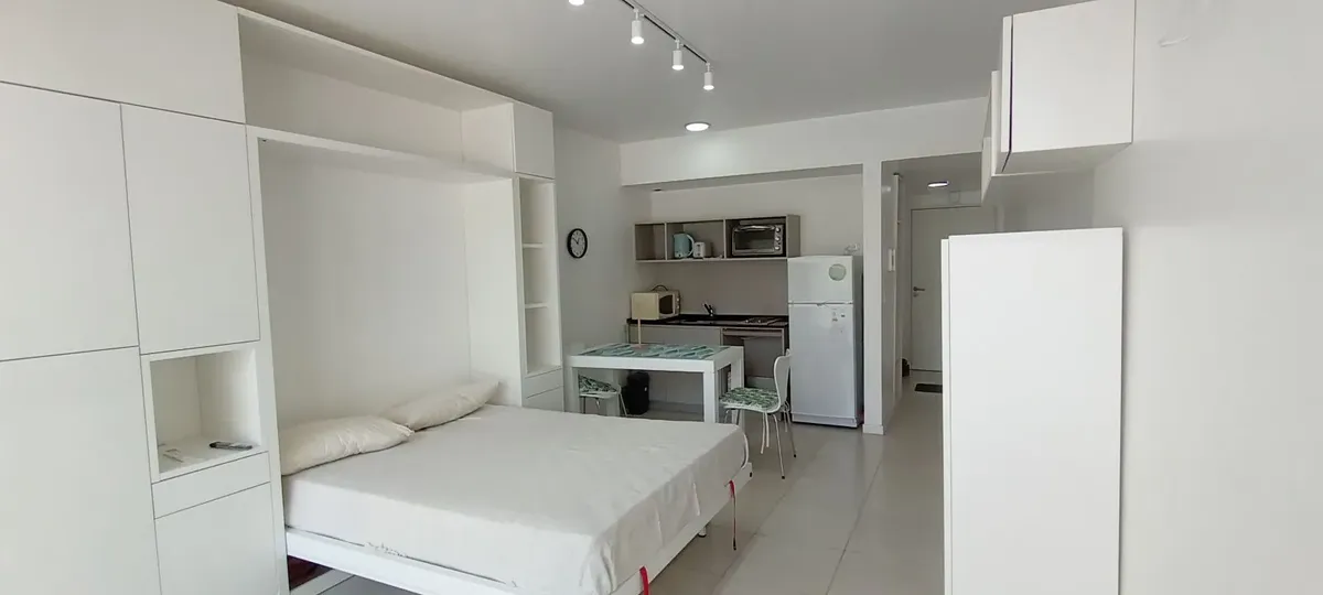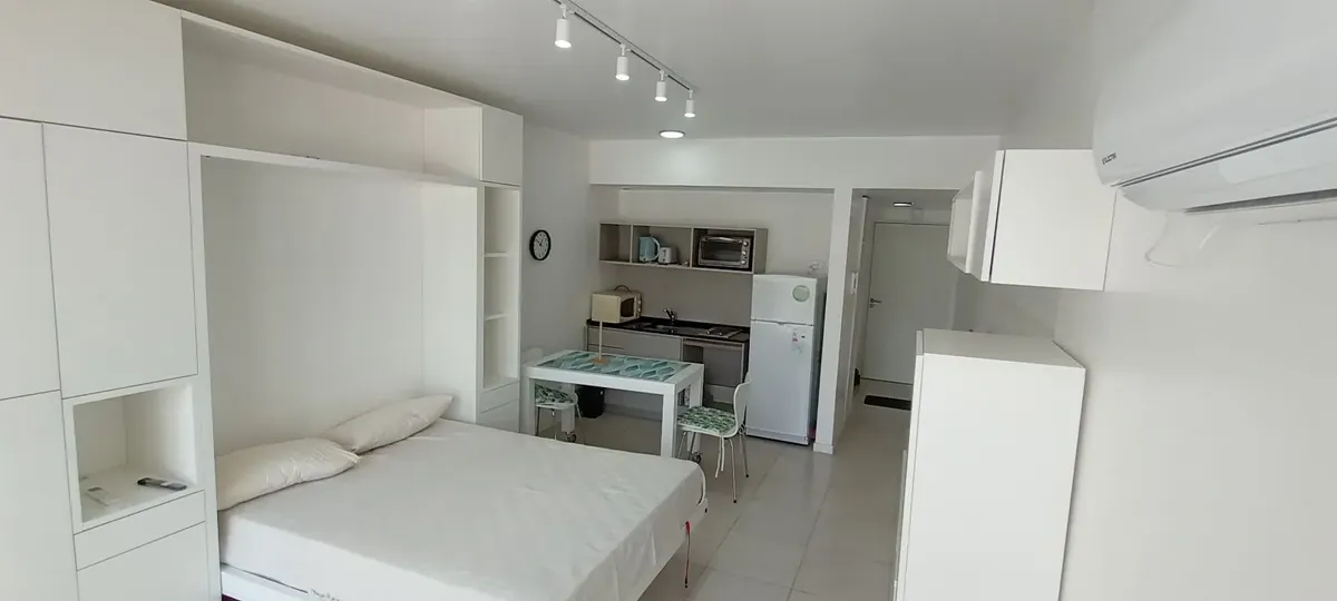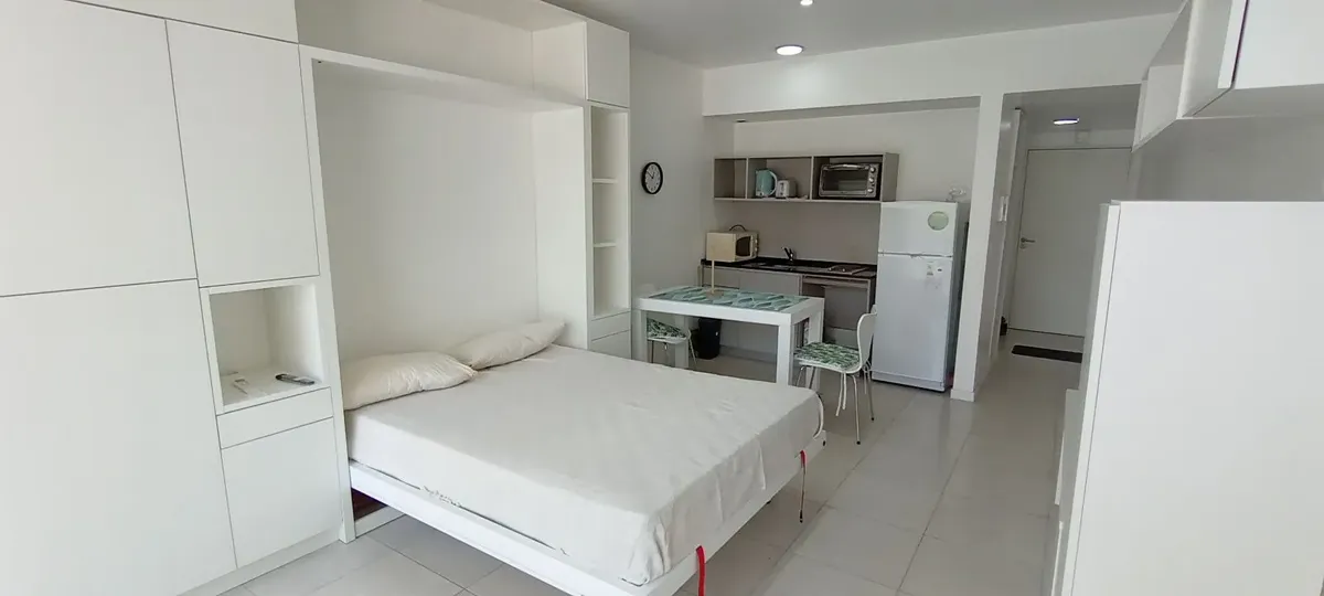Kitnet de um ambiente com varanda de fundos, voltada para o contrafrente, com 1 banheiro completo. Cozinha americana com fogão elétrico de 2 bocas e ar-condicionado split frio e quente. O apartamento é entregue mobiliado para até 2 pessoas e inclui cama de casal rebatível, móveis modulares, micro-ondas e geladeira com freezer. O prédio tem piscina, solarium, lavanderia e salão de festas com área de churrasco, além de estar a 3 quadras da Av. Rivadavia e próximo ao subte e linhas de ônibus.
