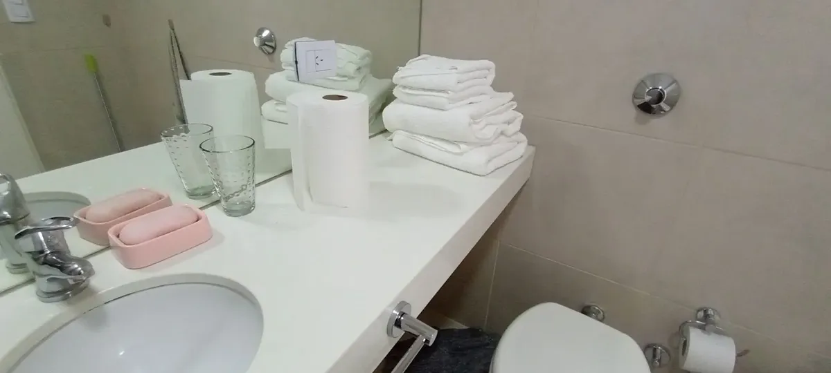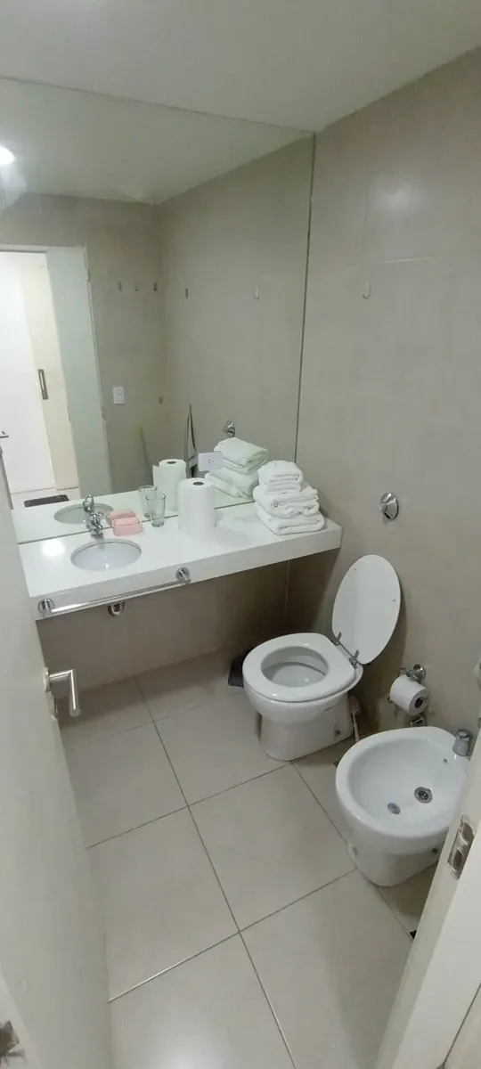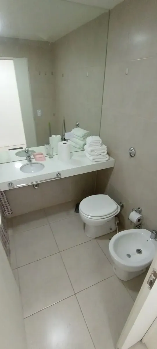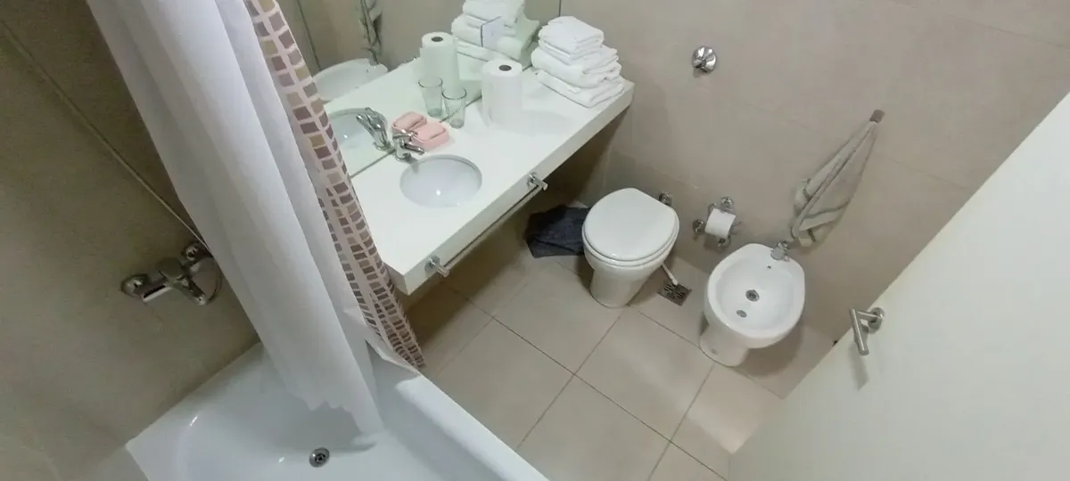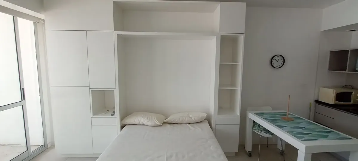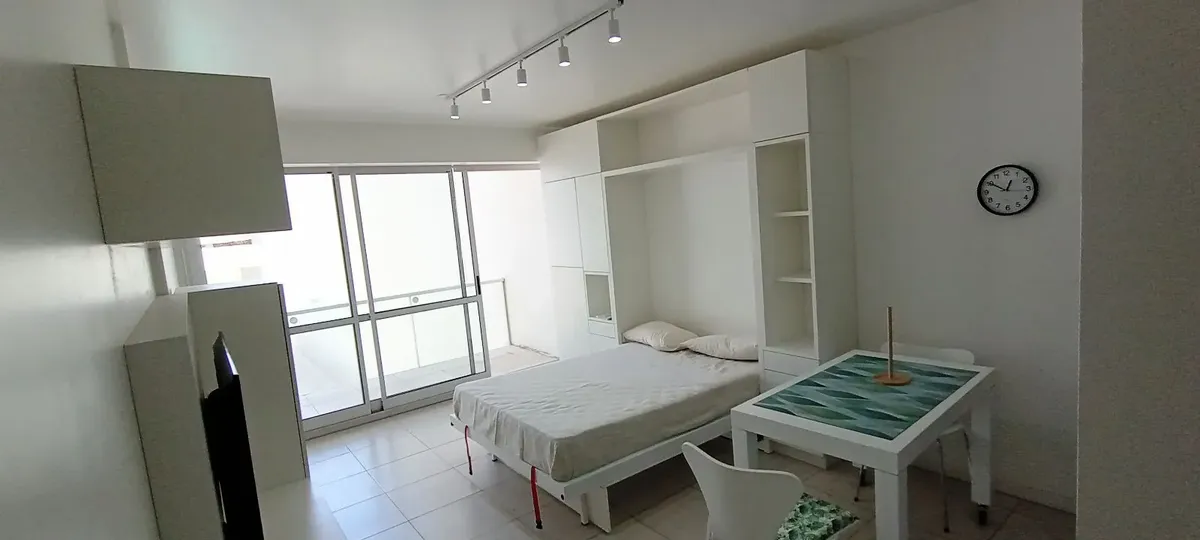 Kitnet de um ambiente com varanda de fundos, voltada para o contrafrente, com 1 banheiro completo. Cozinha americana com fogão elétrico de 2 bocas e ar-condicionado split frio e quente. O apartamento é entregue mobiliado para até 2 pessoas e inclui cama de casal rebatível, móveis modulares, micro-ondas e geladeira com freezer. O prédio tem piscina, solarium, lavanderia e salão de festas com área de churrasco, além de estar a 3 quadras da Av. Rivadavia e próximo ao subte e linhas de ônibus.