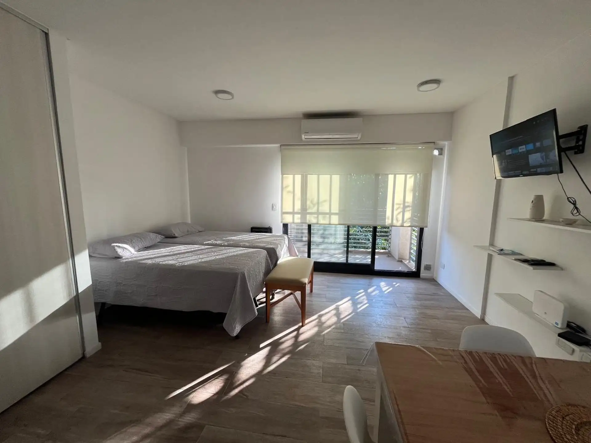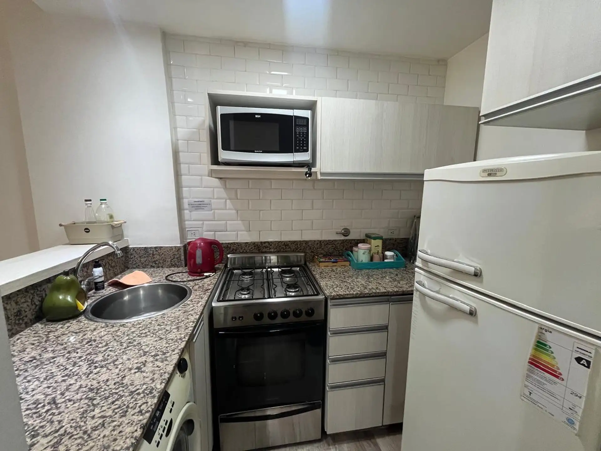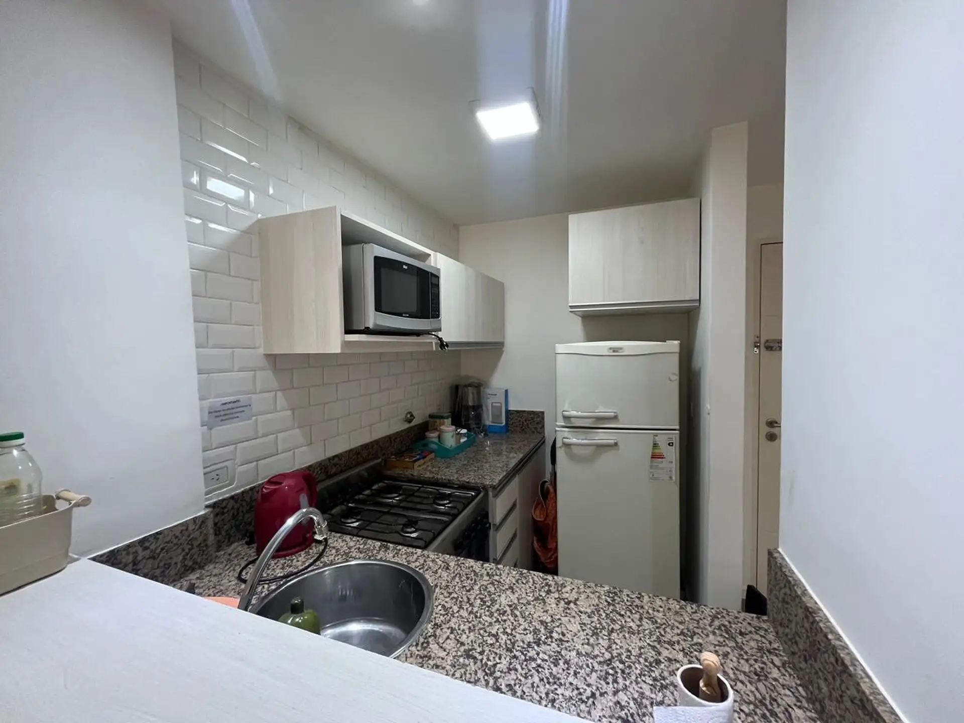 Apartamento de 1 ambiente com 6 m x 3,50 m, mobiliado e com armário embutido. Varanda de 3 m x 1,10 m, de frente para a rua. Possui ar-condicionado quente/frio e aquecedor; cozinha com armários na parte inferior e cristaleira, com área de lavanderia integrada. Banheiro completo com banheira. O prédio tem terraço de uso comum, área de churrasco e solarium.