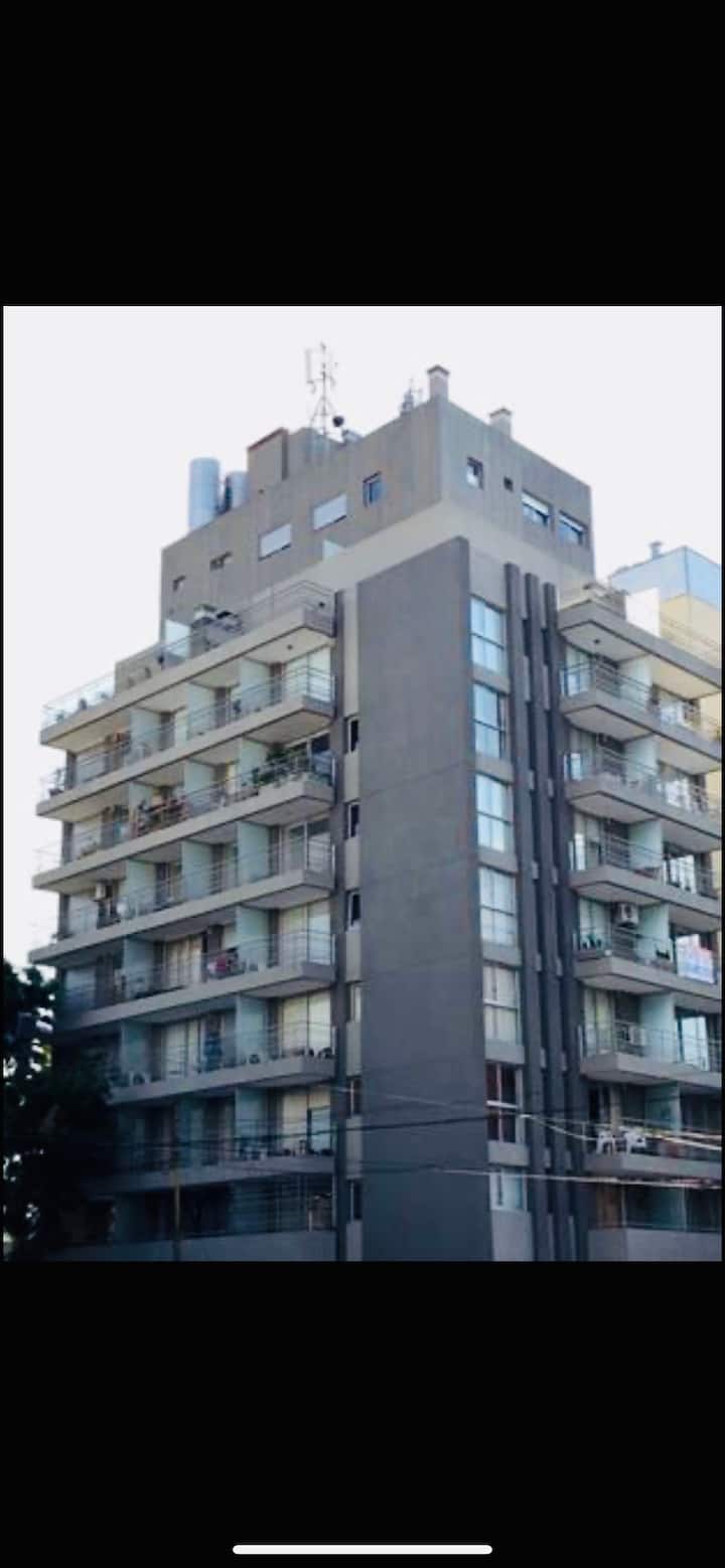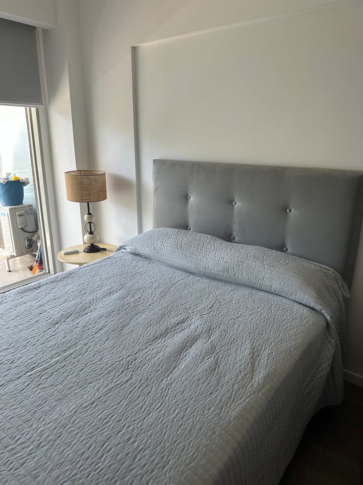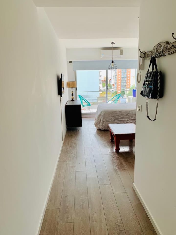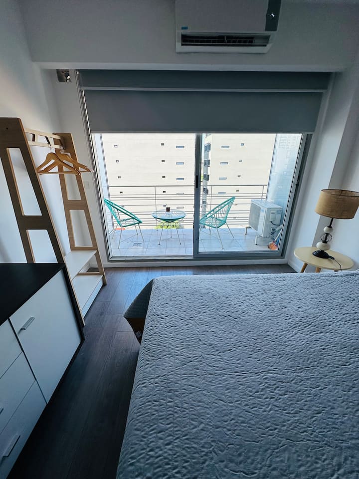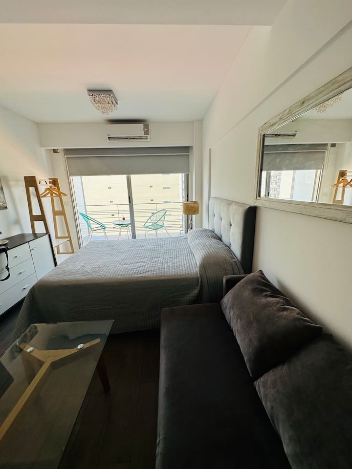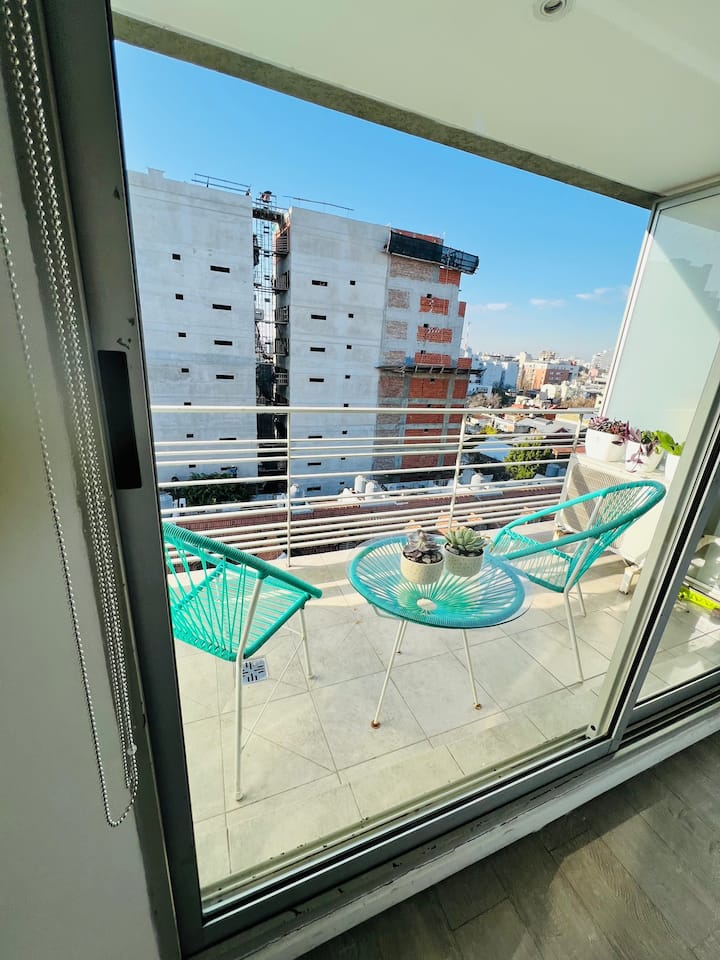 Apartamento de 1 ambiente em Chacarita, no 7º andar, com boa insolação e vista. Prédio novo e silencioso. O apartamento tem decoração minimalista e conta com recursos para estadias.