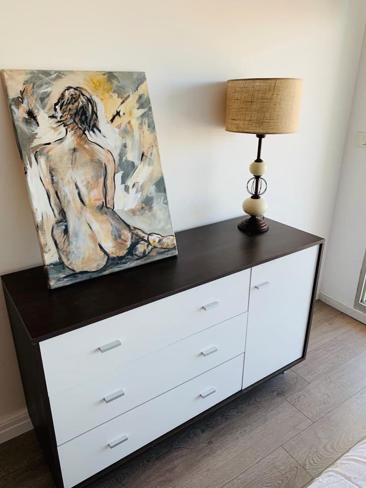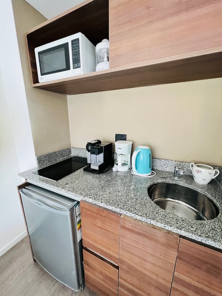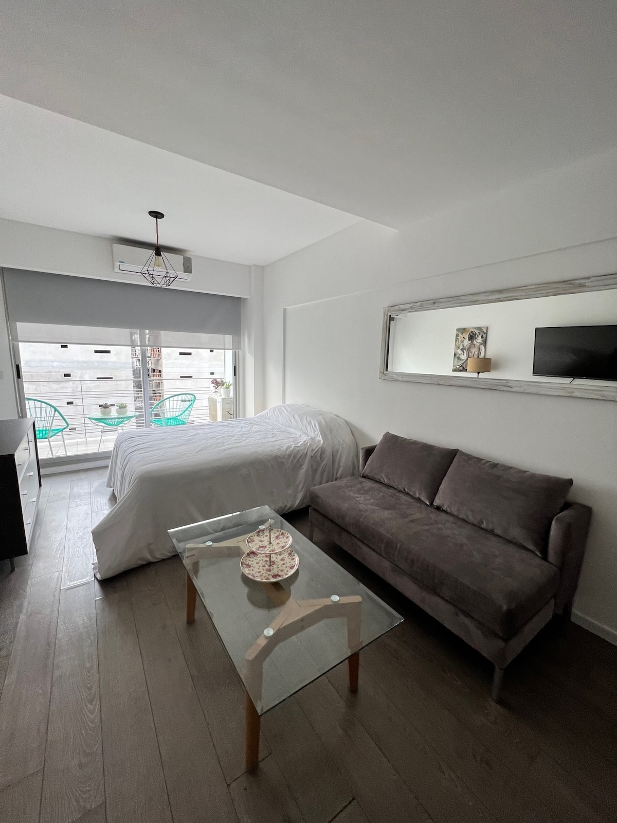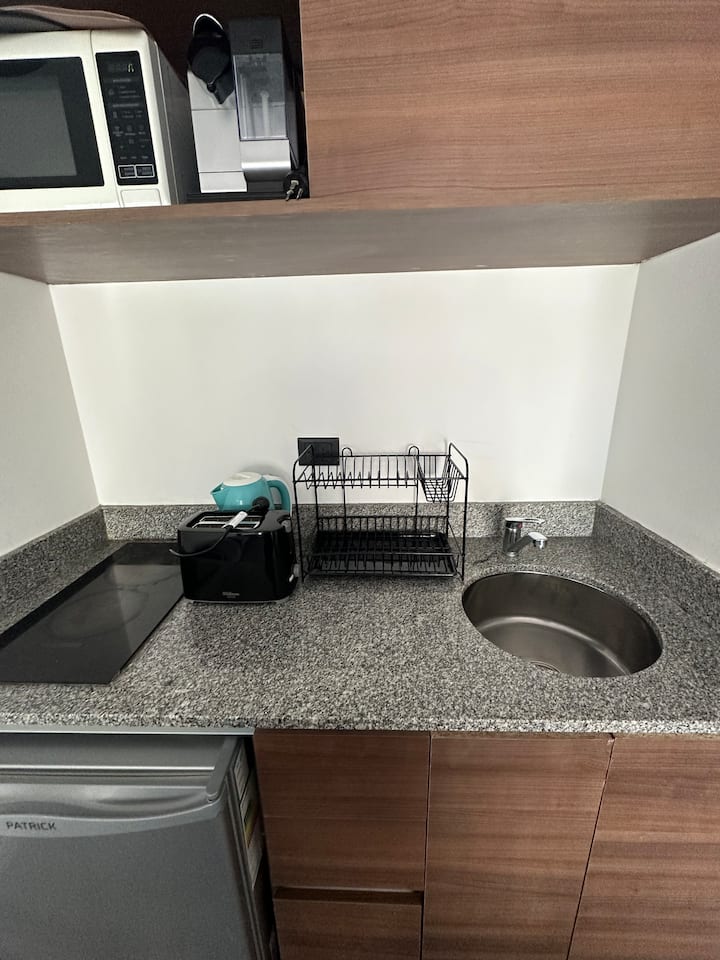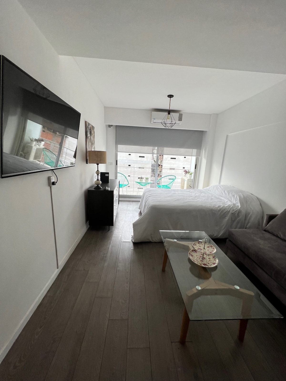 Apartamento de 1 ambiente em Chacarita, no 7º andar, com boa insolação e vista. Prédio novo e silencioso. O apartamento tem decoração minimalista e conta com recursos para estadias.