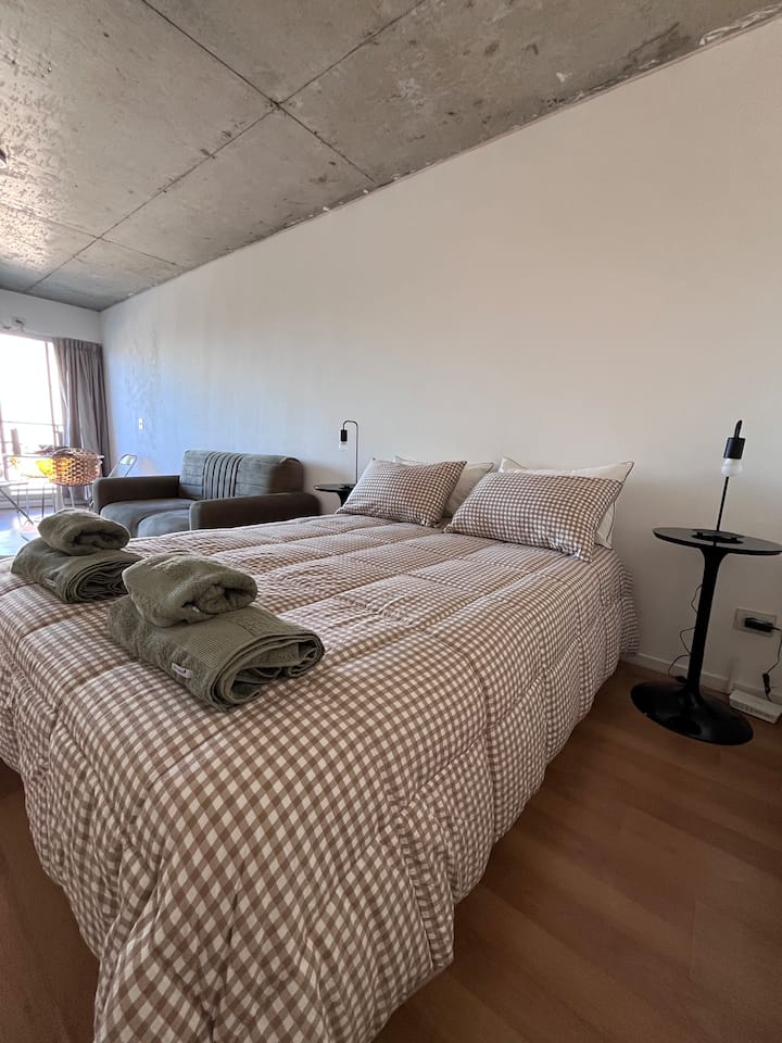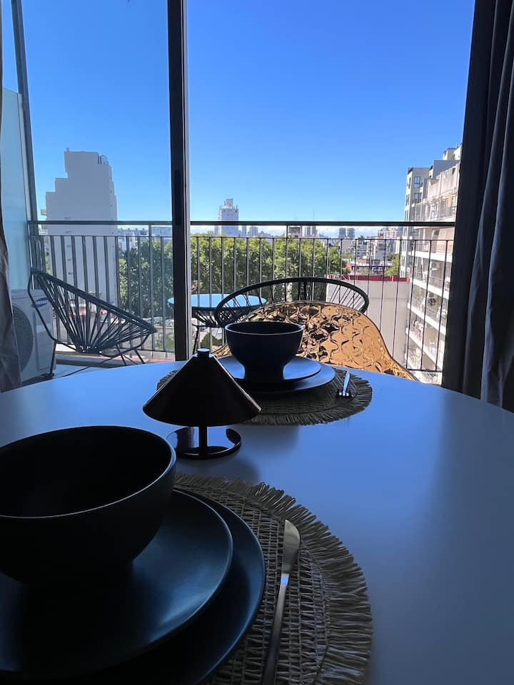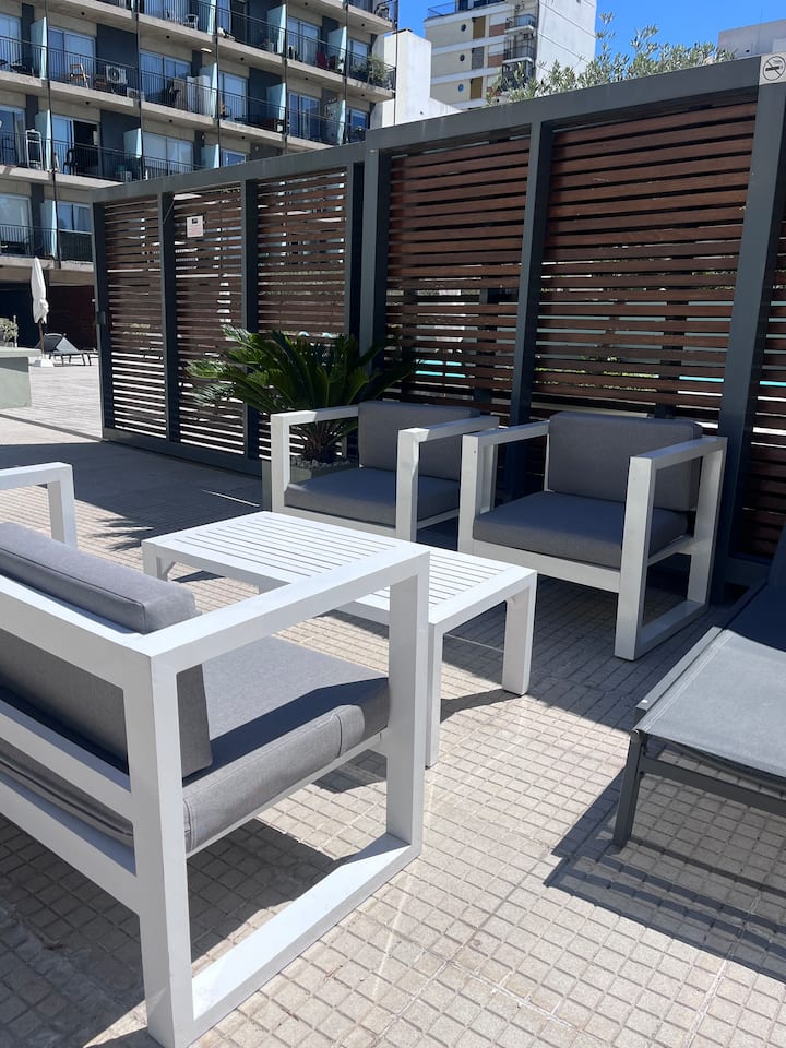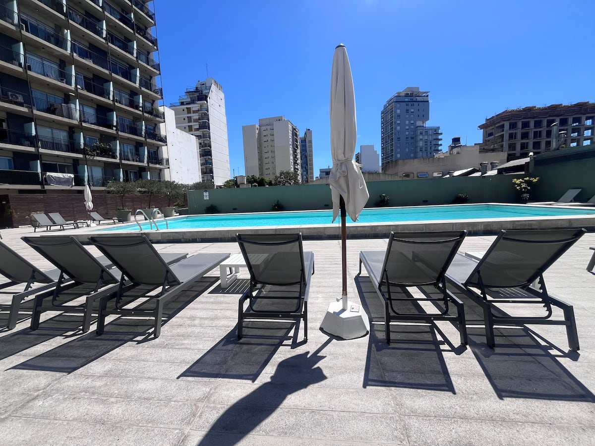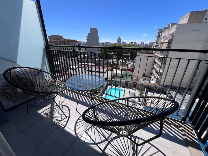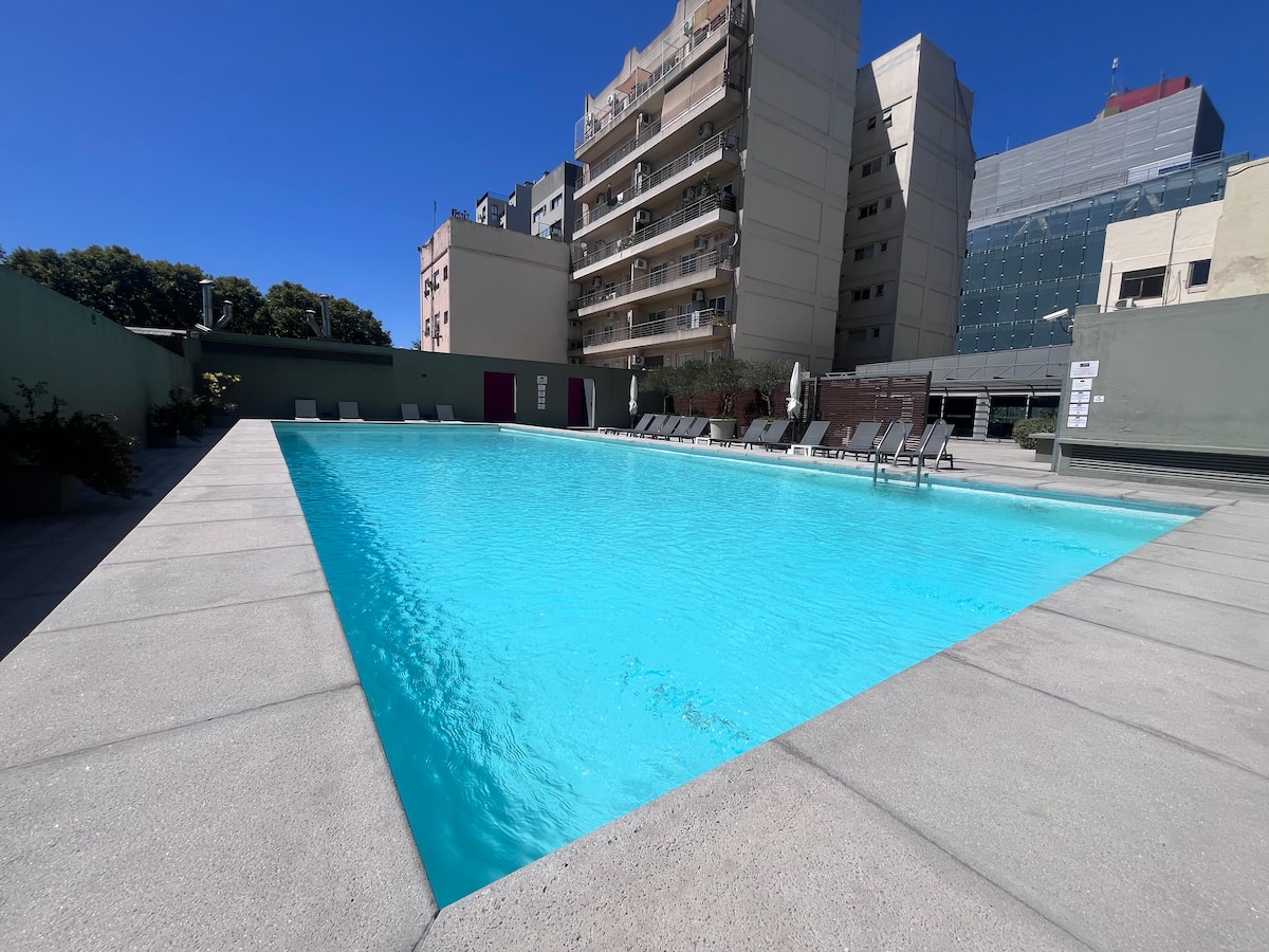 Apartamento premium em Chacarita. O prédio oferece piscina, academia e áreas verdes, além de segurança 24 horas. A localização fica a 2 blocos da Movistar Arena Buenos Aires e perto de linhas de ônibus e metrô.