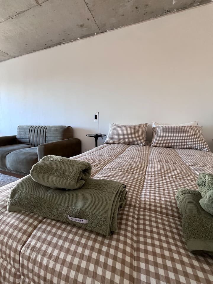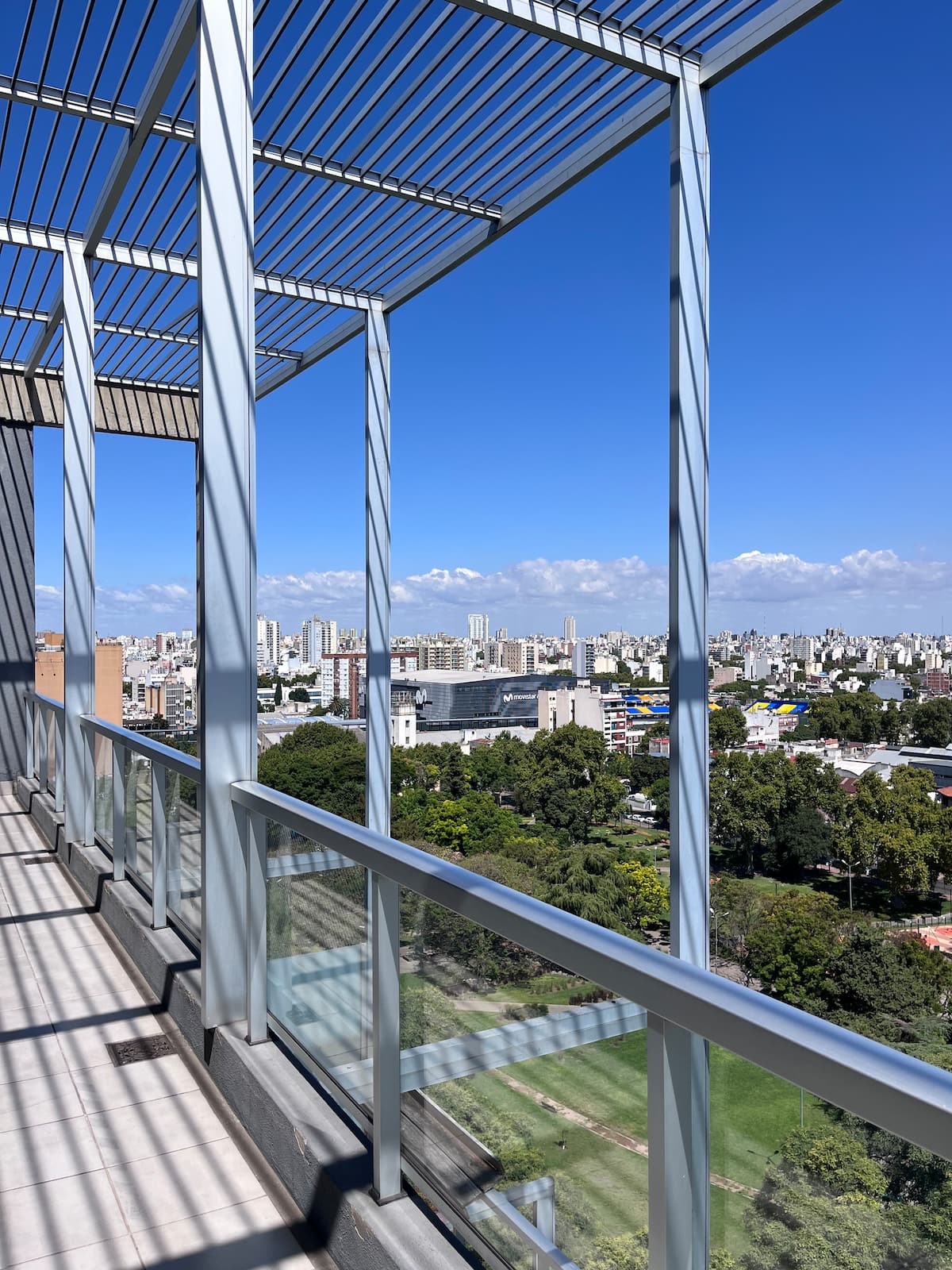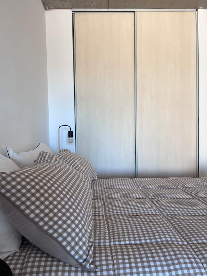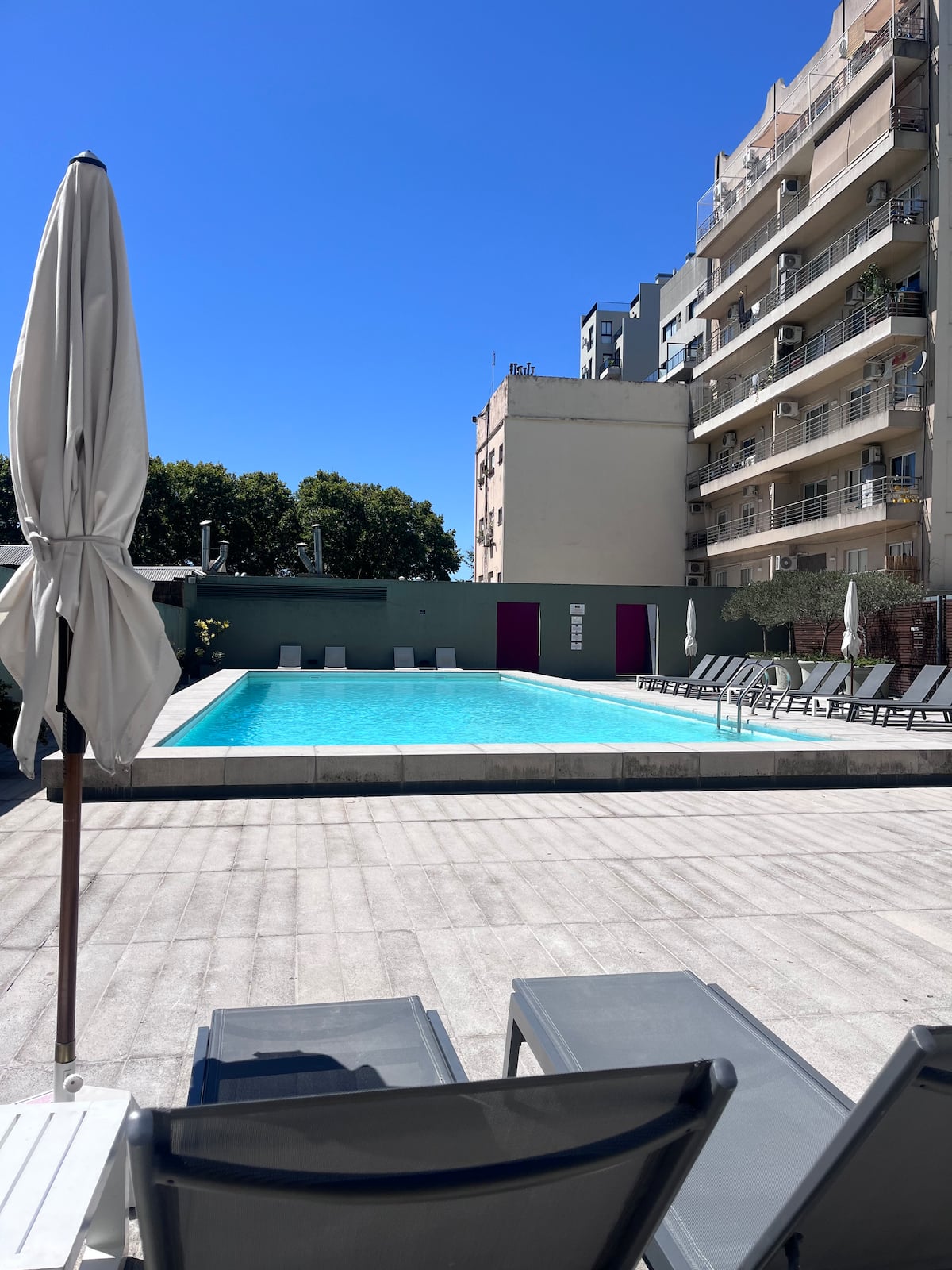 Apartamento premium em Chacarita. O prédio oferece piscina, academia e áreas verdes, além de segurança 24 horas. A localização fica a 2 blocos da Movistar Arena Buenos Aires e perto de linhas de ônibus e metrô.