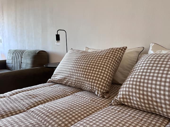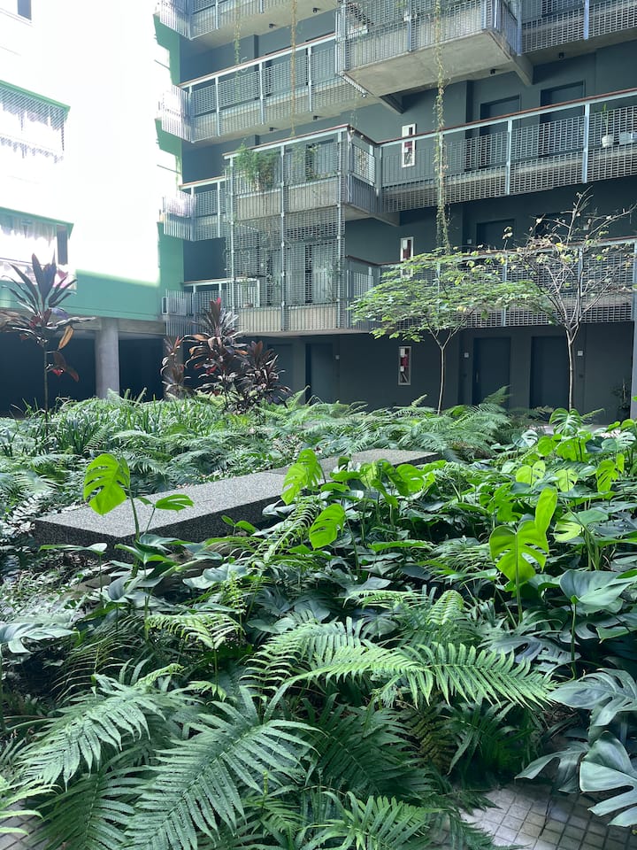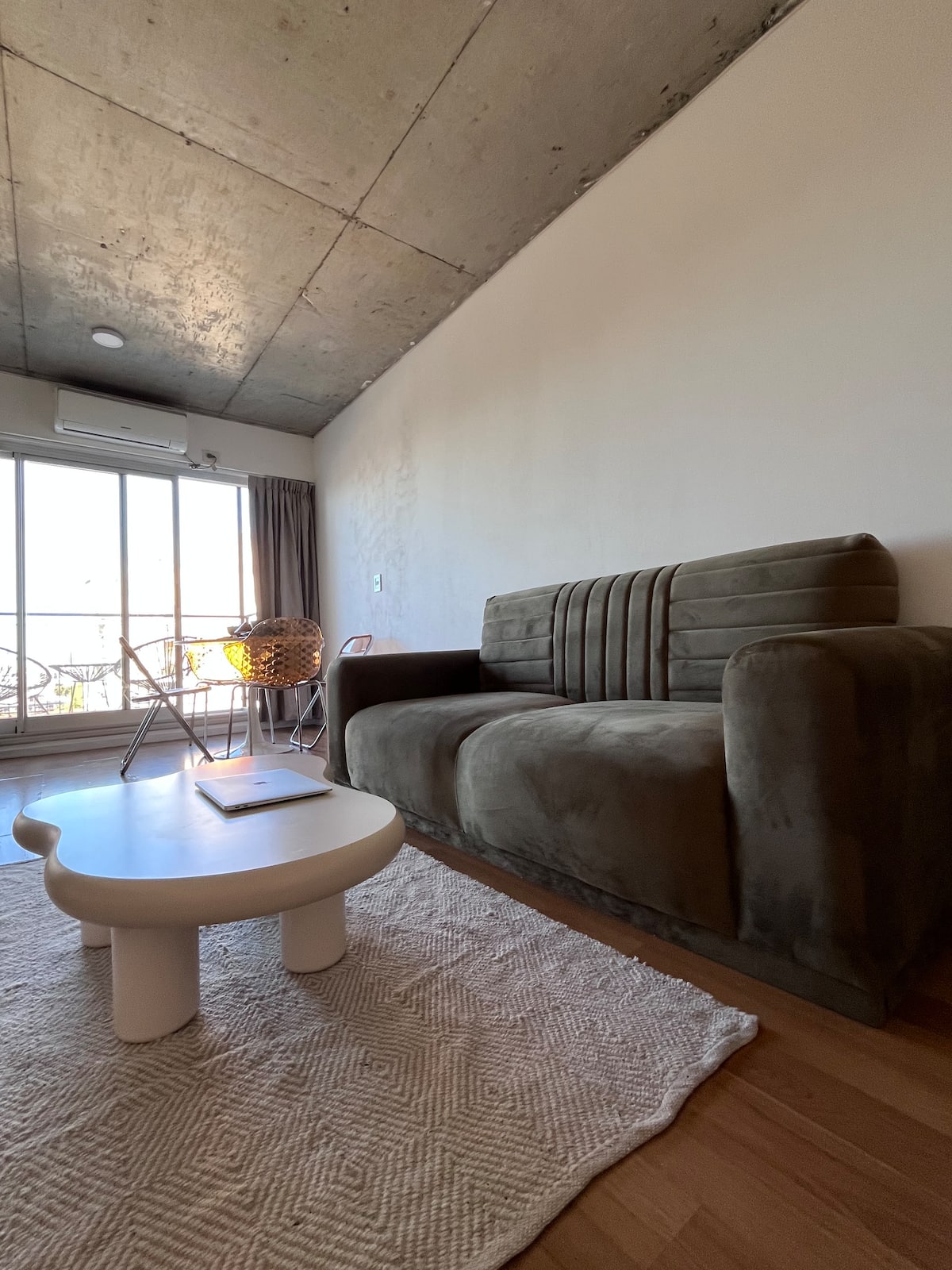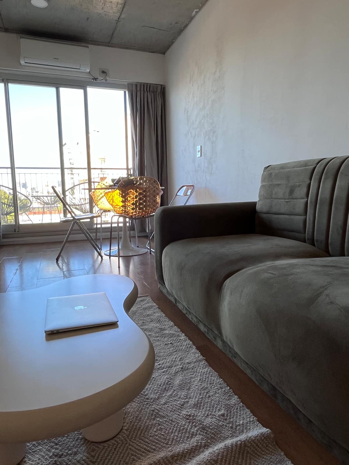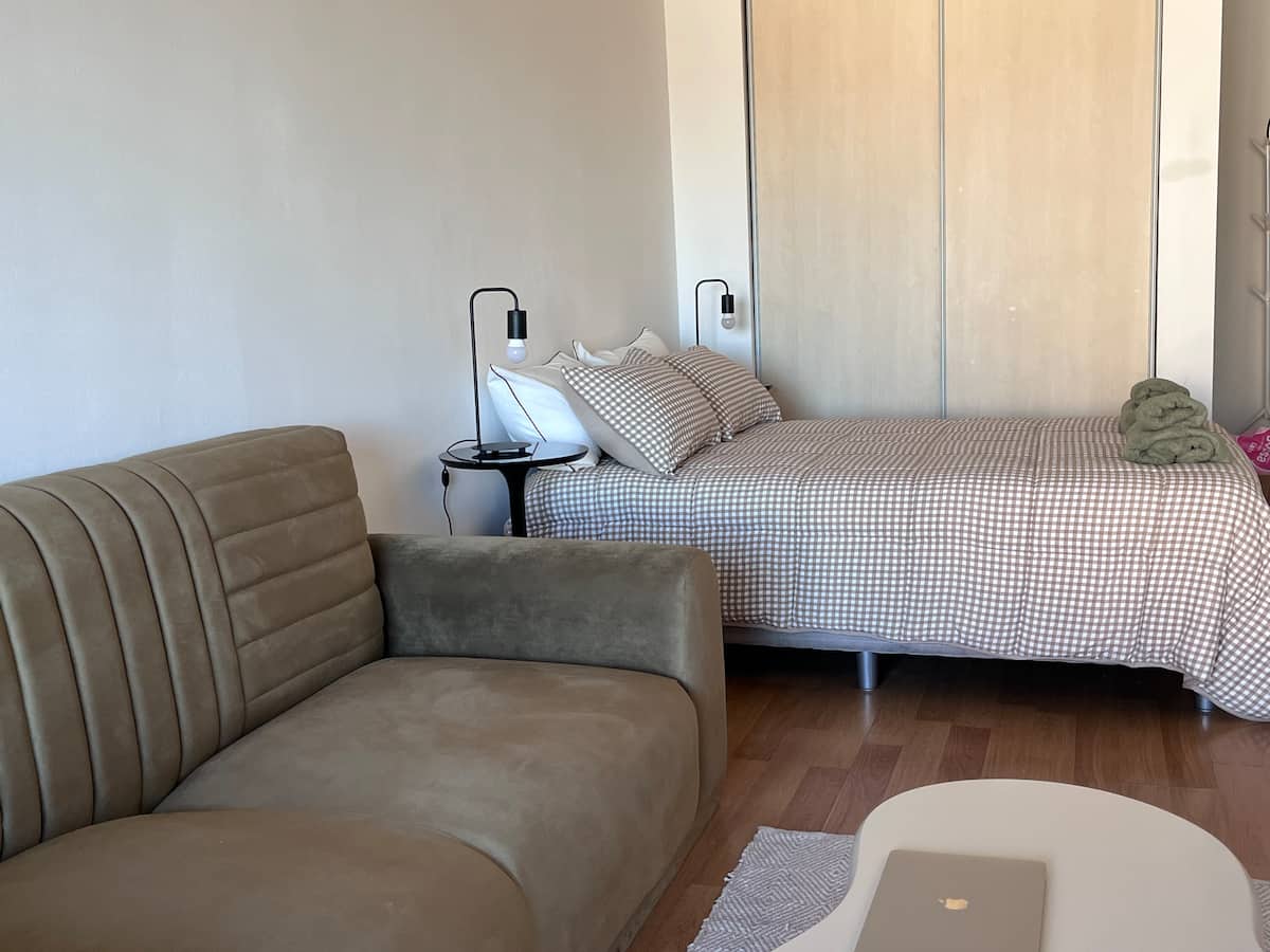 Apartamento premium em Chacarita. O prédio oferece piscina, academia e áreas verdes, além de segurança 24 horas. A localização fica a 2 blocos da Movistar Arena Buenos Aires e perto de linhas de ônibus e metrô.