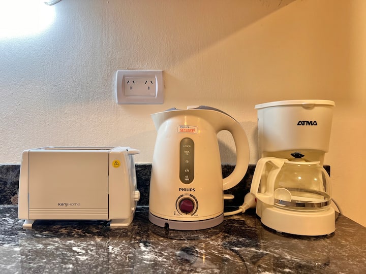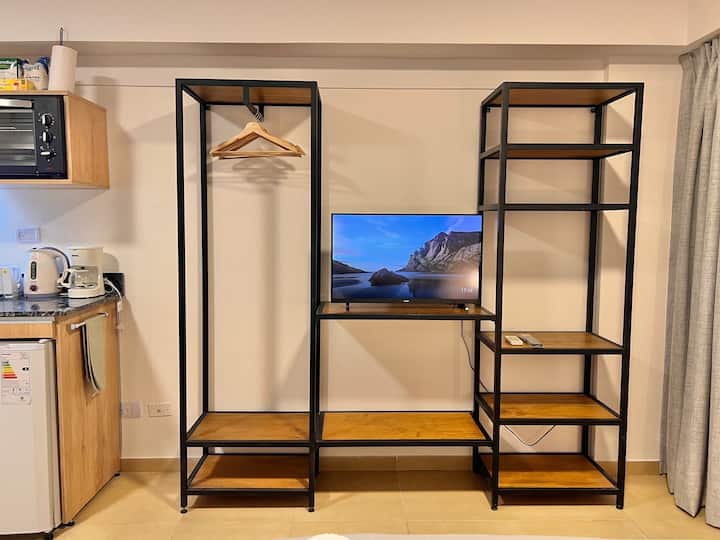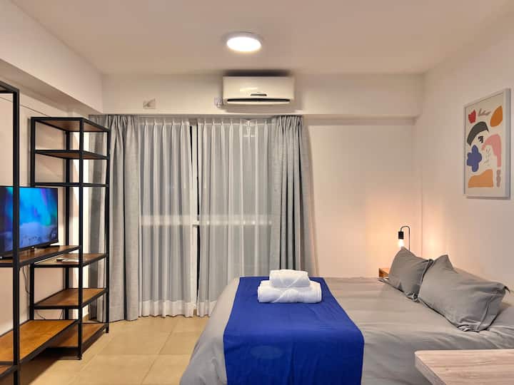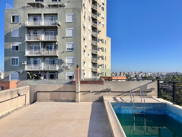 Kitnet em Chacarita, em avenida Dorrego, no 2º prédio de duas torres. Unidade interna, sem orientação para a rua, descrita como silenciosa. Cozinha compacta equipada com chaleira, cafeteira, torradeira, fogão, forno e geladeira com freezer; banheiro com bidê. Há TV inteligente. Na cobertura, piscina e área de lavanderia com máquina de lavar e secar.