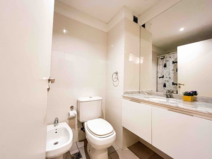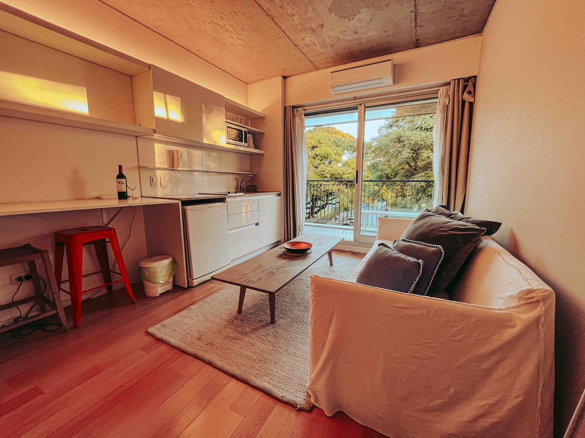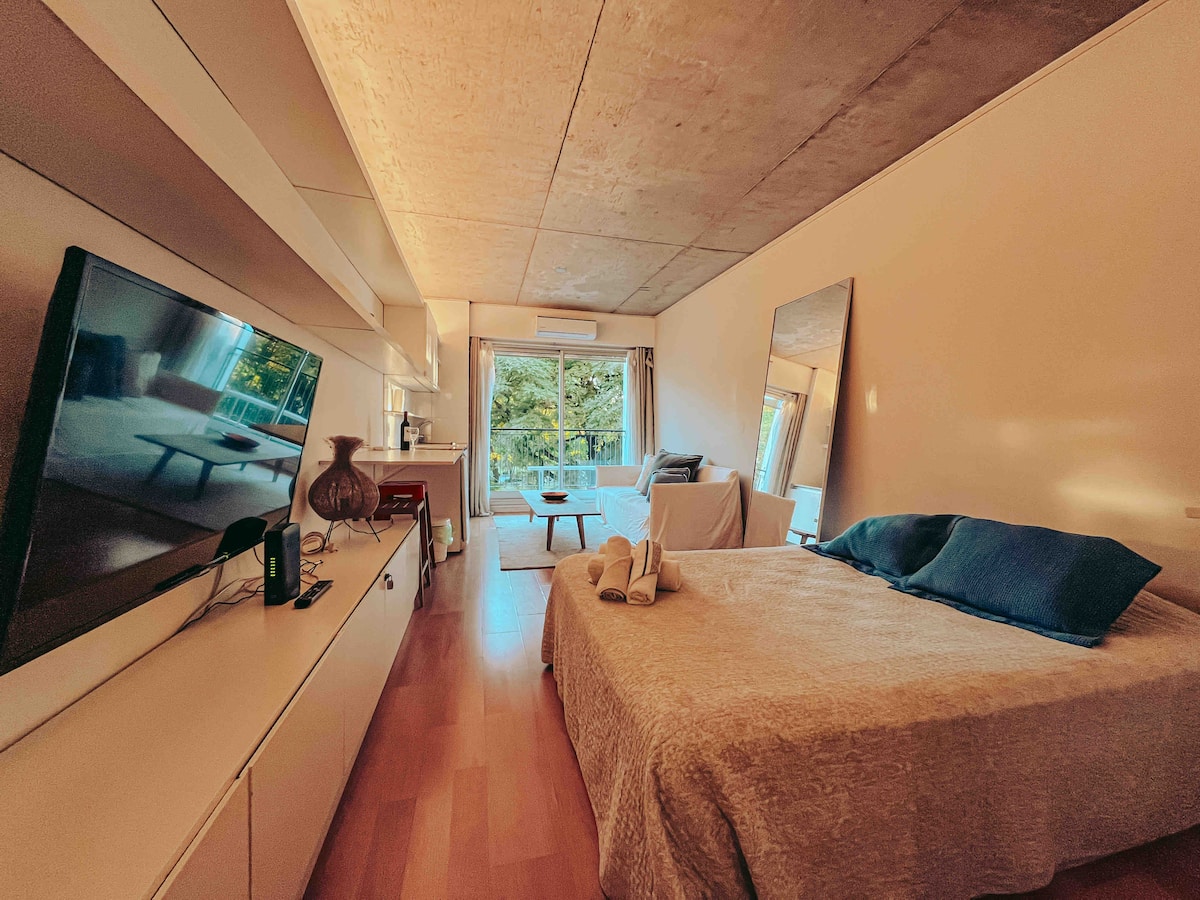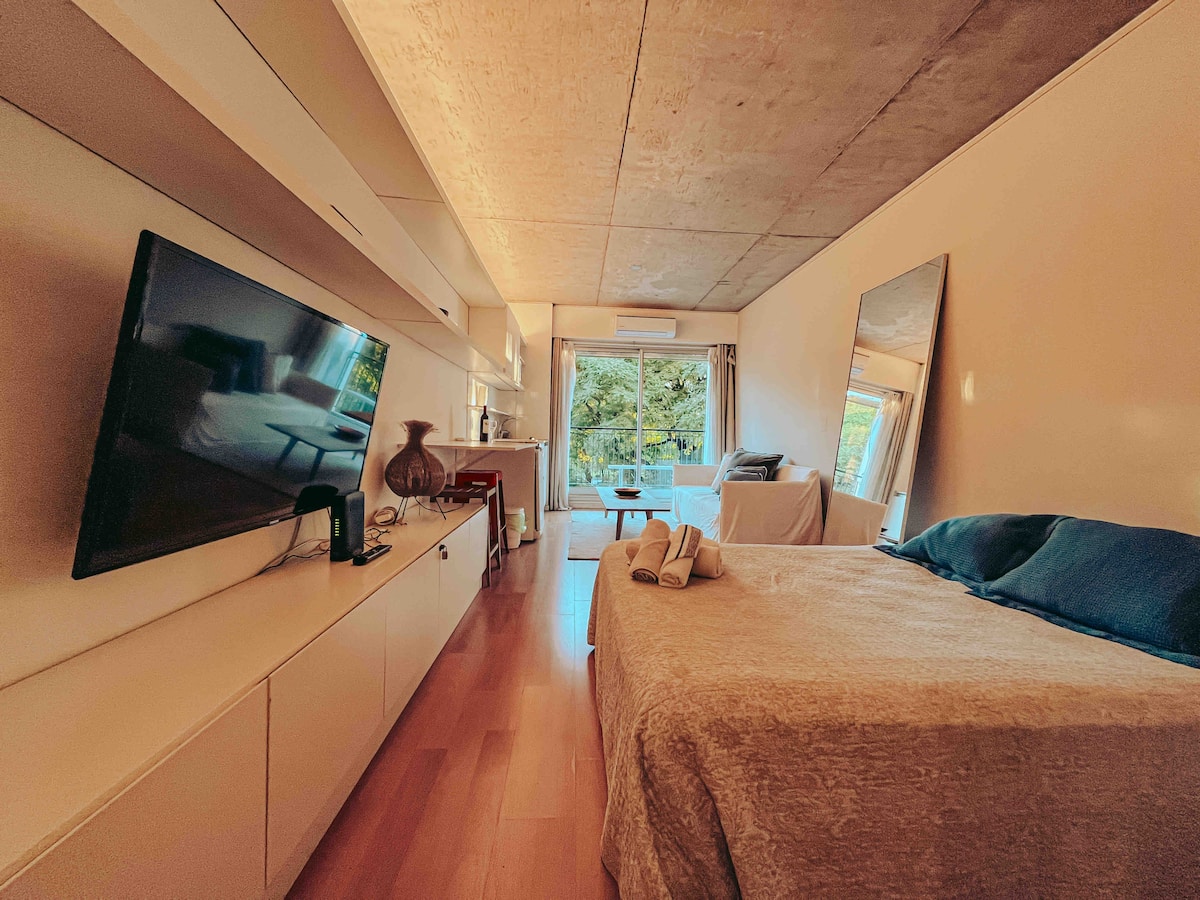 Kitnet em torre em Chacarita. Para estadias de 20 dias ou mais, há política de consumo de eletricidade: se o uso durante a estadia ultrapassar 500 kWh, pode haver cobrança adicional pelo excedente. Para entrada, é necessário enviar previamente a identificação de todos os passageiros para cadastro no prédio e liberação do acesso.
