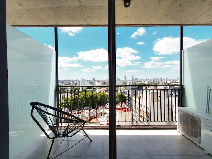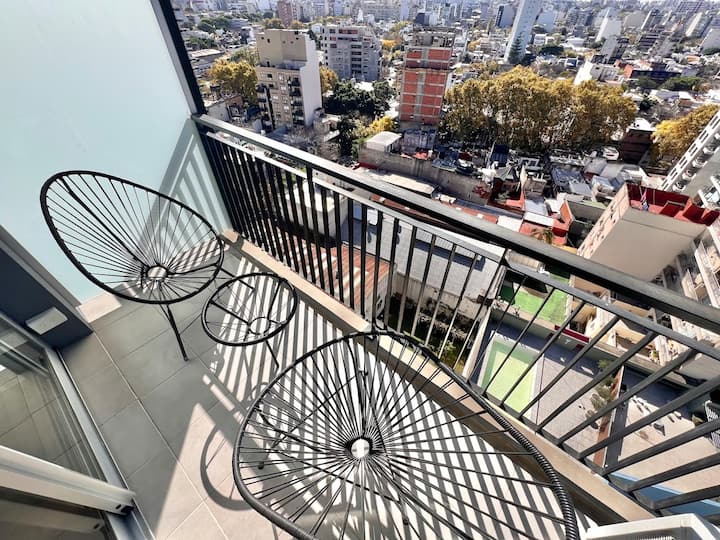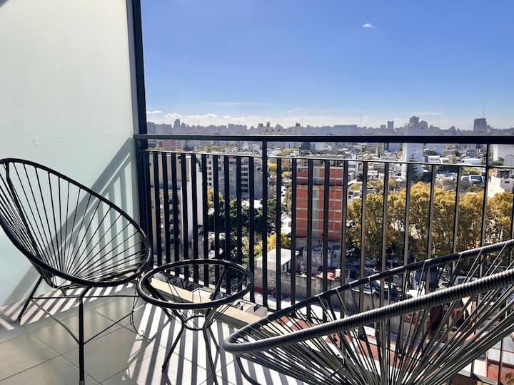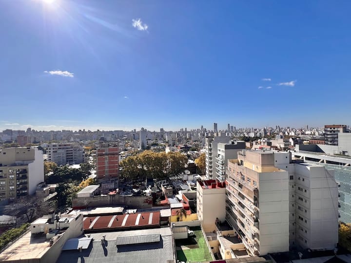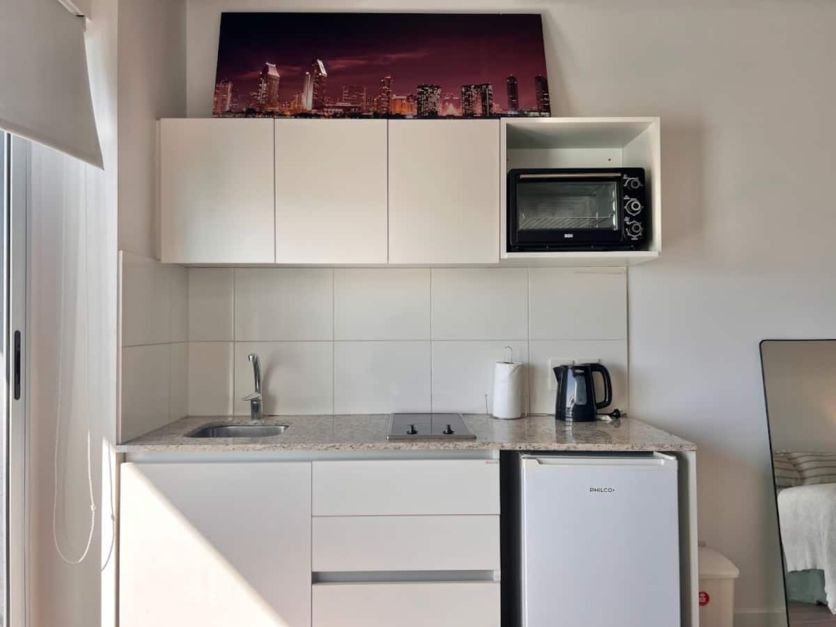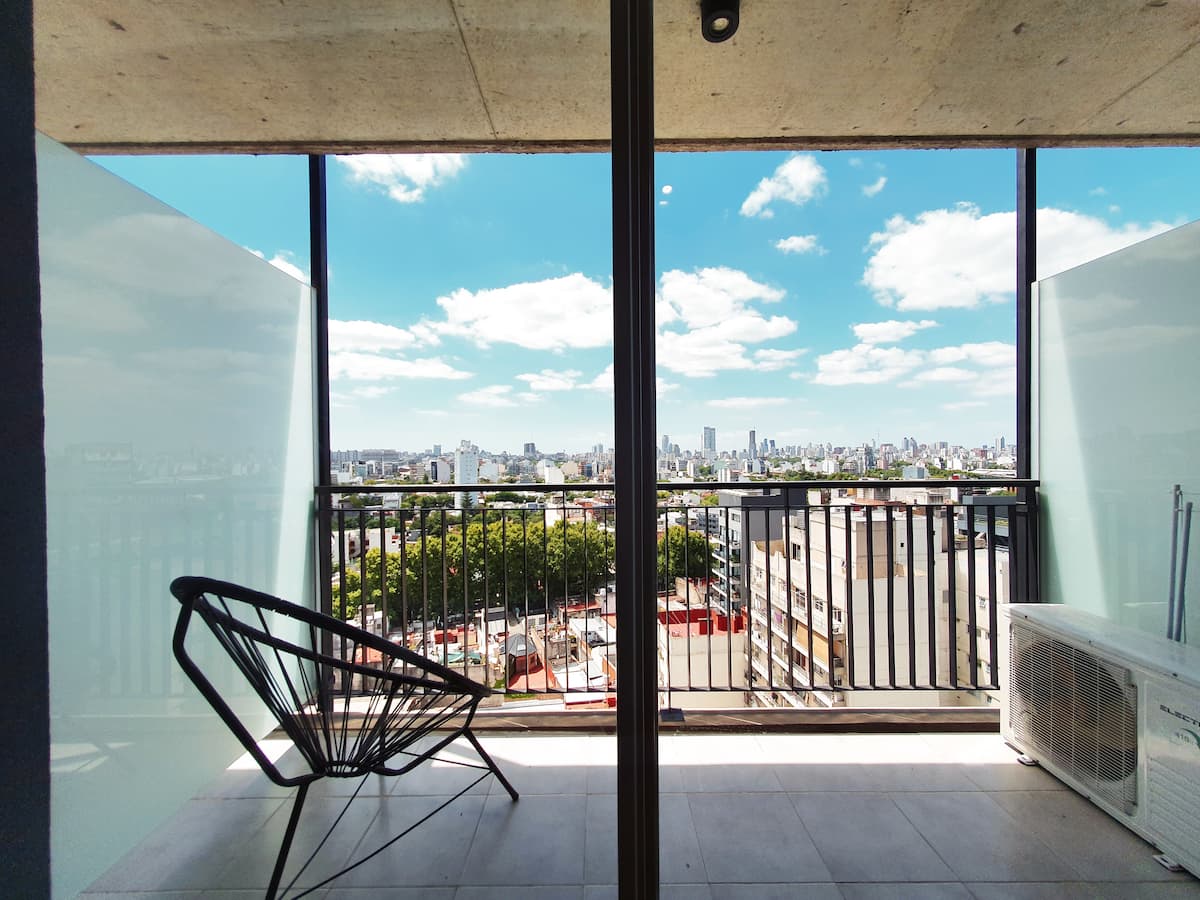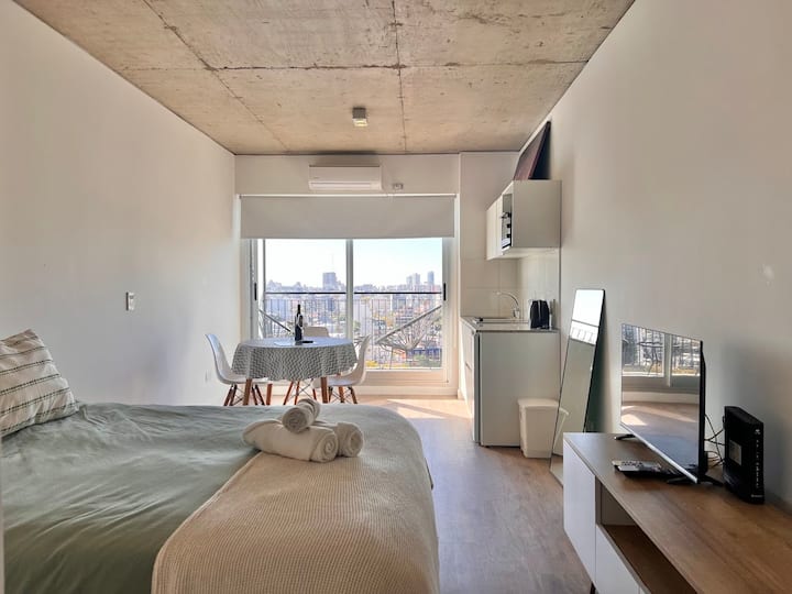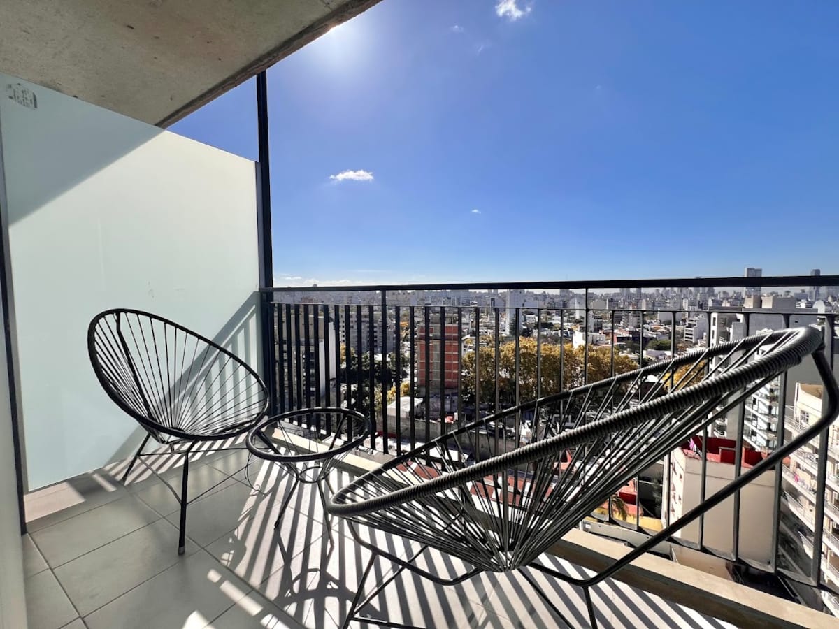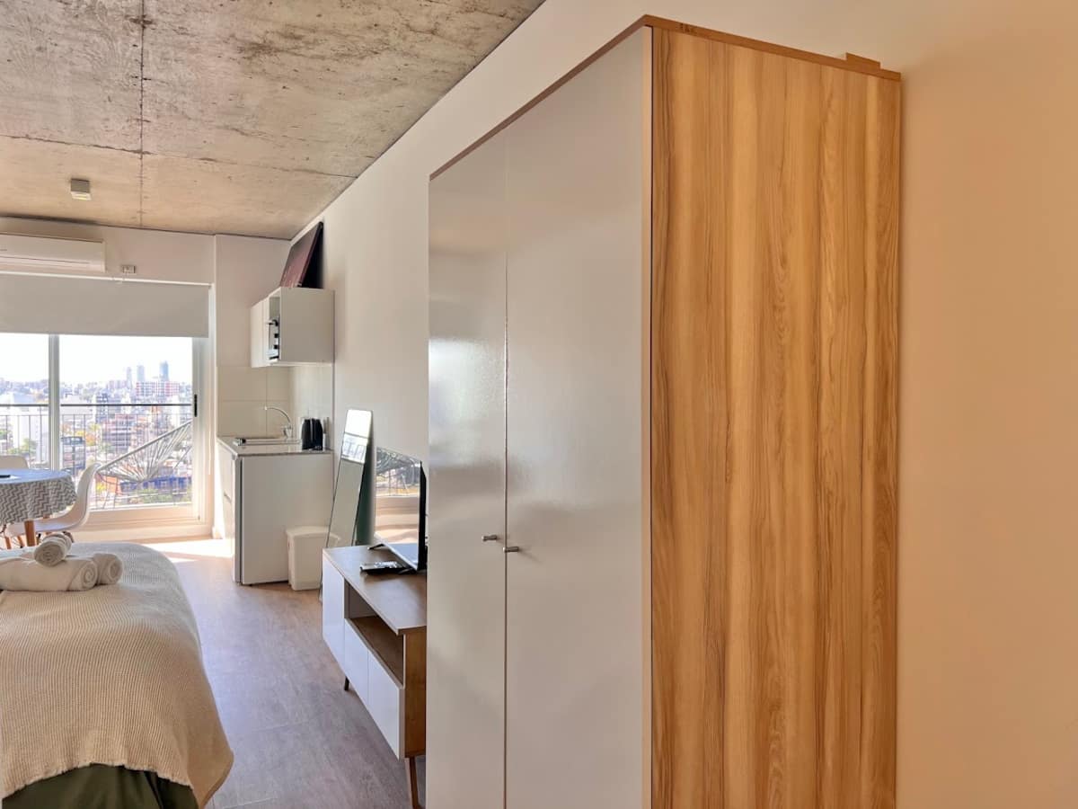 Kitnet em Chacarita com vista panorâmica. O prédio conta com academia e lavanderia. Para reservas de 20 dias ou mais, há política de consumo de eletricidade: se o uso exceder 500 kWh durante a estadia, pode haver cobrança adicional pelo excedente.