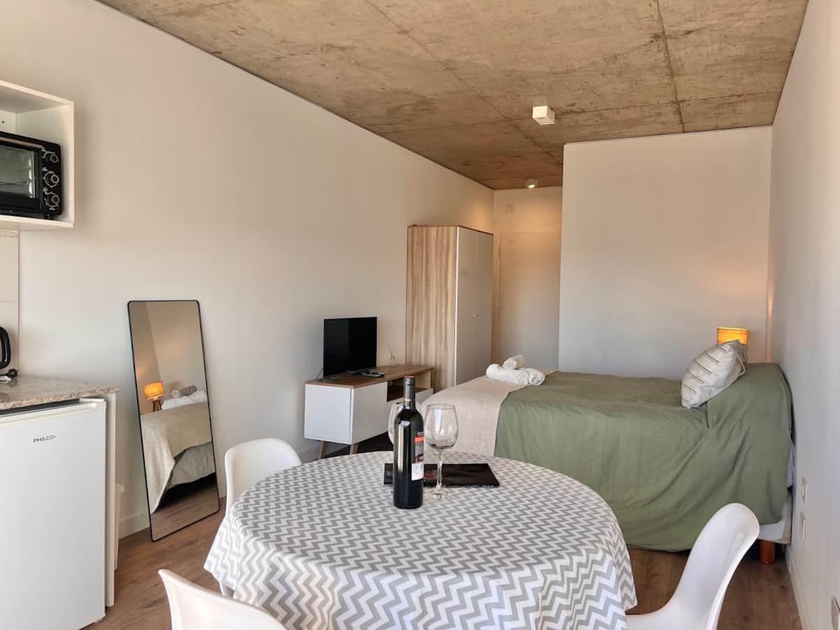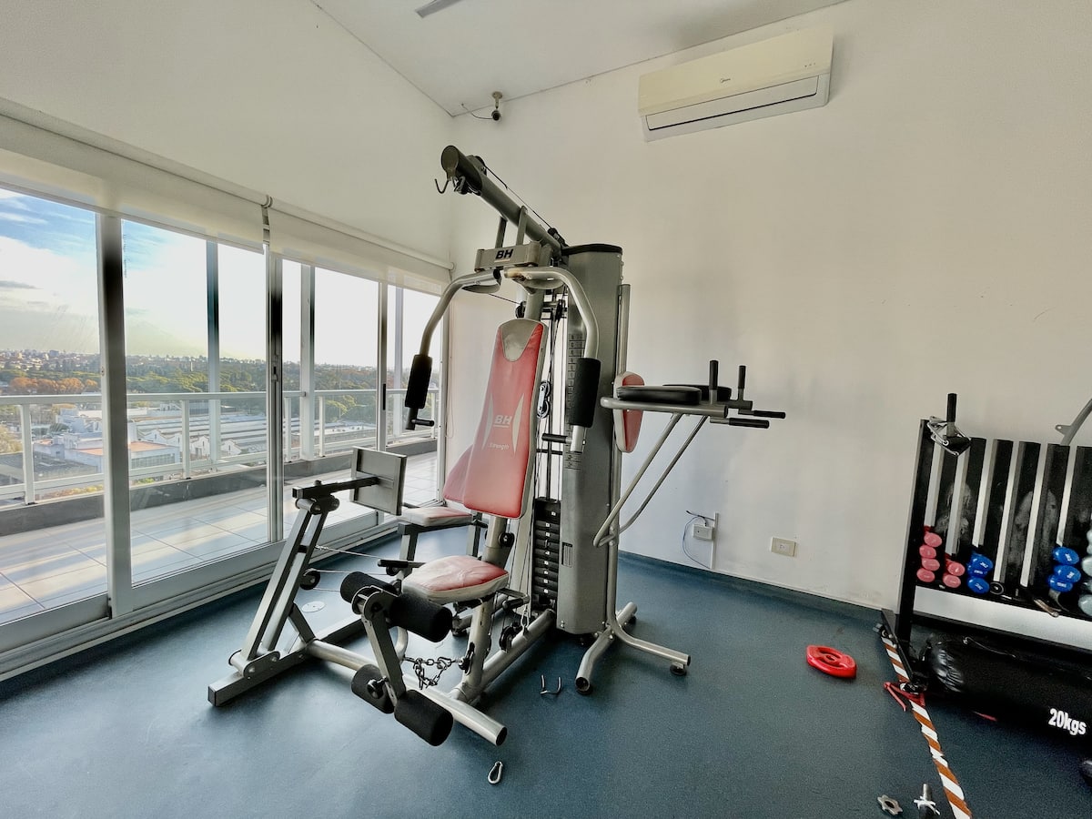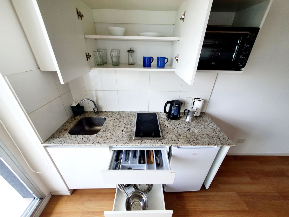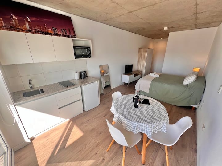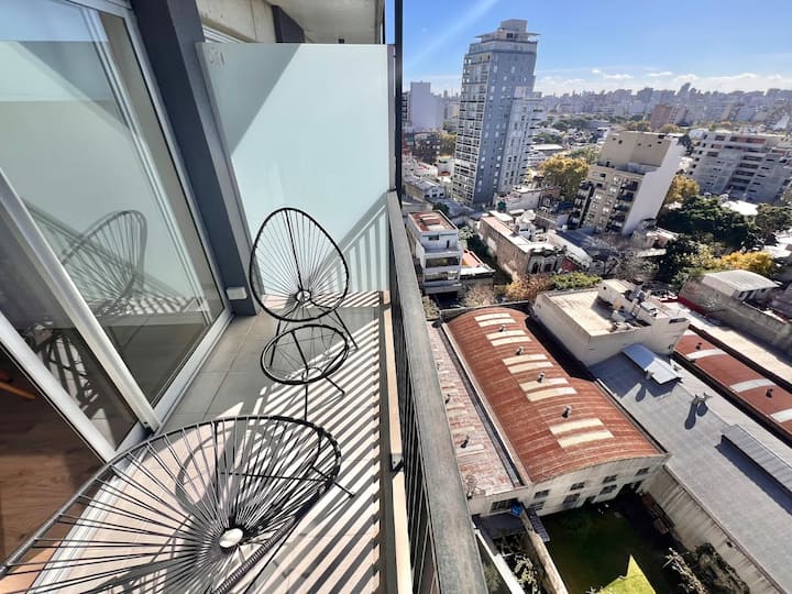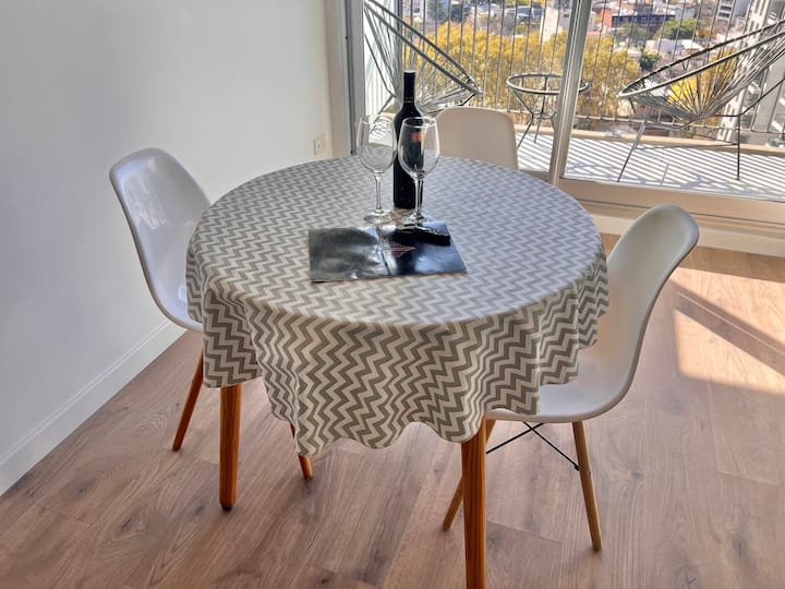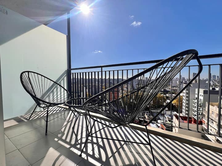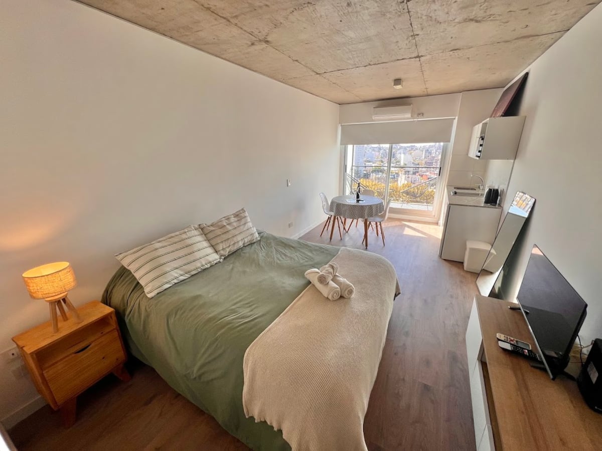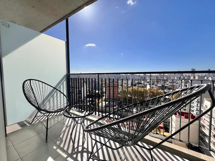 Kitnet em Chacarita com vista panorâmica. O prédio conta com academia e lavanderia. Para reservas de 20 dias ou mais, há política de consumo de eletricidade: se o uso exceder 500 kWh durante a estadia, pode haver cobrança adicional pelo excedente.
