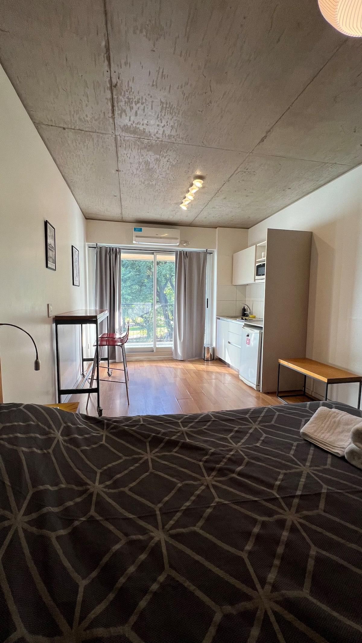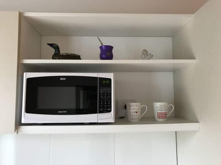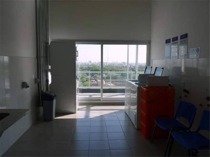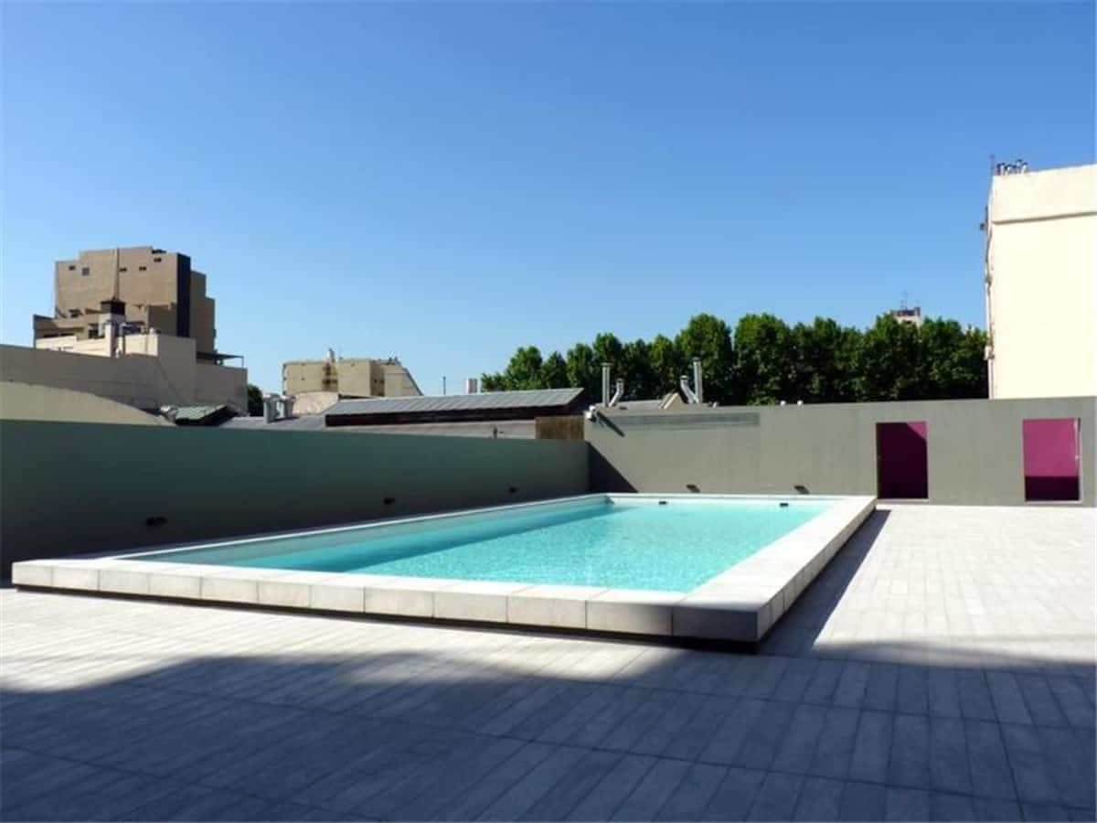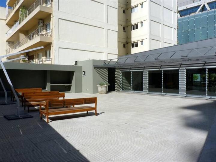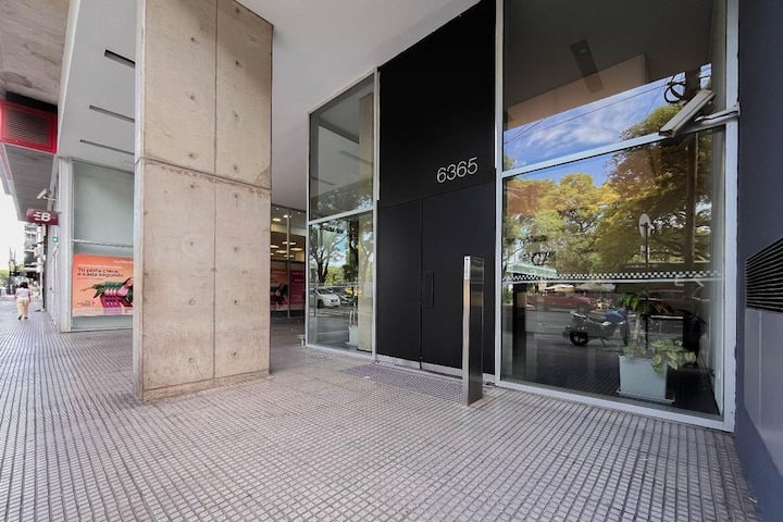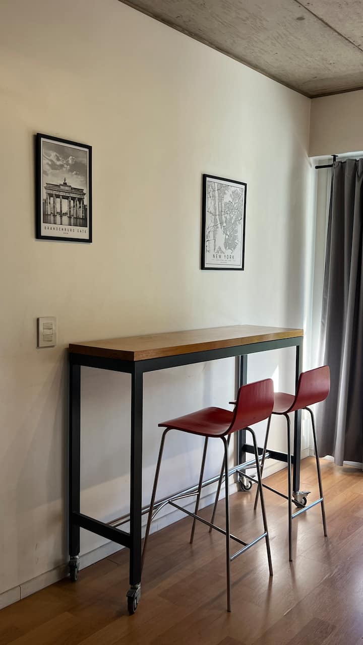 Kitnet em Chacarita, com cozinha equipada (geladeira, 2 fogões elétricos, chaleira elétrica e micro-ondas) e banheiro com banheira. Conta com smart TV, Wi-Fi e ar-condicionado frio/quente. Há varanda com toldo e janelas com isolamento acústico. No prédio: piscina, academia, sala de reuniões, lavanderia e segurança 24 horas. O apartamento fica a alguns minutos de Palermo, com acesso a transporte público, e a 5 minutos a pé da Movistar Arena e do complexo cultural C Art Media.