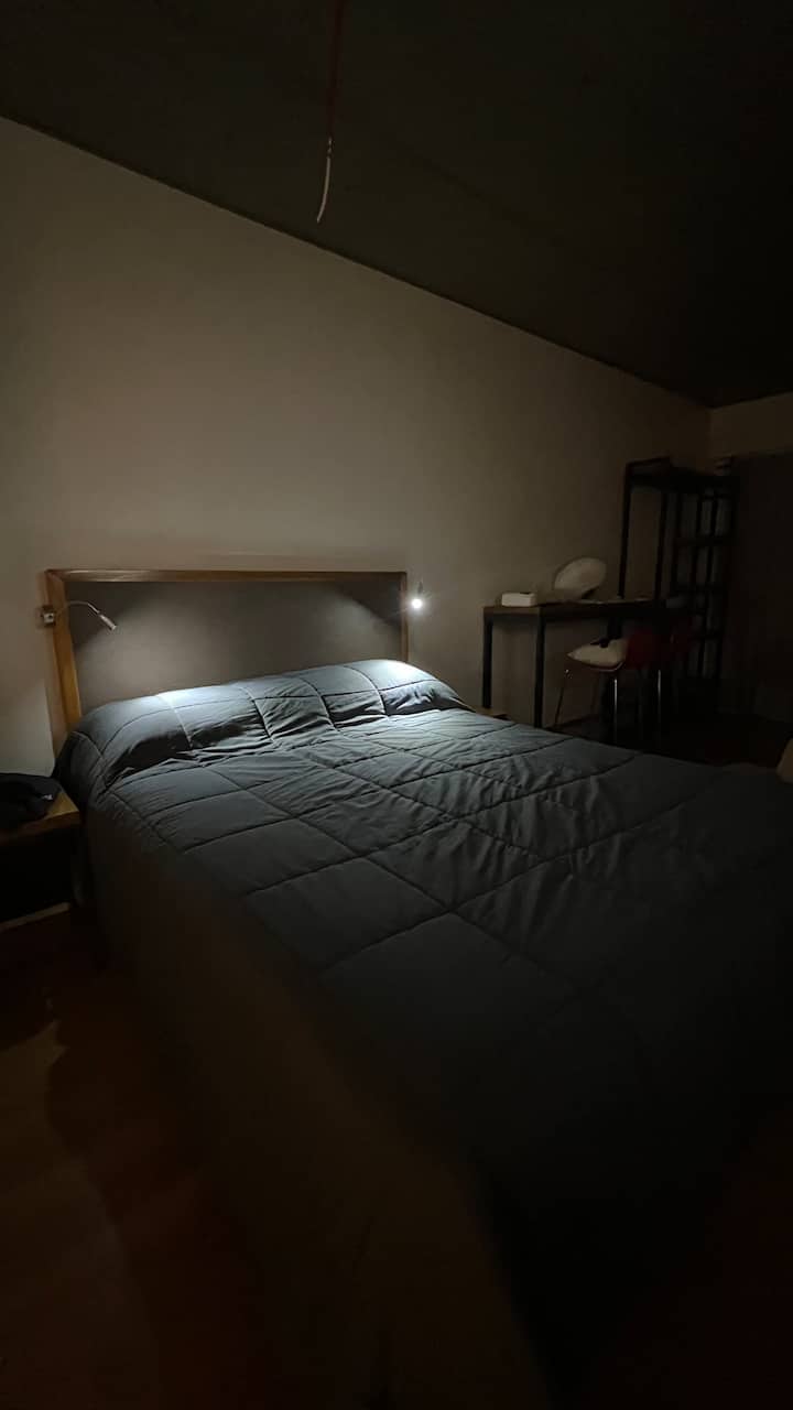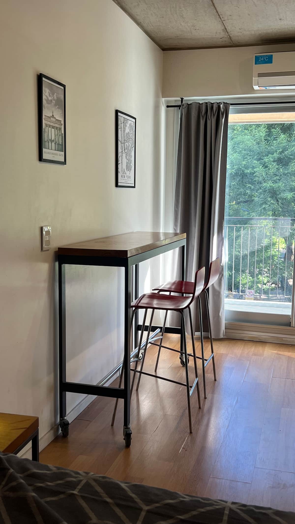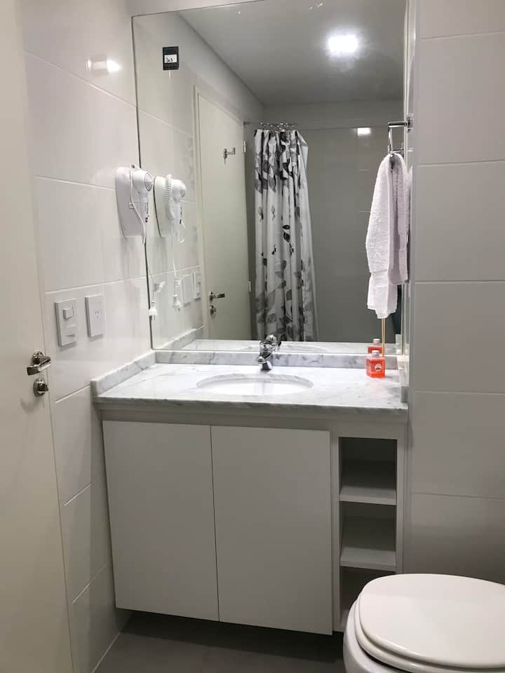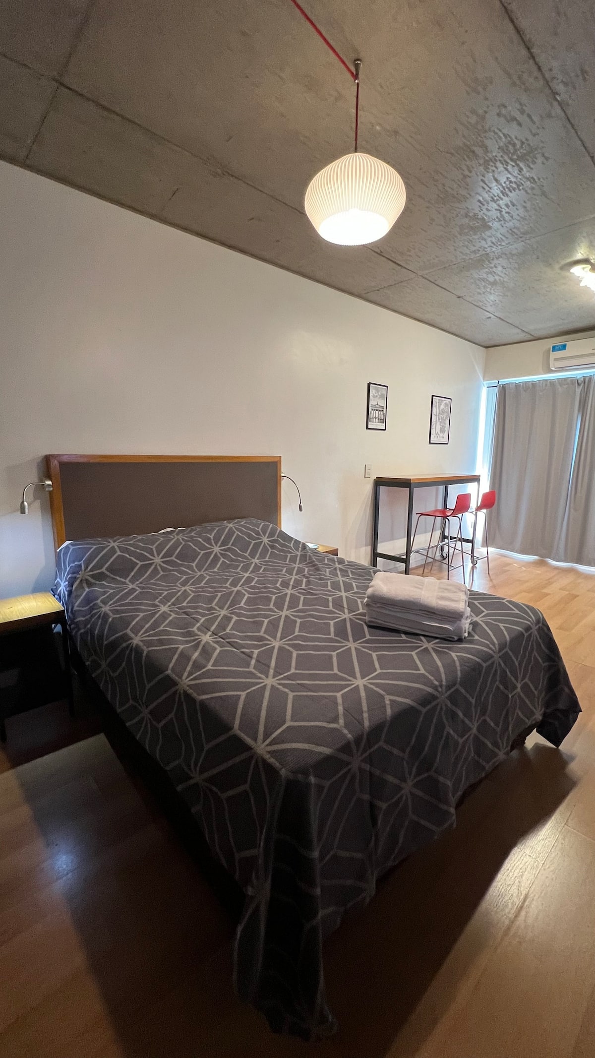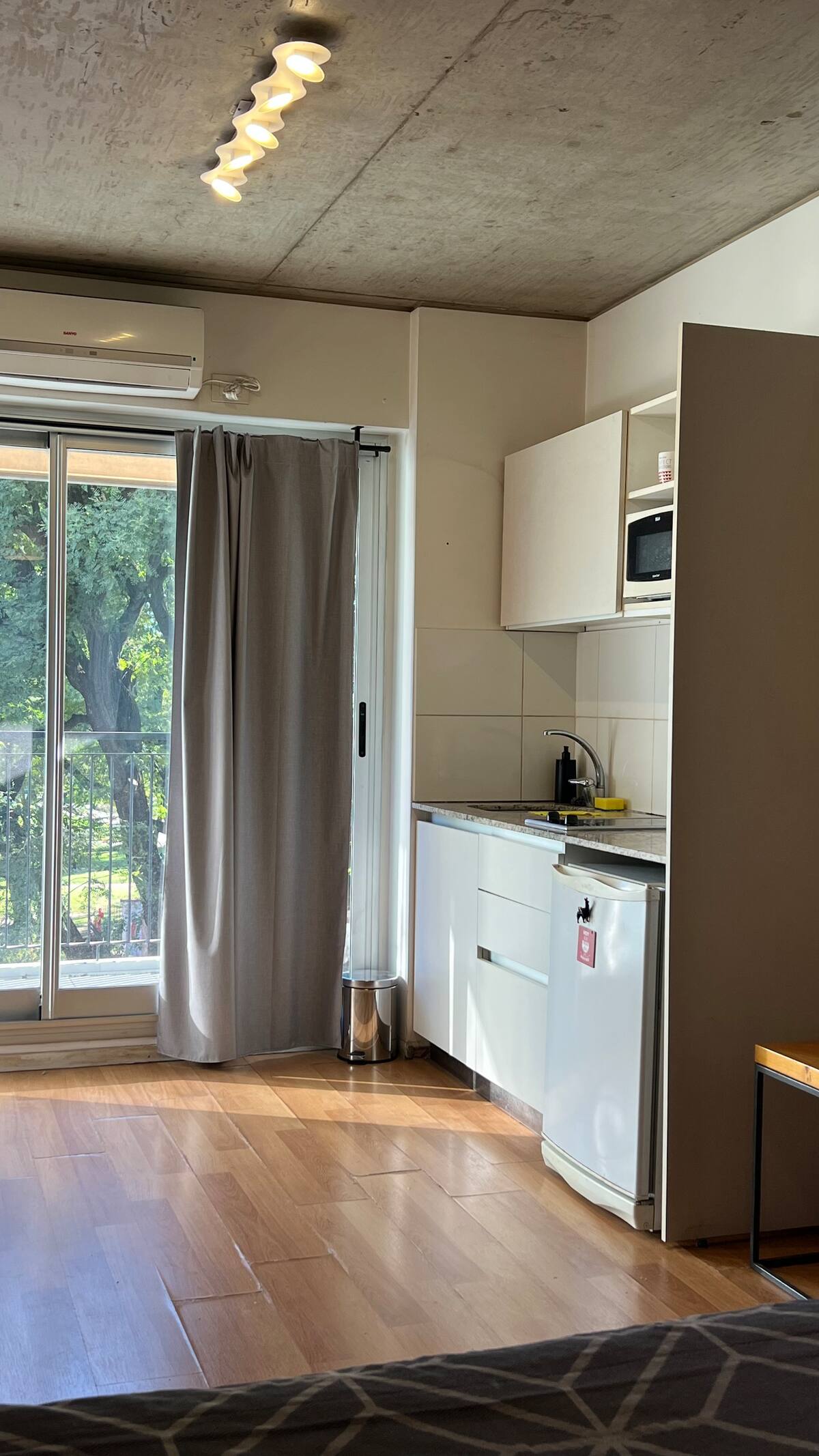 Kitnet em Chacarita, com cozinha equipada (geladeira, 2 fogões elétricos, chaleira elétrica e micro-ondas) e banheiro com banheira. Conta com smart TV, Wi-Fi e ar-condicionado frio/quente. Há varanda com toldo e janelas com isolamento acústico. No prédio: piscina, academia, sala de reuniões, lavanderia e segurança 24 horas. O apartamento fica a alguns minutos de Palermo, com acesso a transporte público, e a 5 minutos a pé da Movistar Arena e do complexo cultural C Art Media.
