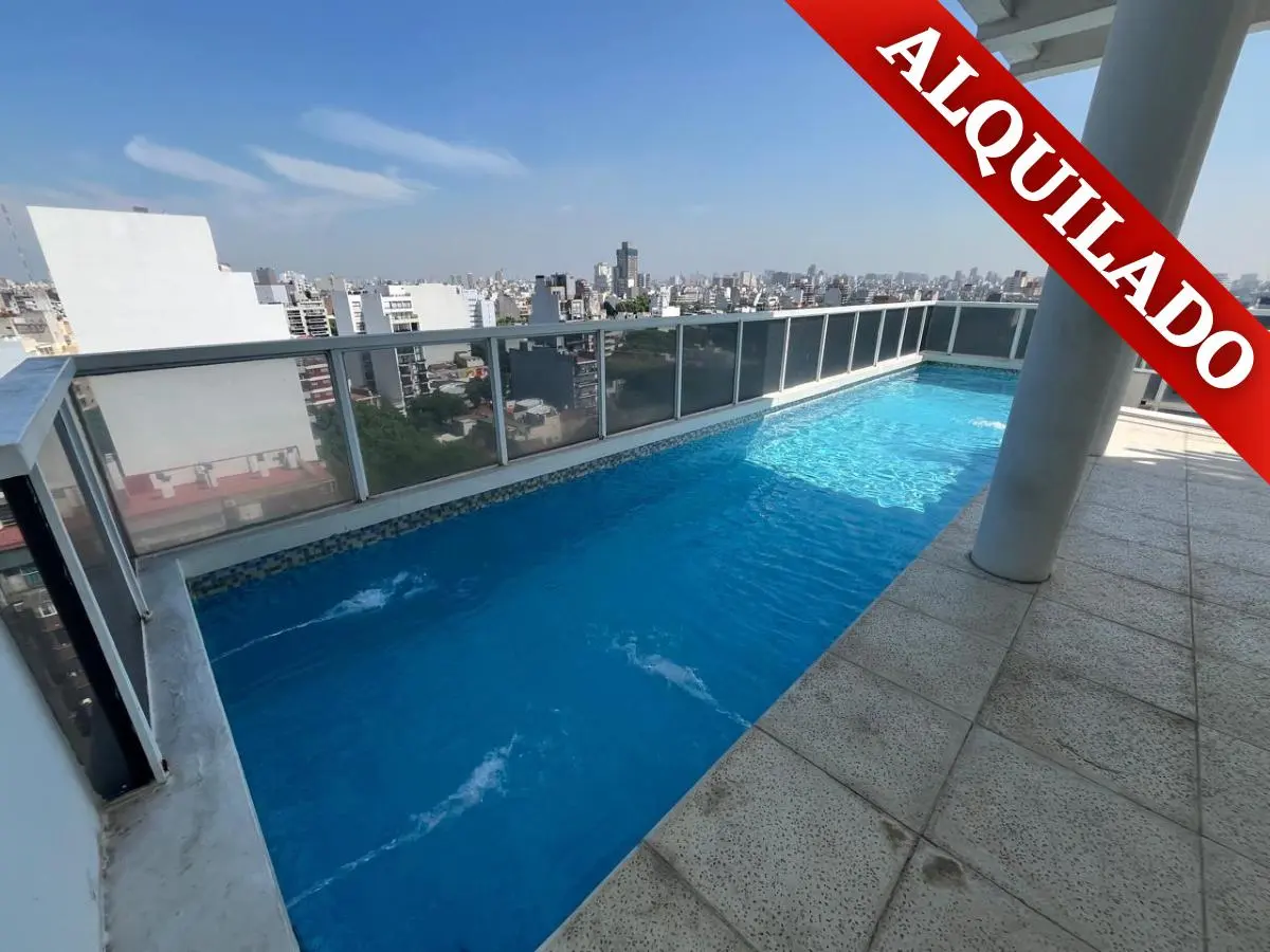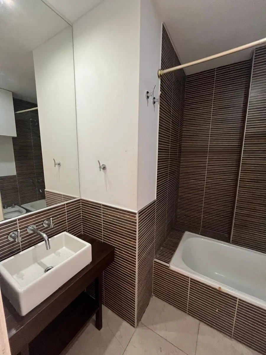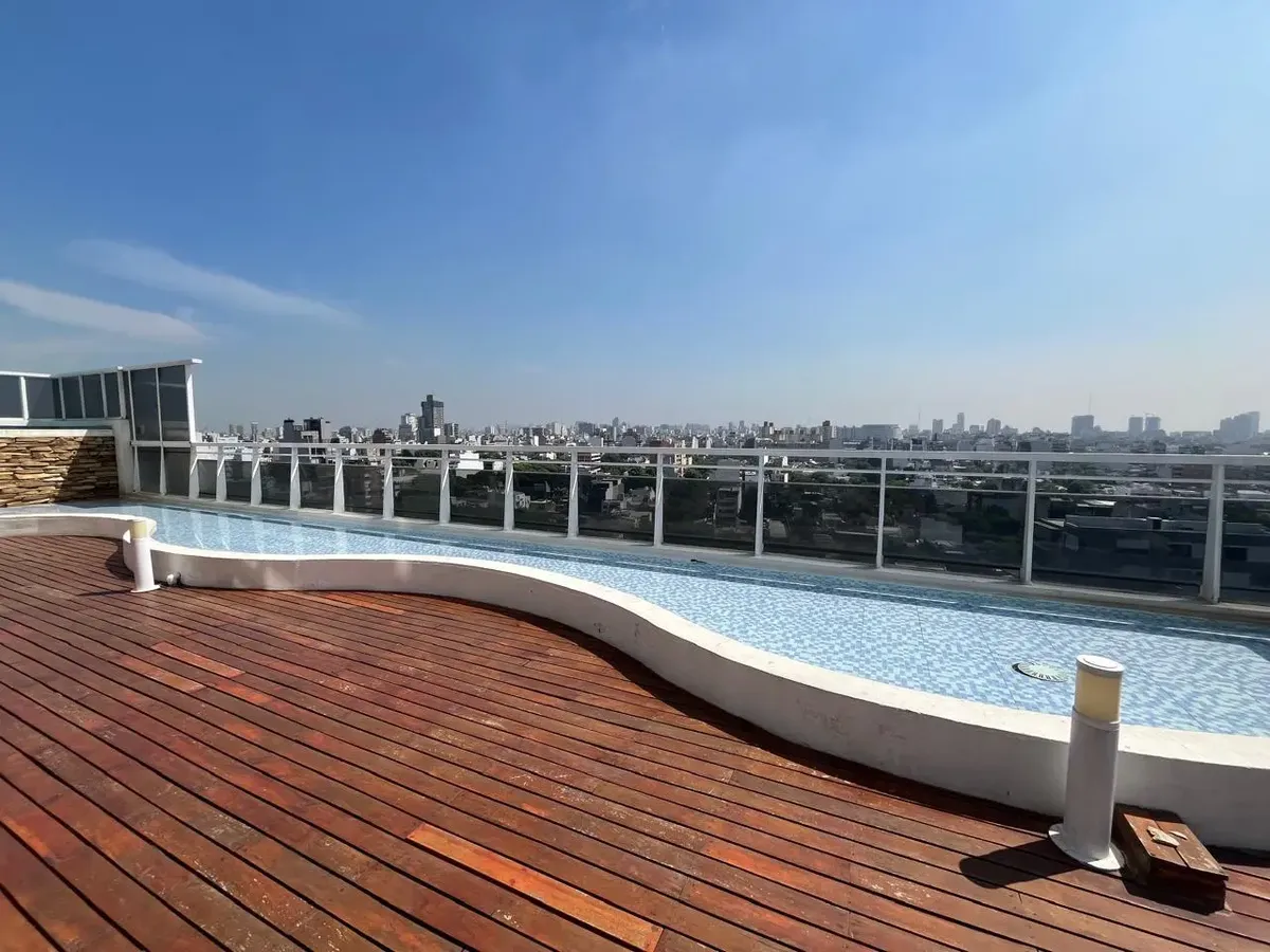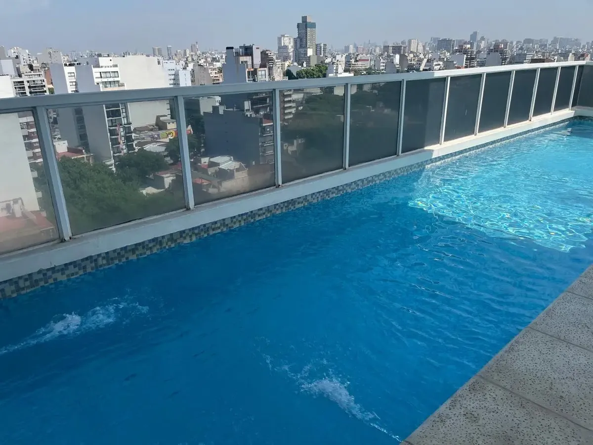 Studio (monoambiente) para aluguel em Chacarita, no 3º andar, de fundos. 35 m² no total, com grandes janelas e acesso a varanda; cozinha integrada com fogão a gás, exaustor, pia dupla e bancadas, com armários inferiores e superiores. Guarda-roupa embutido do piso ao teto com portas de correr e banheiro completo com banheira, revestimentos cerâmicos e espelho grande. O edifício tem duas piscinas, jacuzzi, salão de festas (SUM) com capacidade aproximada para 40 pessoas e academia.