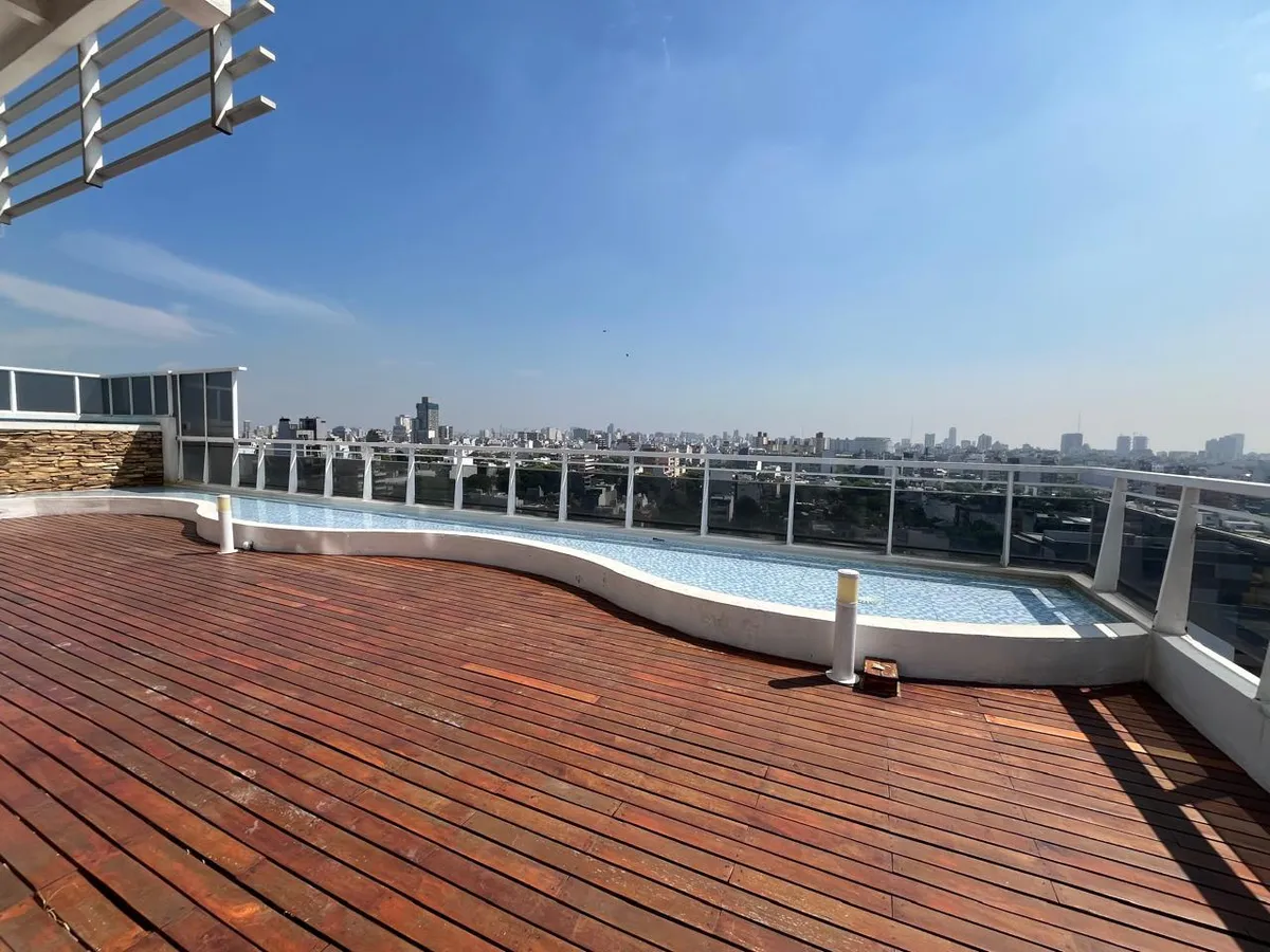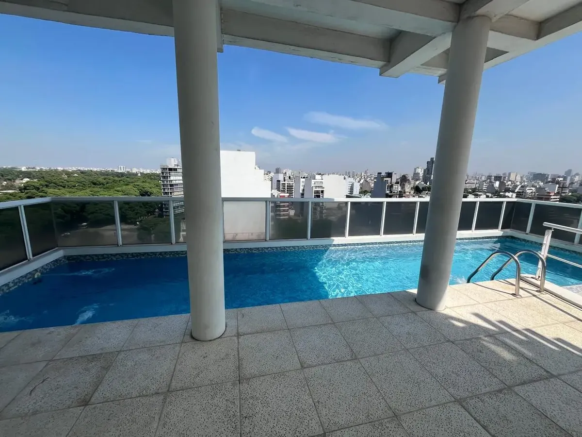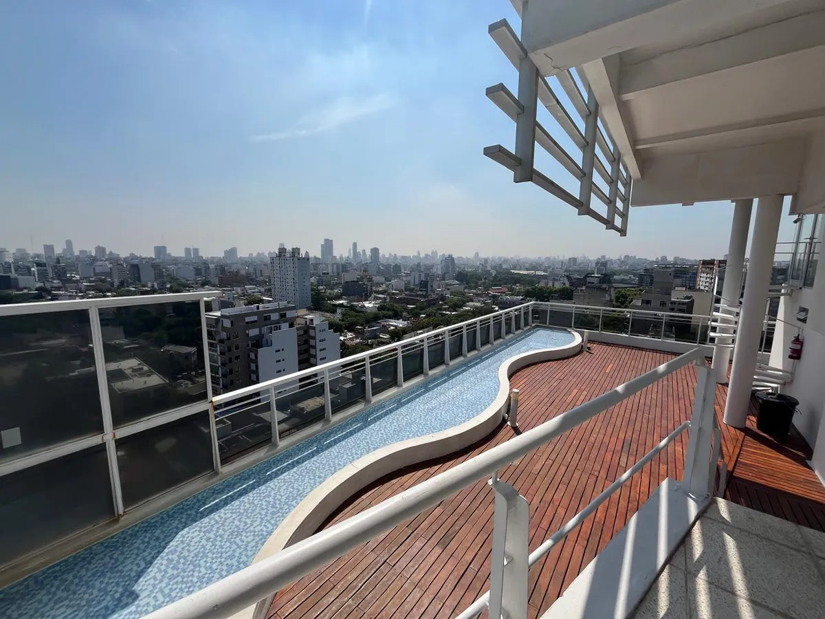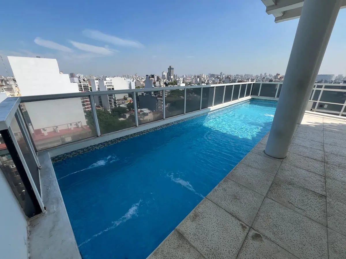 Studio (monoambiente) para aluguel em Chacarita, no 3º andar, de fundos. 35 m² no total, com grandes janelas e acesso a varanda; cozinha integrada com fogão a gás, exaustor, pia dupla e bancadas, com armários inferiores e superiores. Guarda-roupa embutido do piso ao teto com portas de correr e banheiro completo com banheira, revestimentos cerâmicos e espelho grande. O edifício tem duas piscinas, jacuzzi, salão de festas (SUM) com capacidade aproximada para 40 pessoas e academia.
