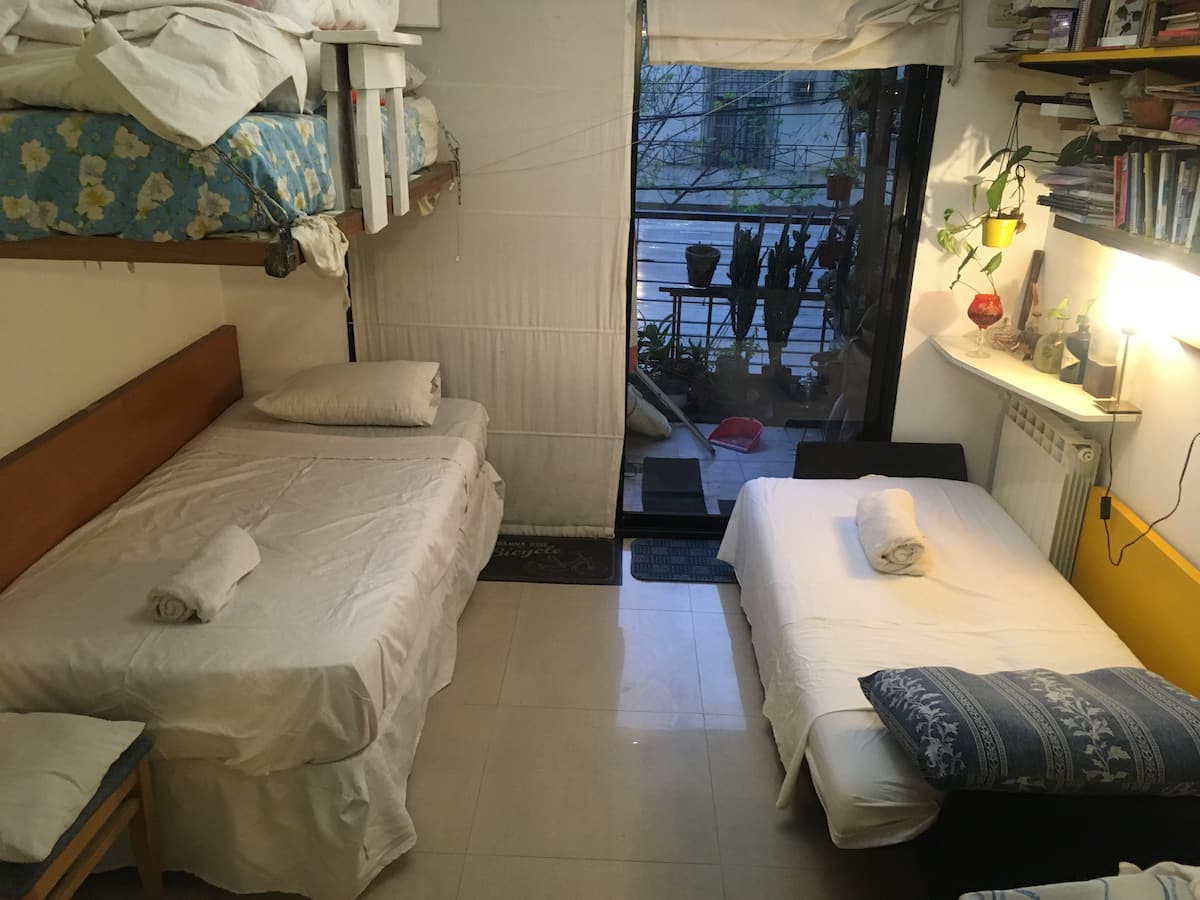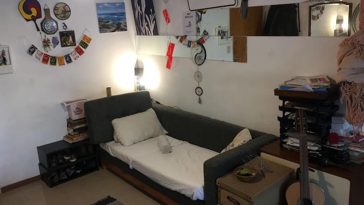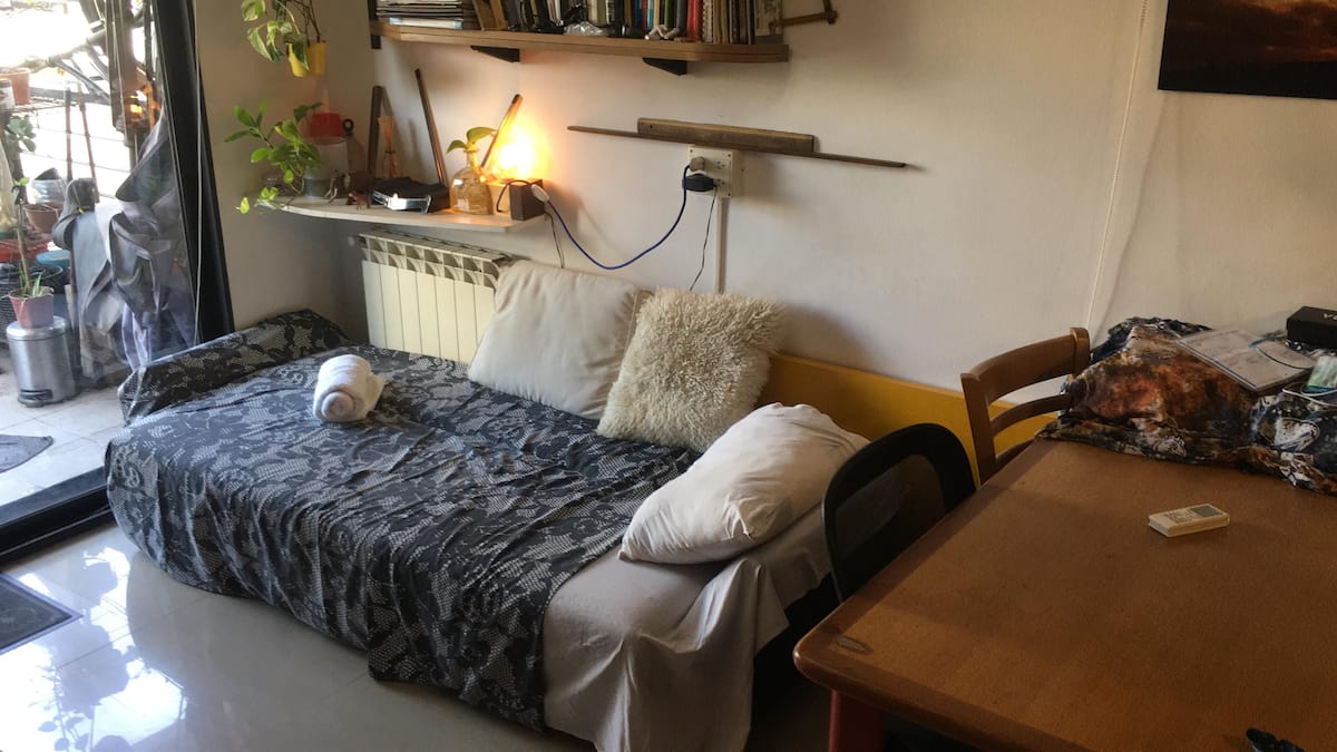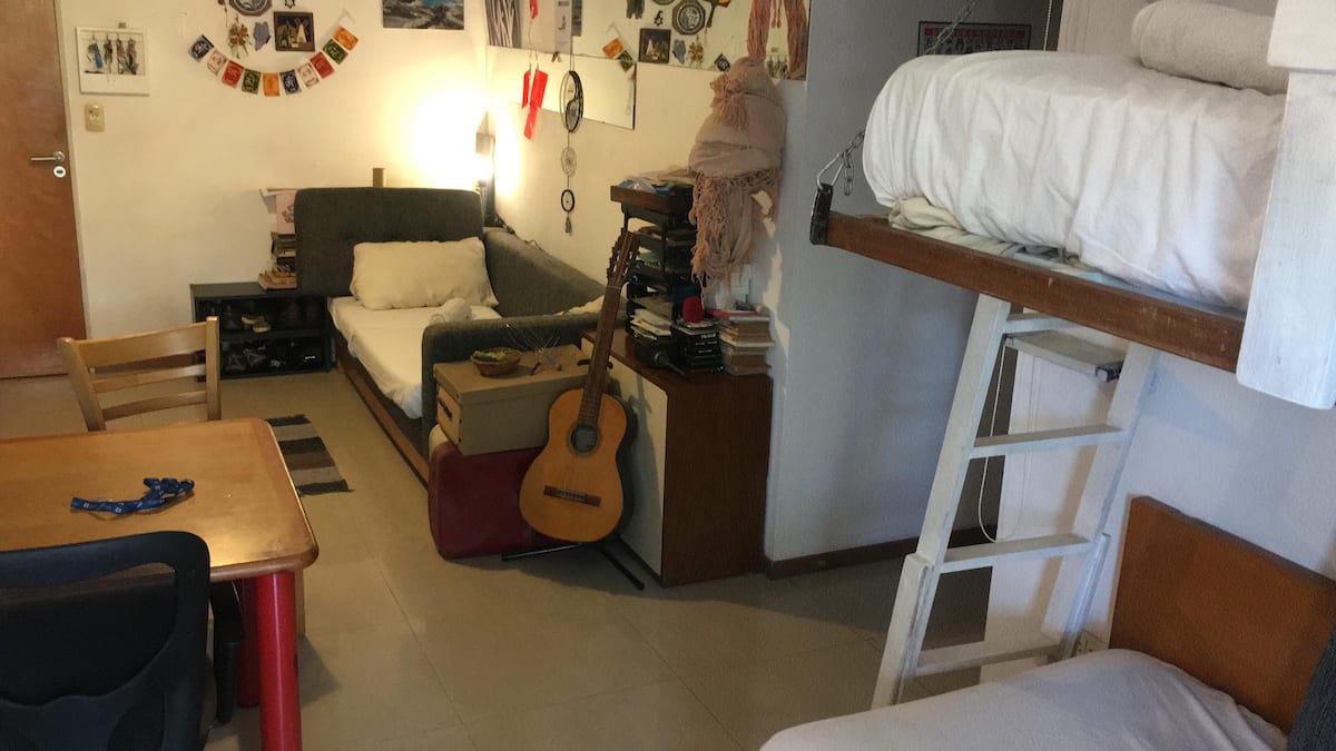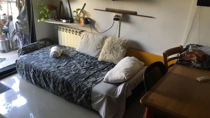 Apartamento tipo kitnet em Chacarita com piscina na cobertura do prédio. Há cortinas para separar a área de estar. A unidade tem cama de molas (somier), cama elevada e duas opções de sofá que podem ser usados como cama, incluindo um sofá grande.