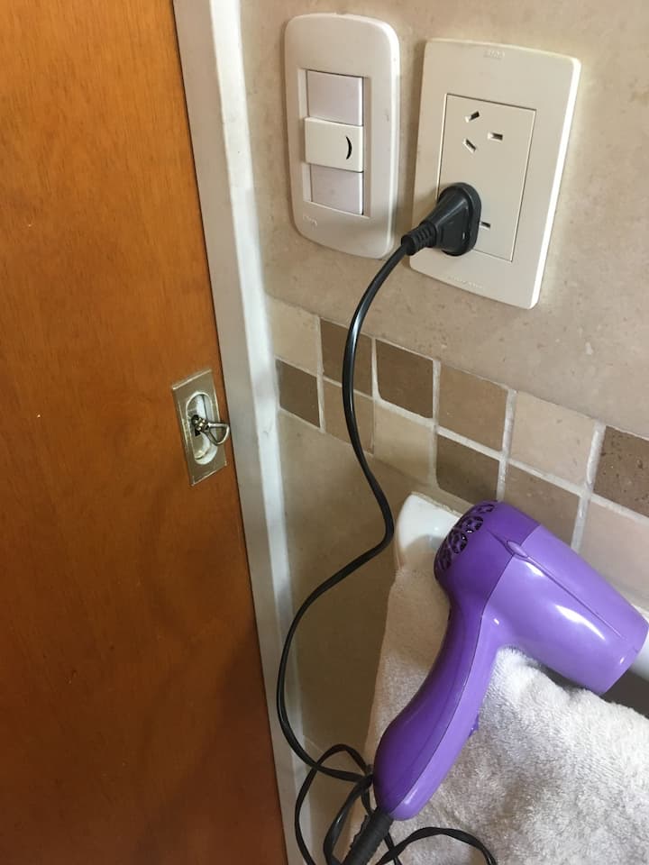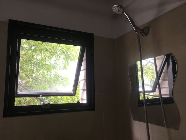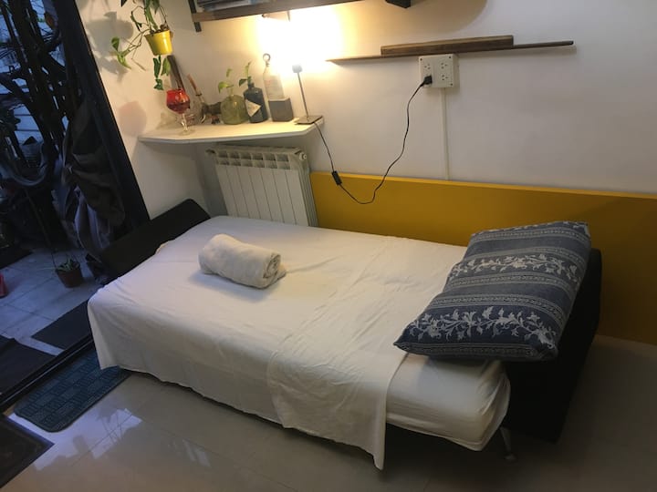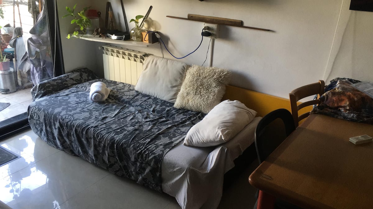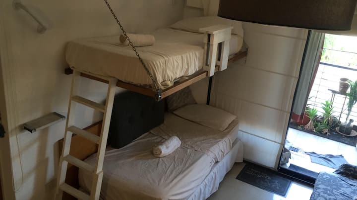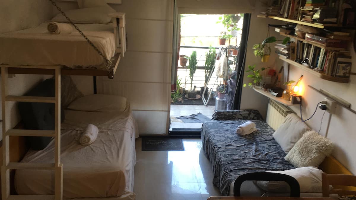 Apartamento tipo kitnet em Chacarita com piscina na cobertura do prédio. Há cortinas para separar a área de estar. A unidade tem cama de molas (somier), cama elevada e duas opções de sofá que podem ser usados como cama, incluindo um sofá grande.