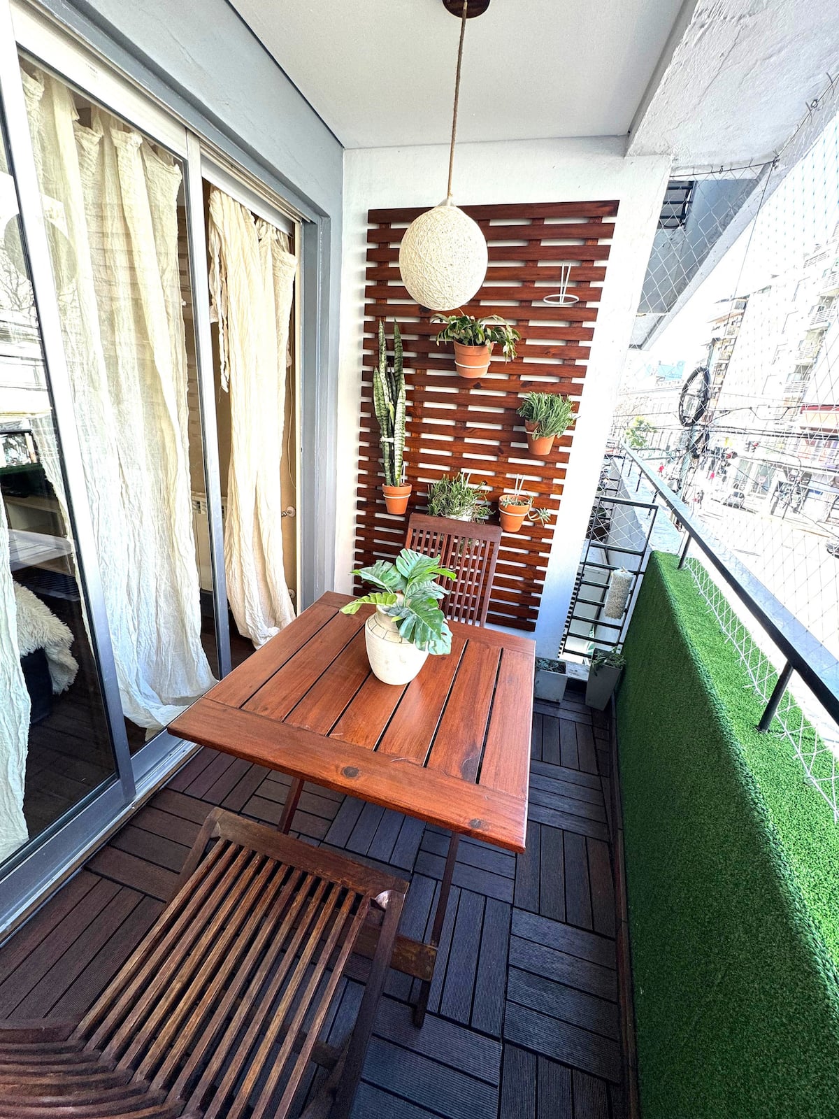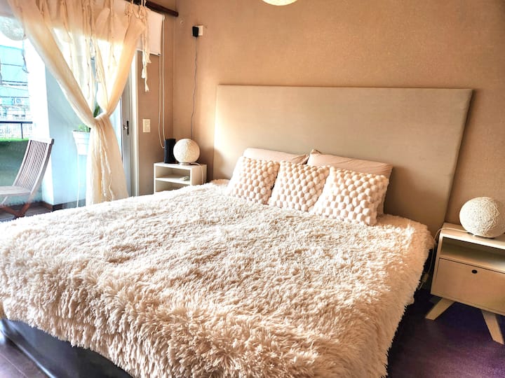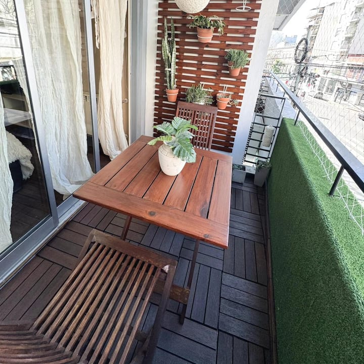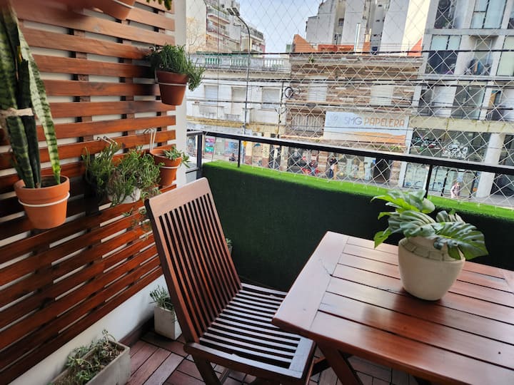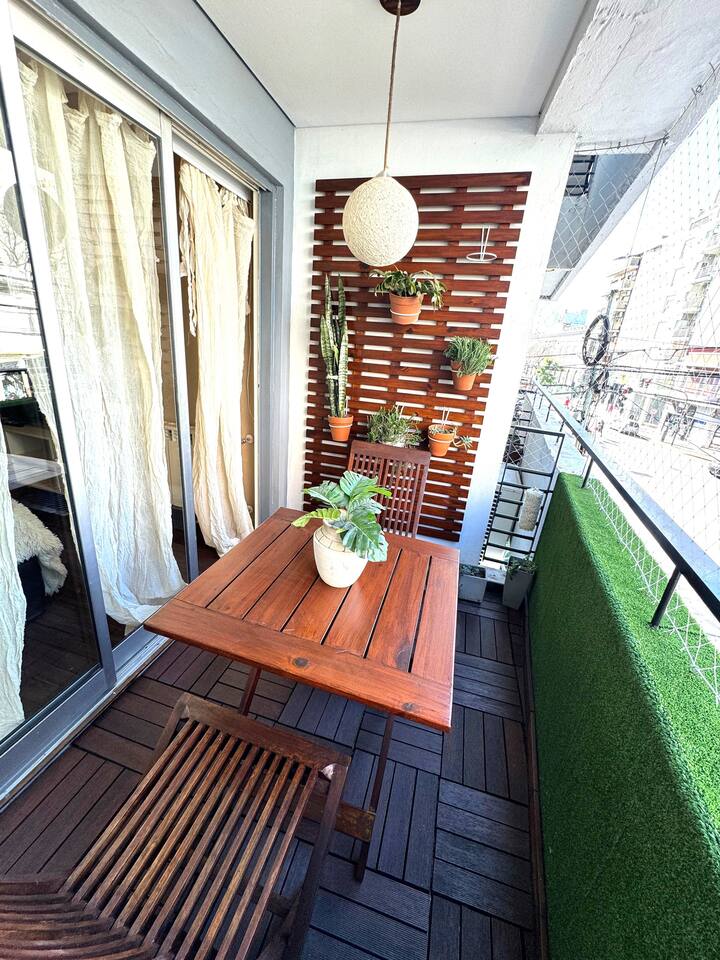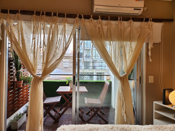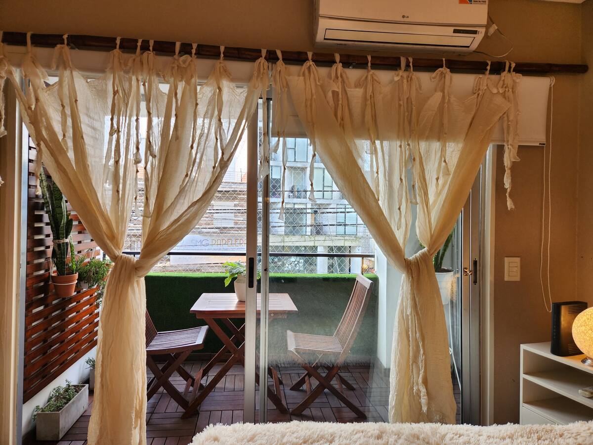 Apartamento tipo kitnet em Colegiales, com capacidade para 4 pessoas. Fica na Av. Federico Lacroze, com grande varanda. A luz é paga separadamente, após 28 dias de estadia.