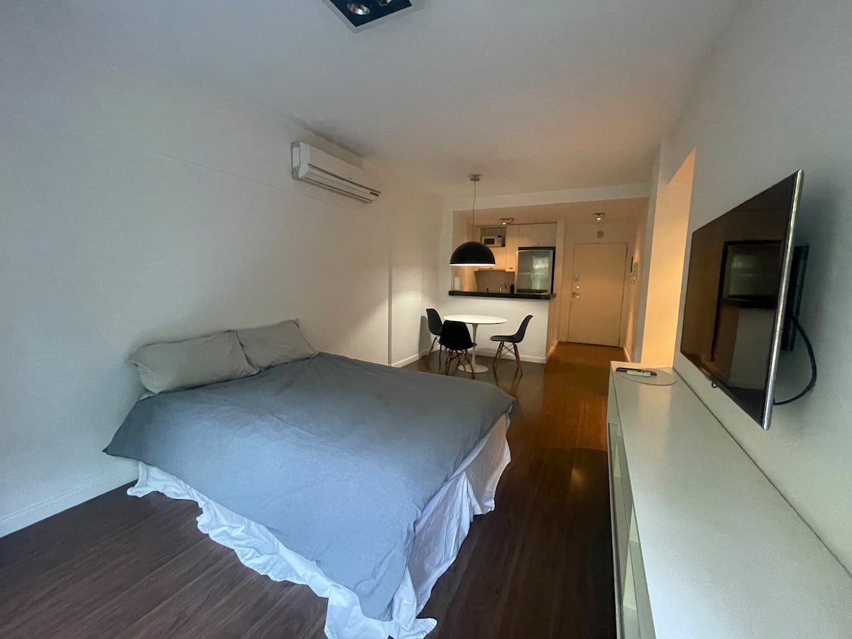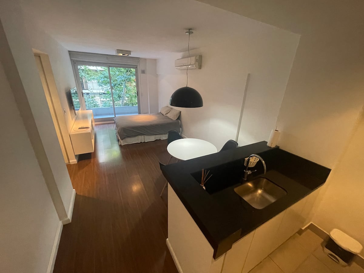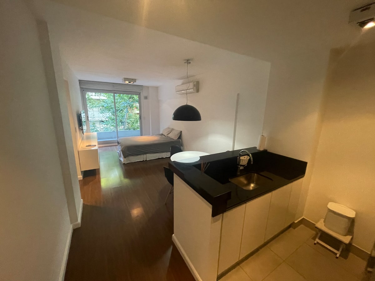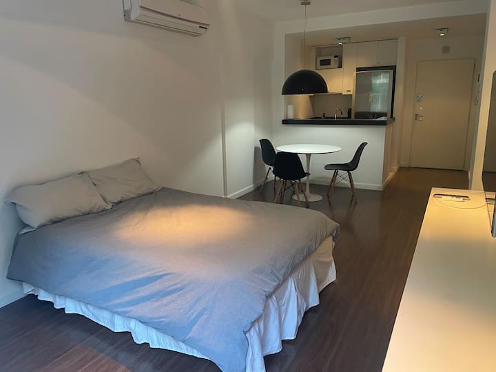 Kitnet em prédio novo em Colegiales. Fica a 1 quarteirão de uma estação de ônibus e a 2 quarteirões do metrô. Acomoda até 2 hóspedes em sofá-cama de casal.