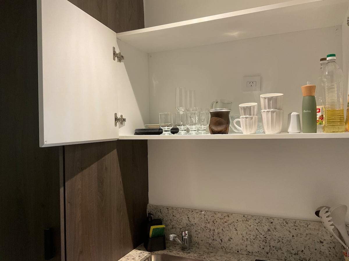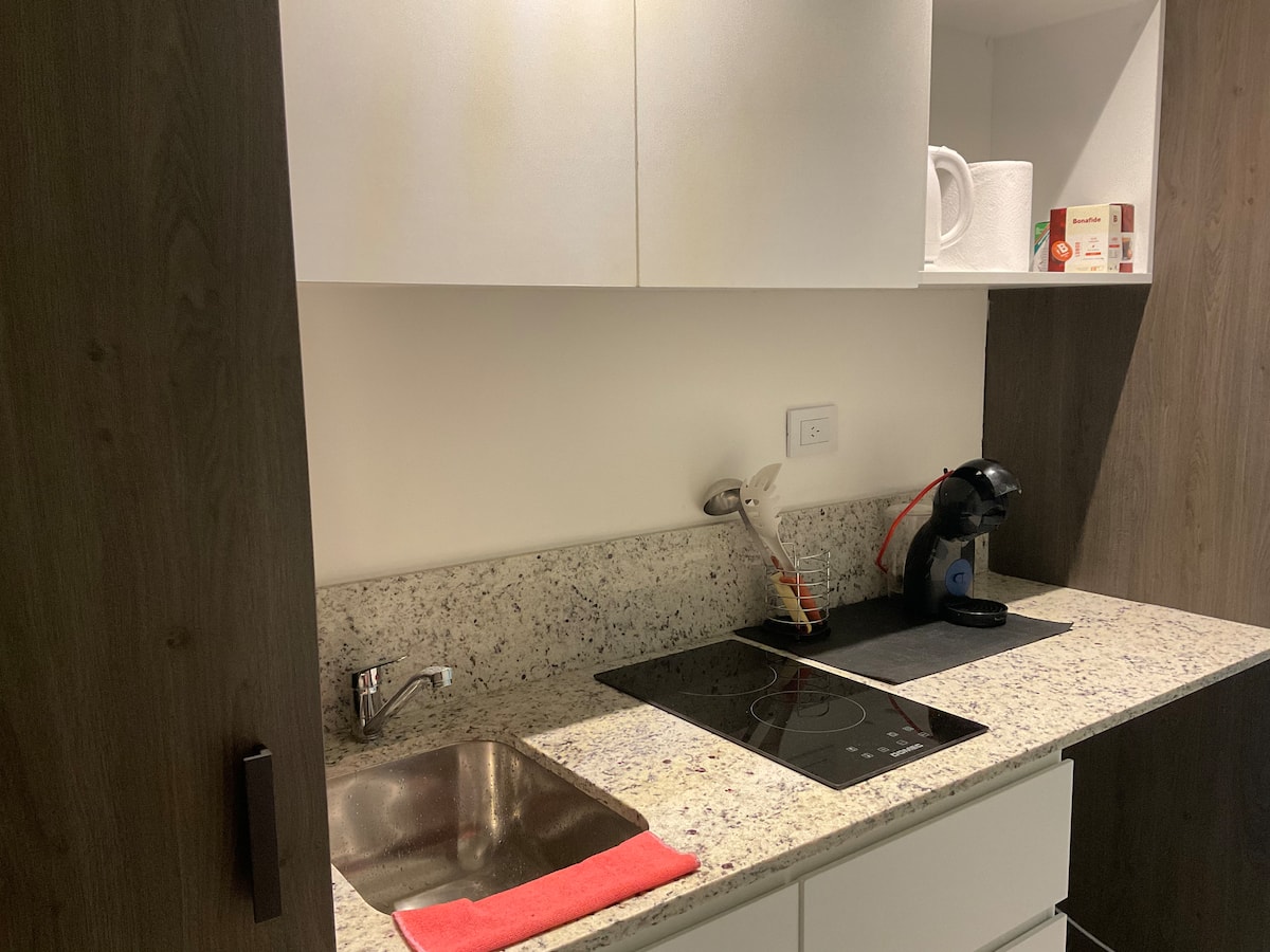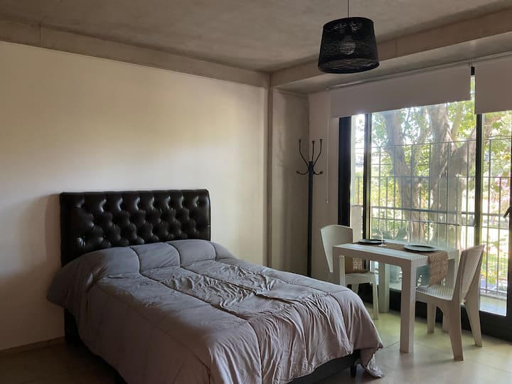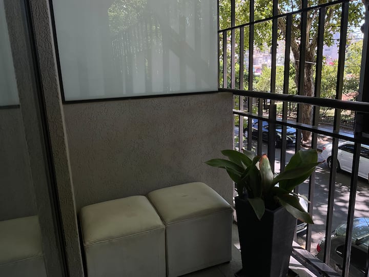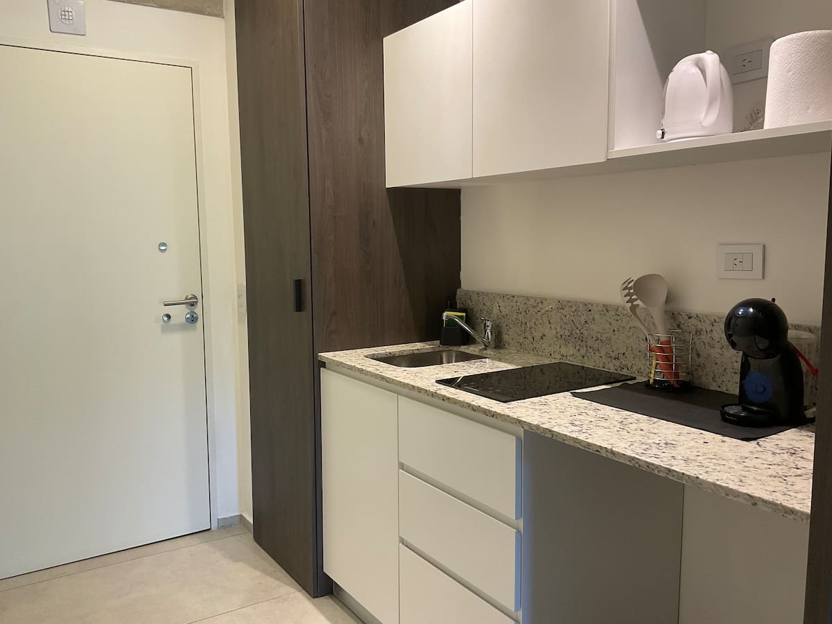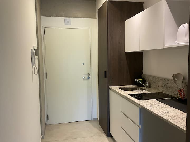 Kitnet em Colegiales, com área dedicada a cama, espaço de armazenamento e mesa para refeições ou trabalho. Possui varanda, voltada para área verde, com luz natural. Está totalmente equipada para estadias de curta e longa duração.