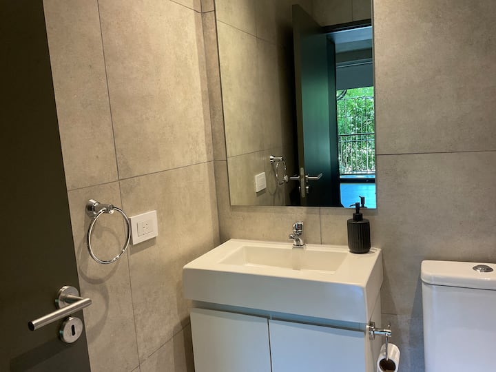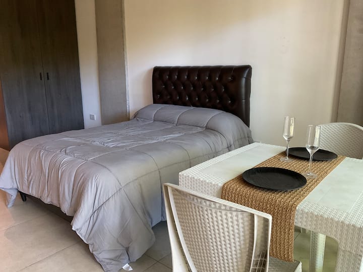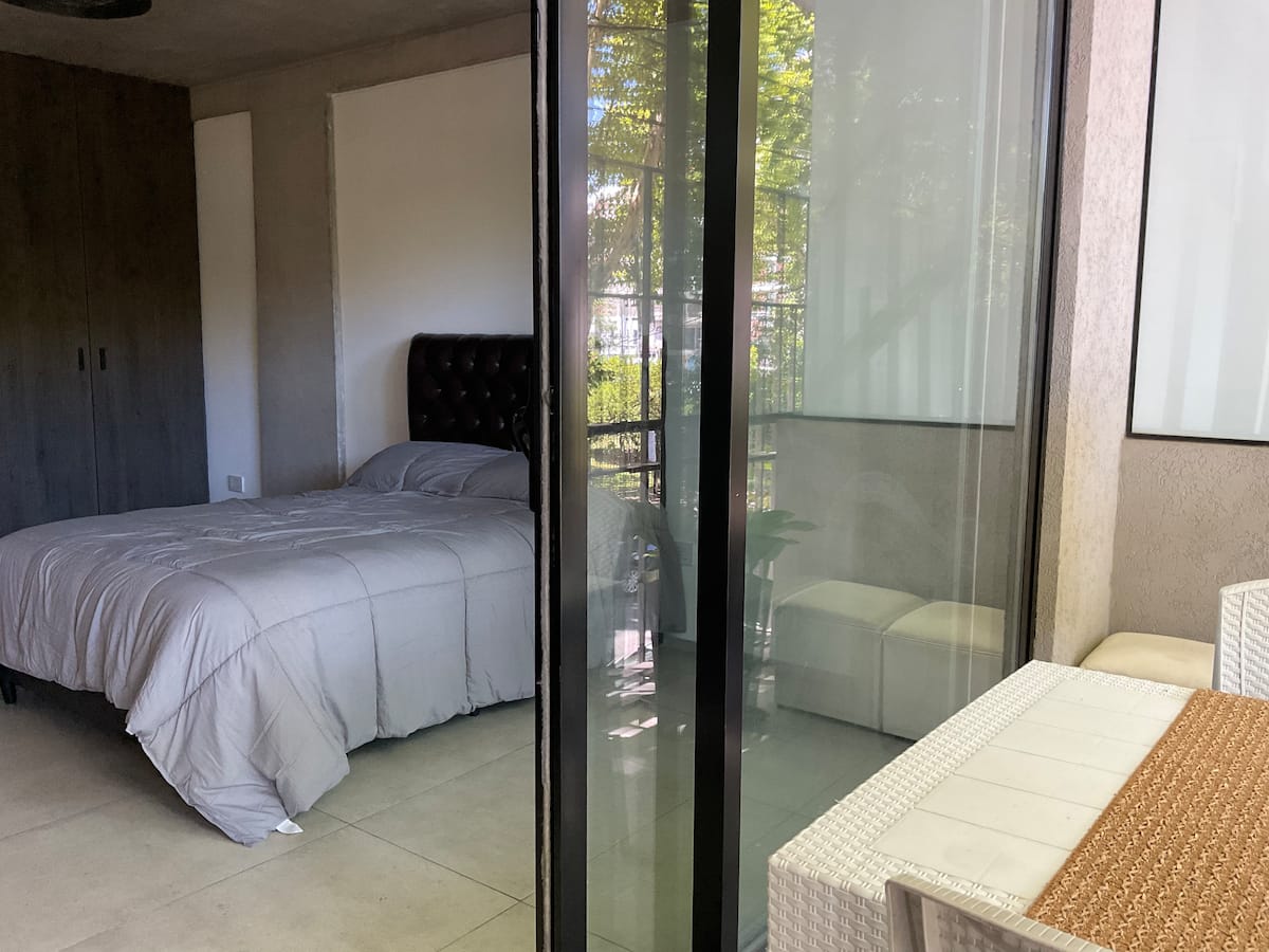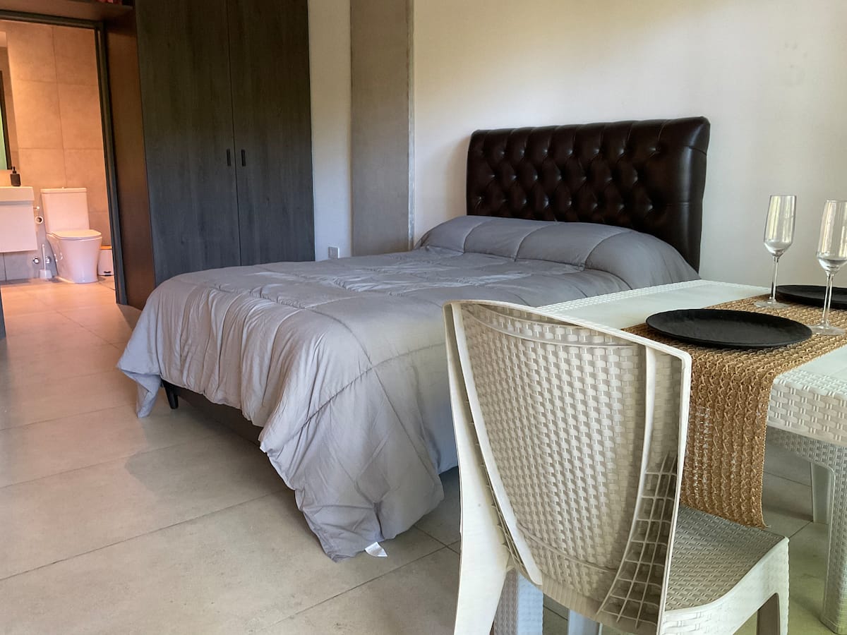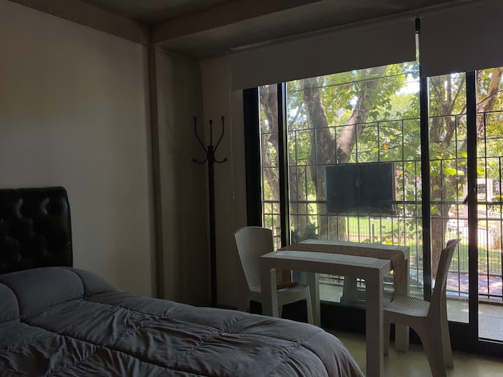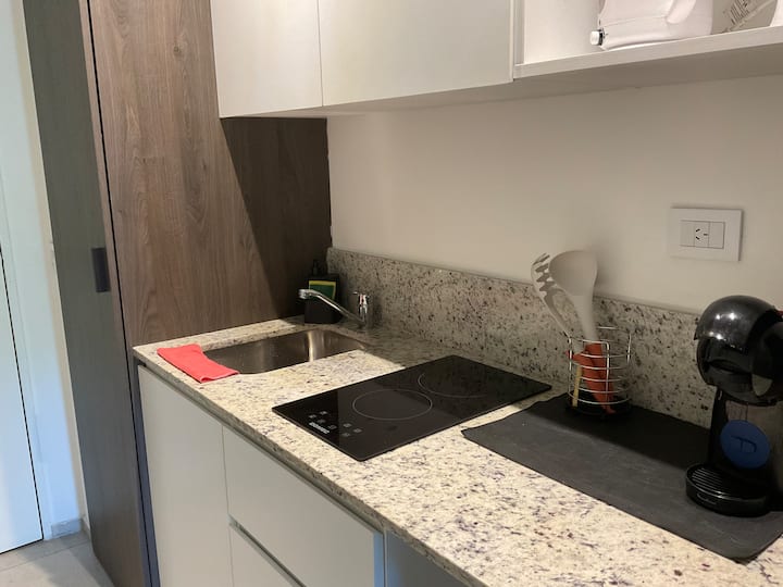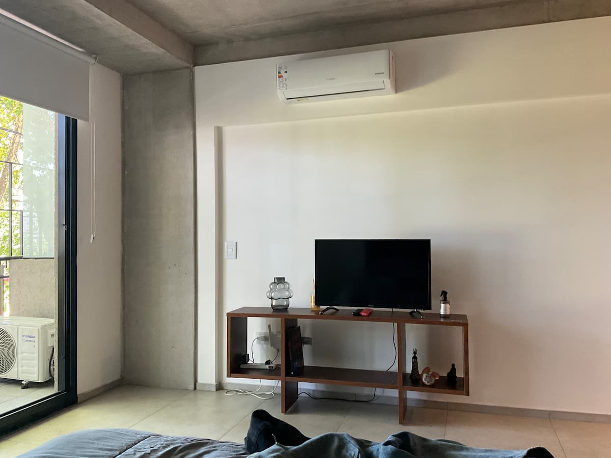 Kitnet em Colegiales, com área dedicada a cama, espaço de armazenamento e mesa para refeições ou trabalho. Possui varanda, voltada para área verde, com luz natural. Está totalmente equipada para estadias de curta e longa duração.