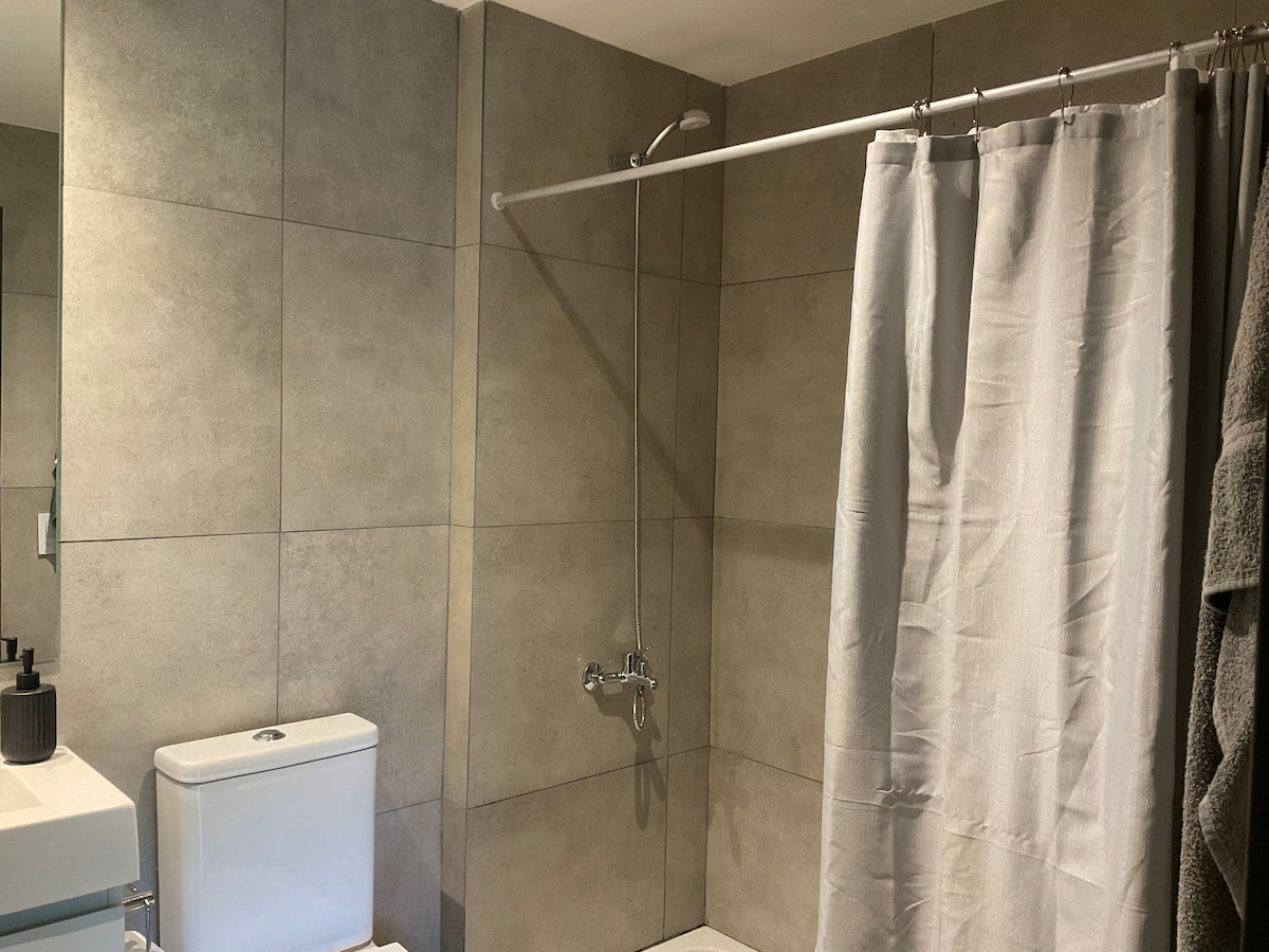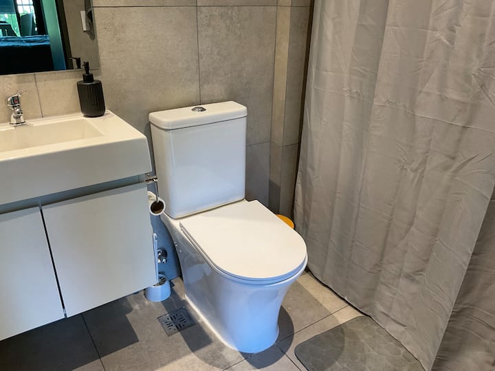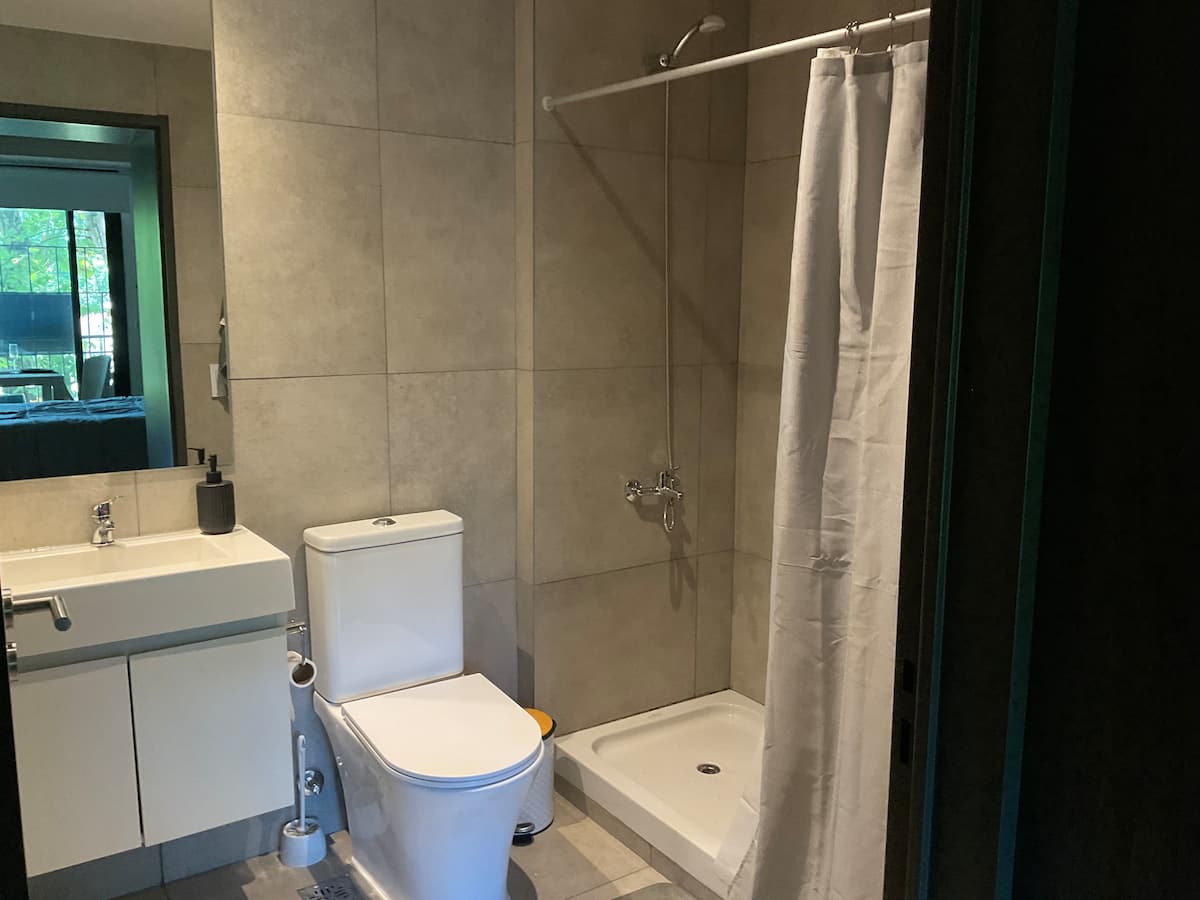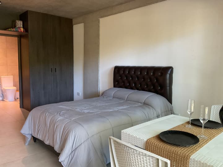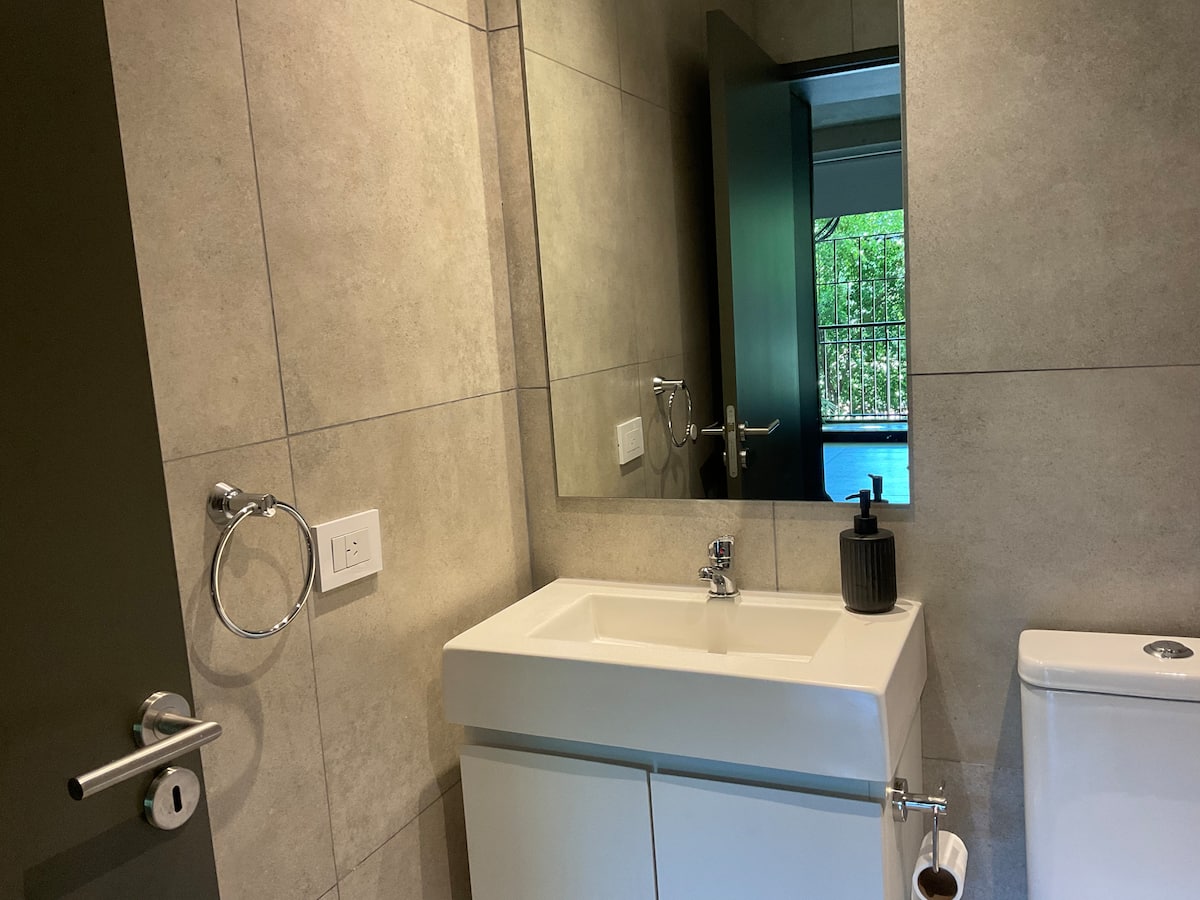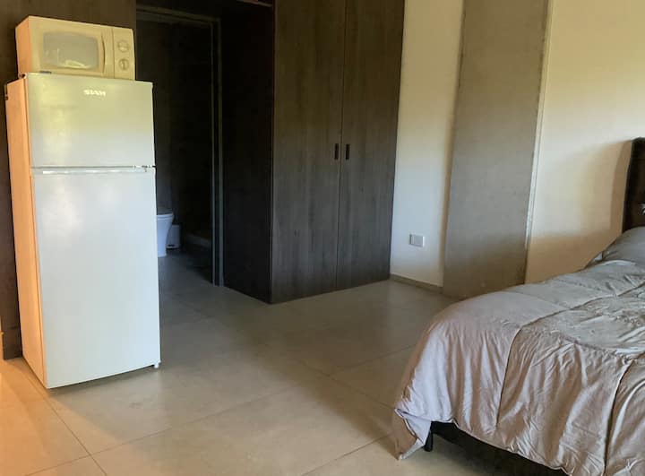 Kitnet em Colegiales, com área dedicada a cama, espaço de armazenamento e mesa para refeições ou trabalho. Possui varanda, voltada para área verde, com luz natural. Está totalmente equipada para estadias de curta e longa duração.