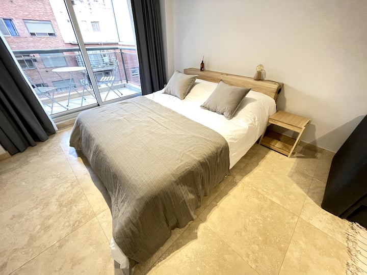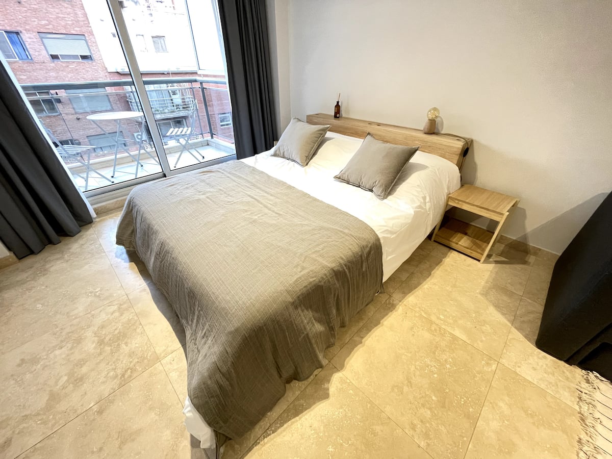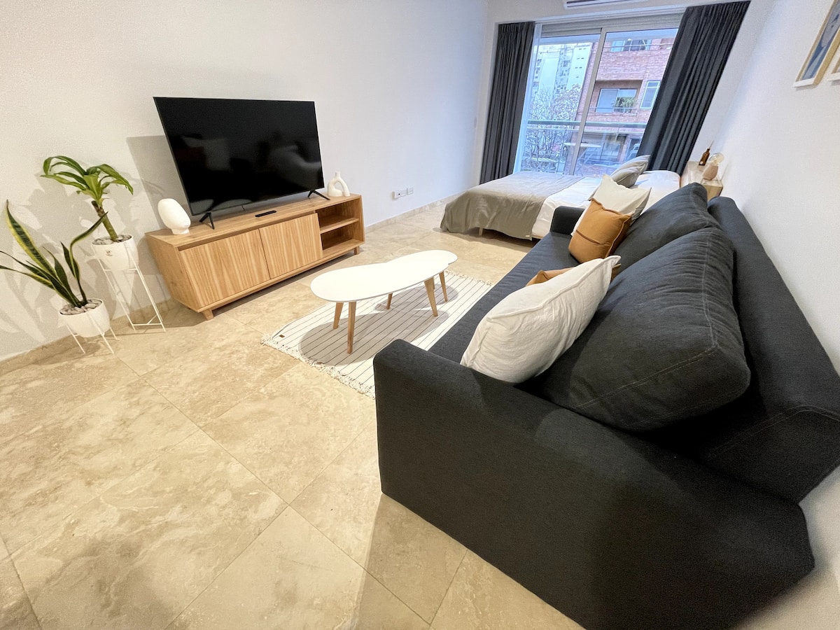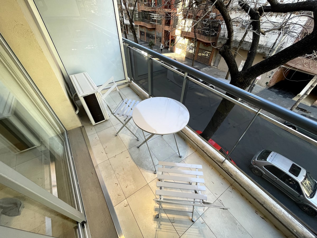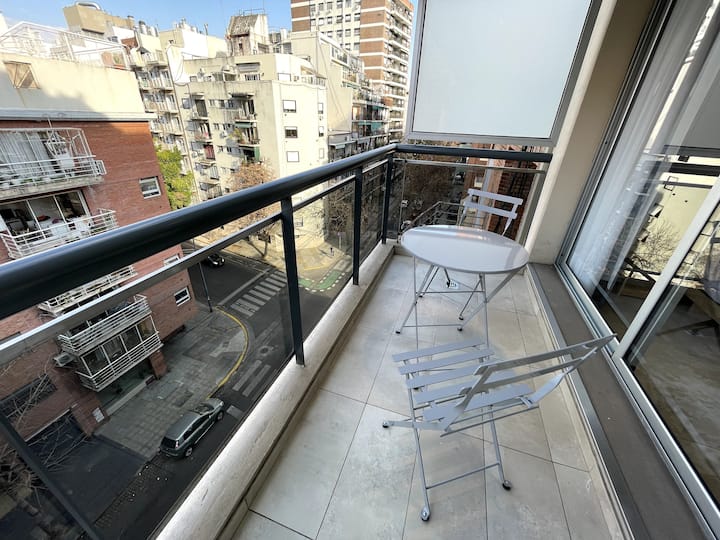 Apartamento tipo kitnet/monoambiente de 40 m² em Colegiales. Unidade mobiliada e equipada para até 4 hóspedes, com cama queen e sofá-cama para 2 hóspedes. Possui ar-condicionado frio-quente, TV Smart e mesa de jantar, além de utensílios de cozinha completos. A acomodação é facilmente acessível por diferentes pontos de Buenos Aires por carro, ônibus ou metrô.